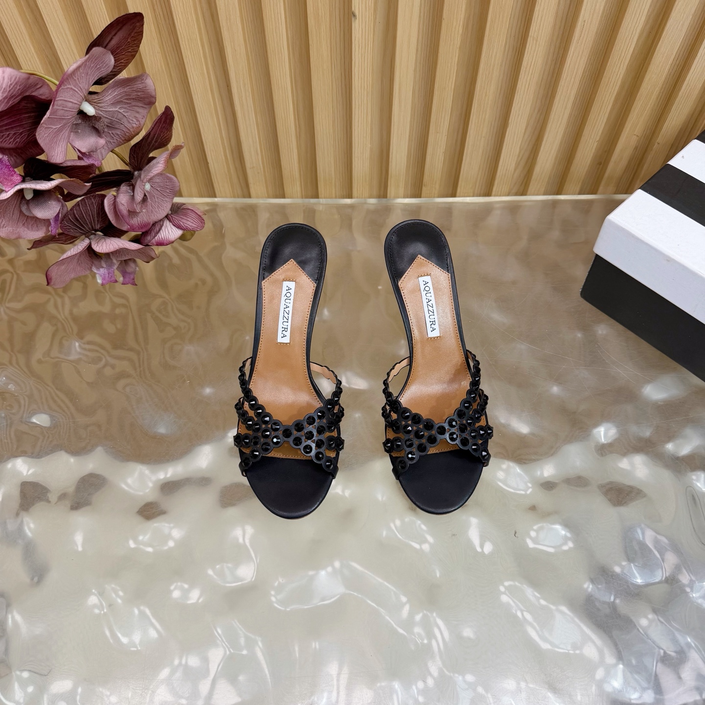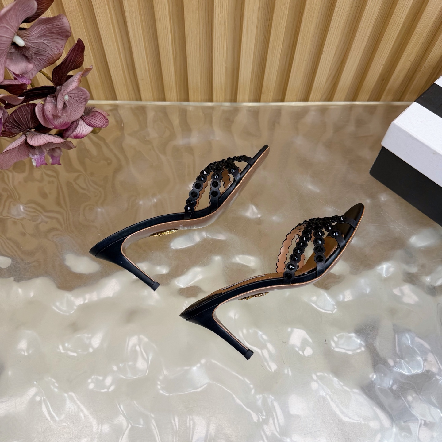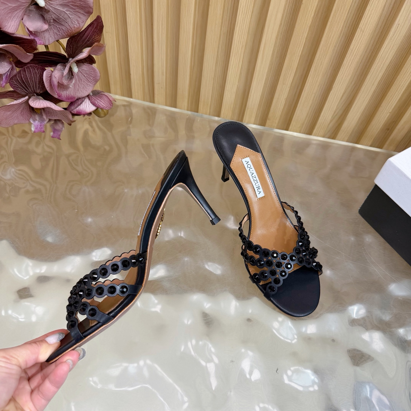 這款鞋子是AAAAA 1:1 質量(非常棒). 使用了和原版一模一樣的材料. 商標部分也保持了和Aquazzura一樣. 圖片拍攝是實物鞋子拍攝, 您所收到的實物保證和我們圖片一模一樣.