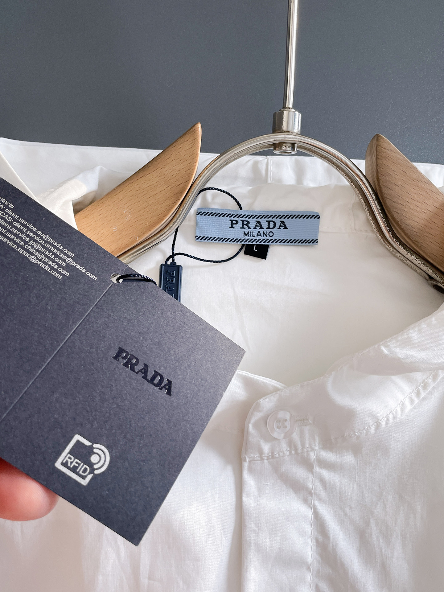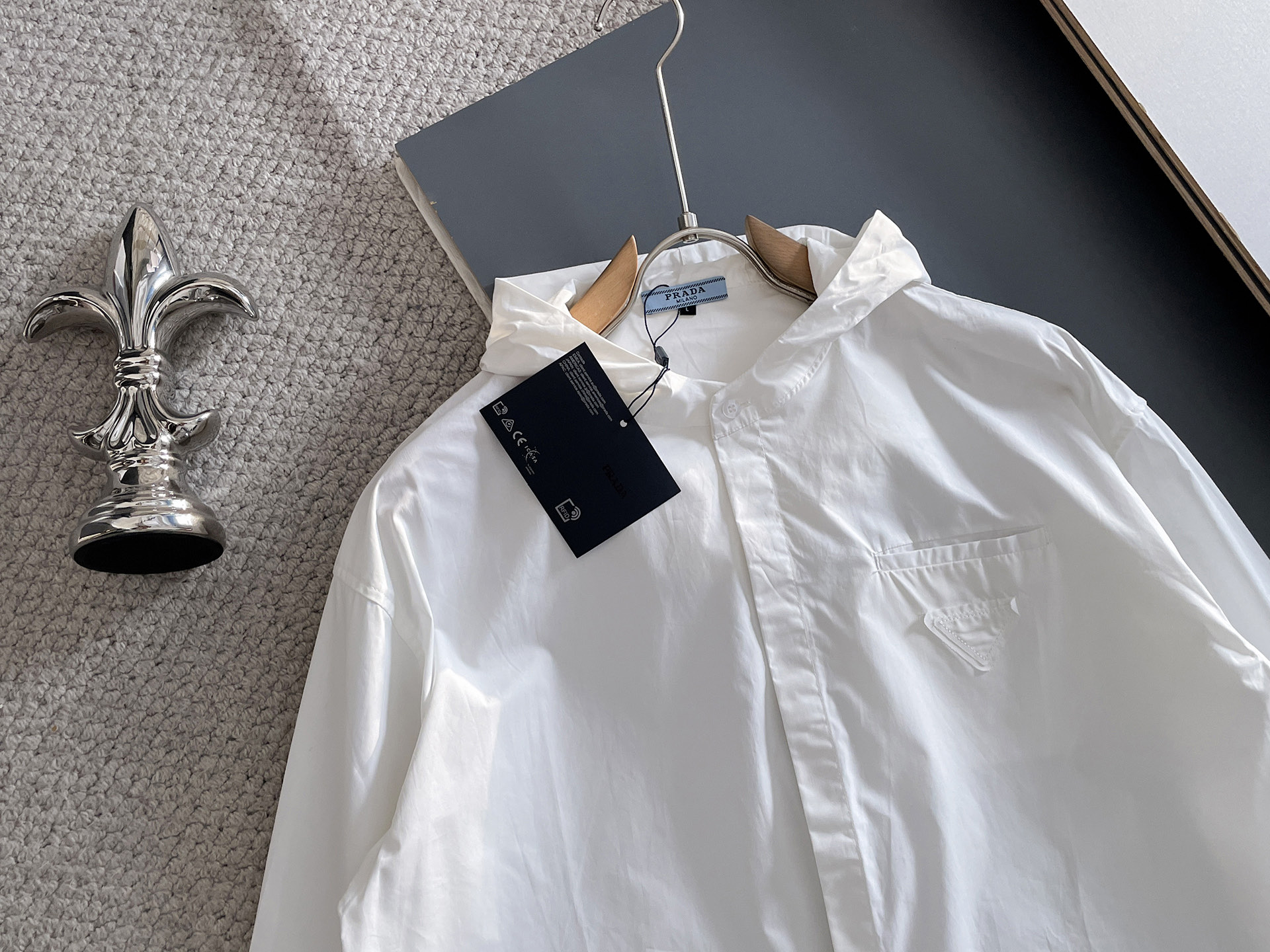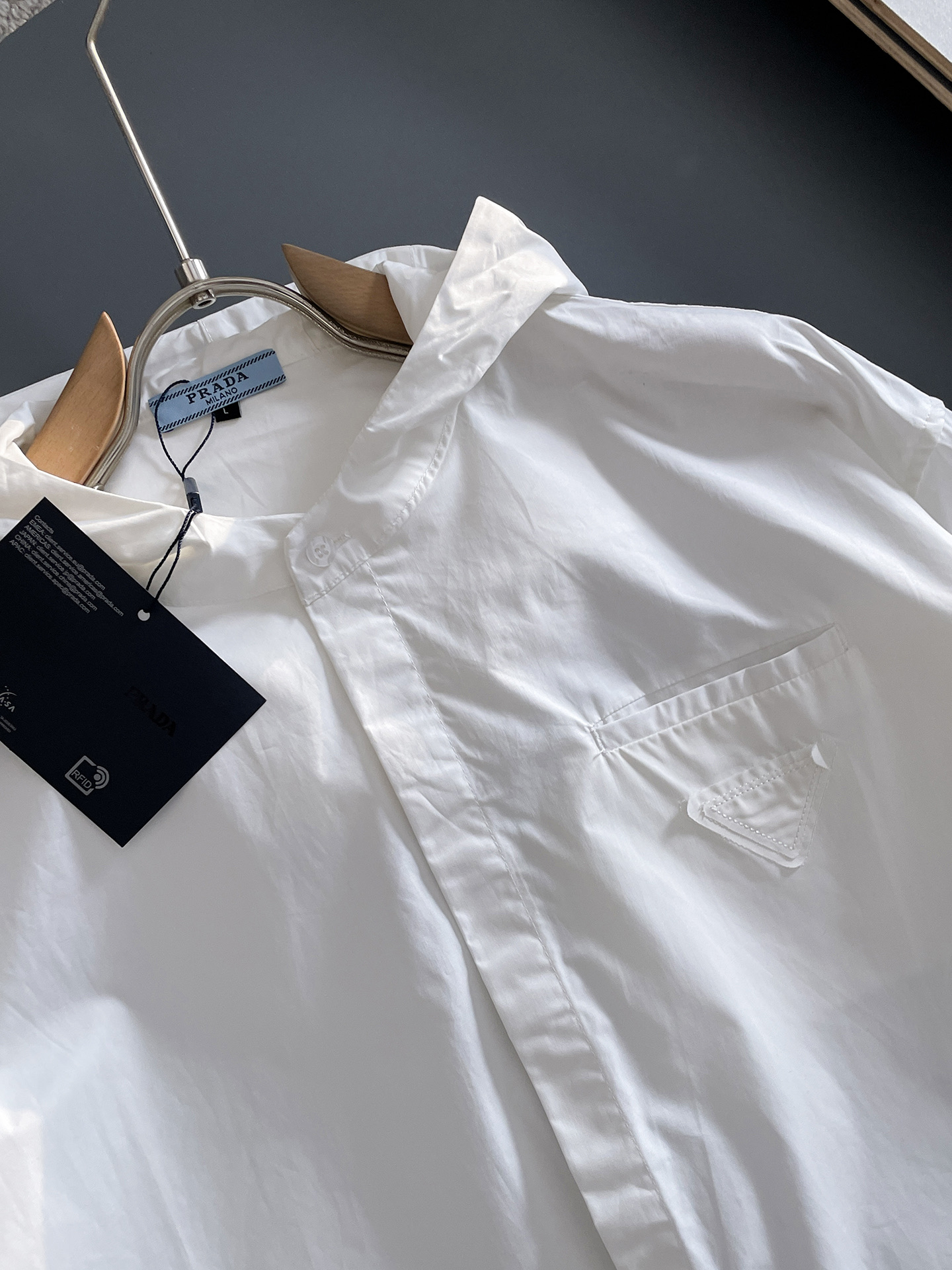 這款衣服是AAAAA 1:1 質量(非常棒). 使用了和原版一模一樣的材料. 商標部分也保持了和普拉達/Prada一樣. 圖片拍攝是實物衣服拍攝, 您所收到的實物保證和我們圖片一模一樣.
