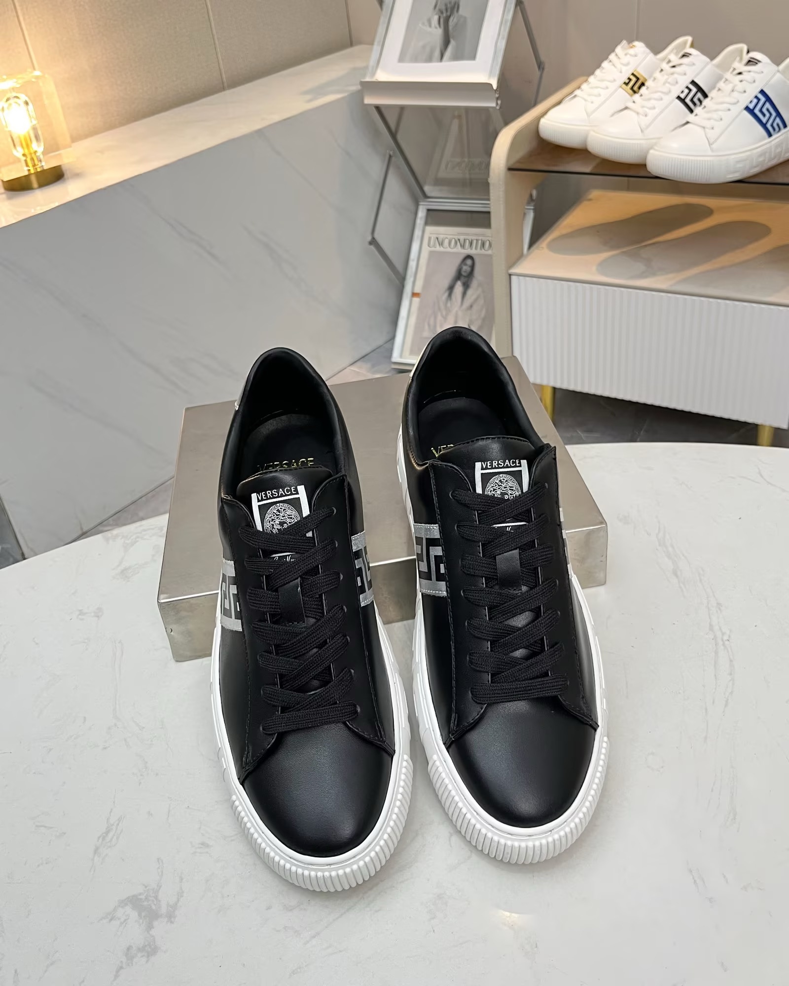 這款鞋子是AAAAA 1:1 質量(非常棒). 使用了和原版一模一樣的材料. 商標部分也保持了和范思哲/Versace一樣. 圖片拍攝是實物鞋子拍攝, 您所收到的實物保證和我們圖片一模一樣.