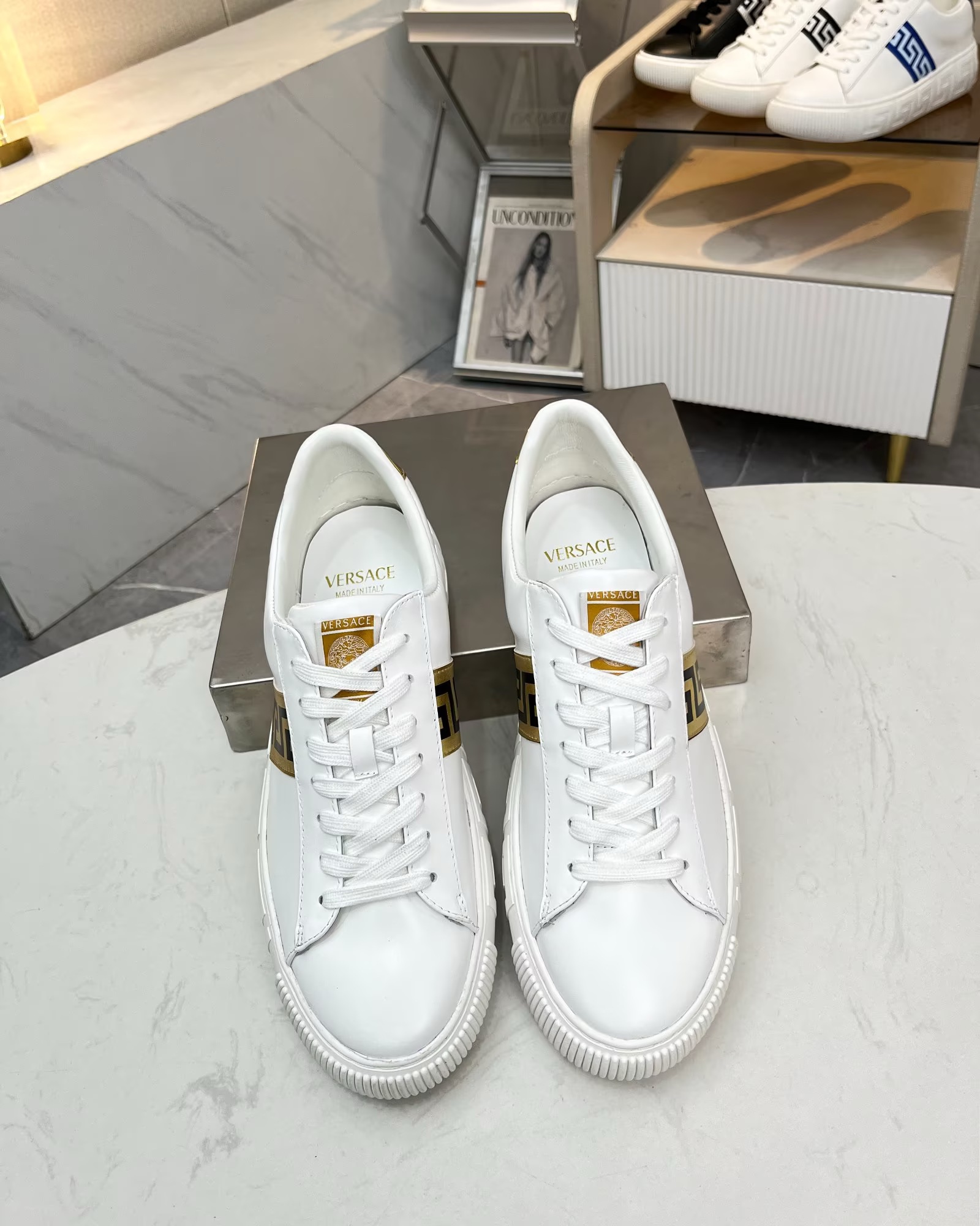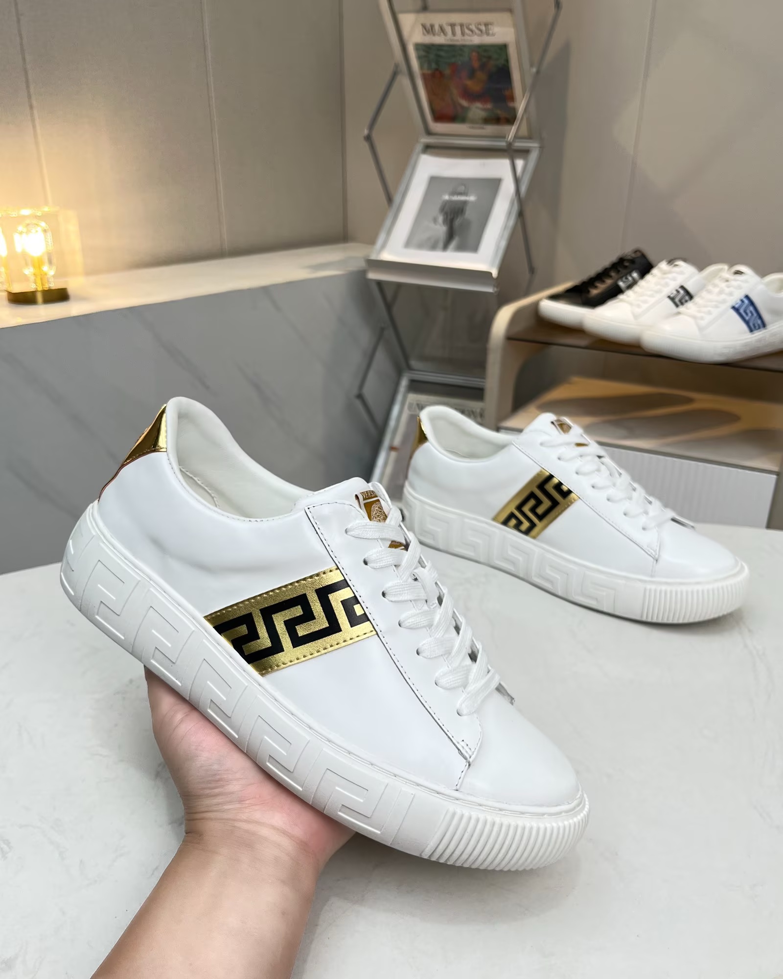 這款鞋子是AAAAA 1:1 質量(非常棒). 使用了和原版一模一樣的材料. 商標部分也保持了和范思哲/Versace一樣. 圖片拍攝是實物鞋子拍攝, 您所收到的實物保證和我們圖片一模一樣.