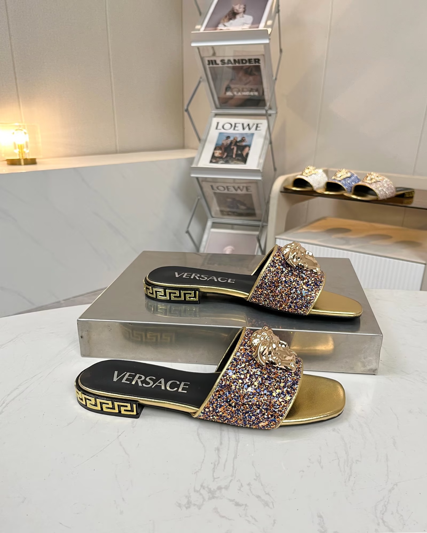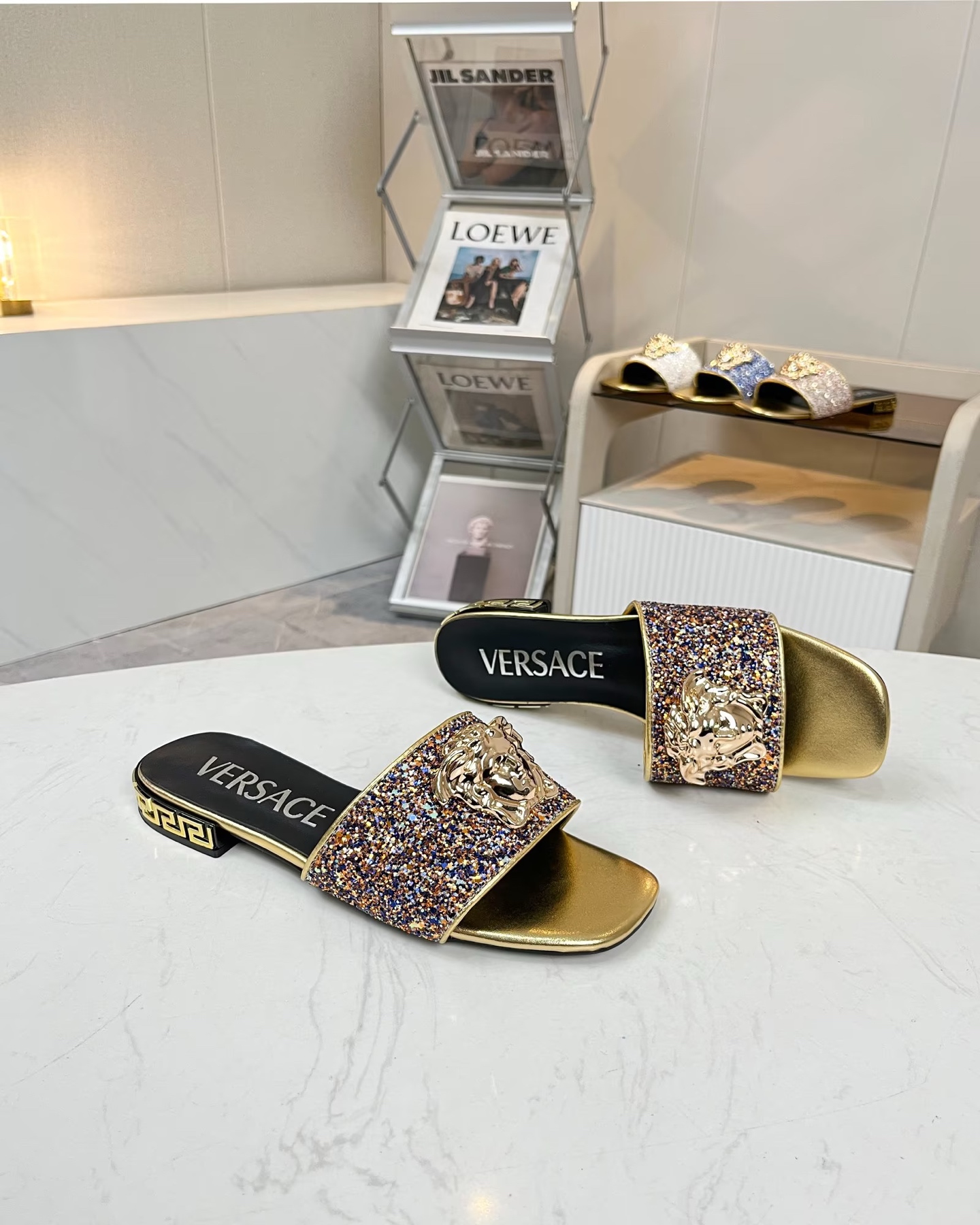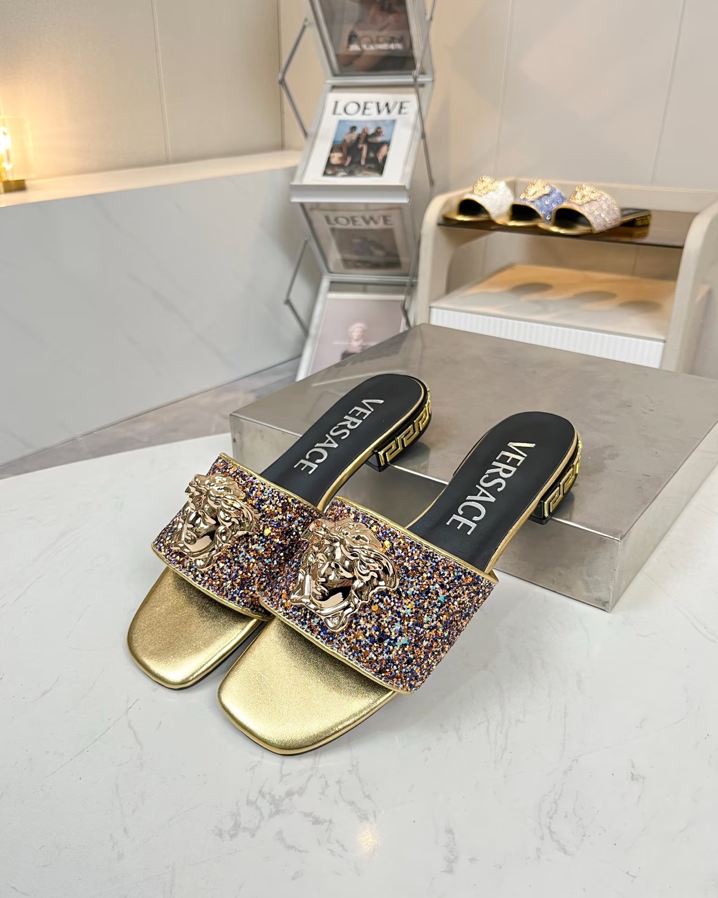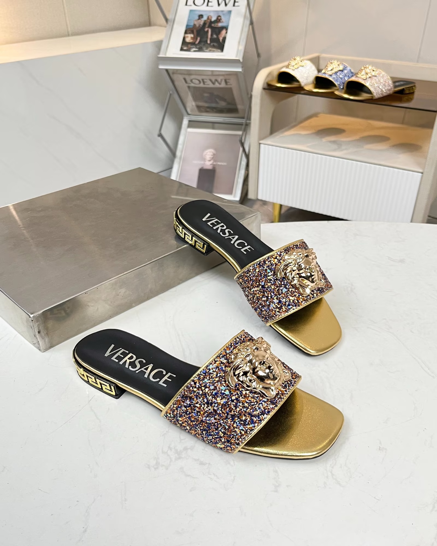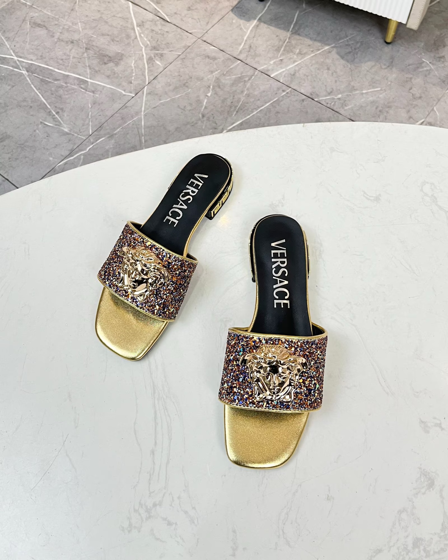 這款鞋子是AAAAA 1:1 質量(非常棒). 使用了和原版一模一樣的材料. 商標部分也保持了和范思哲/Versace一樣. 圖片拍攝是實物鞋子拍攝, 您所收到的實物保證和我們圖片一模一樣.