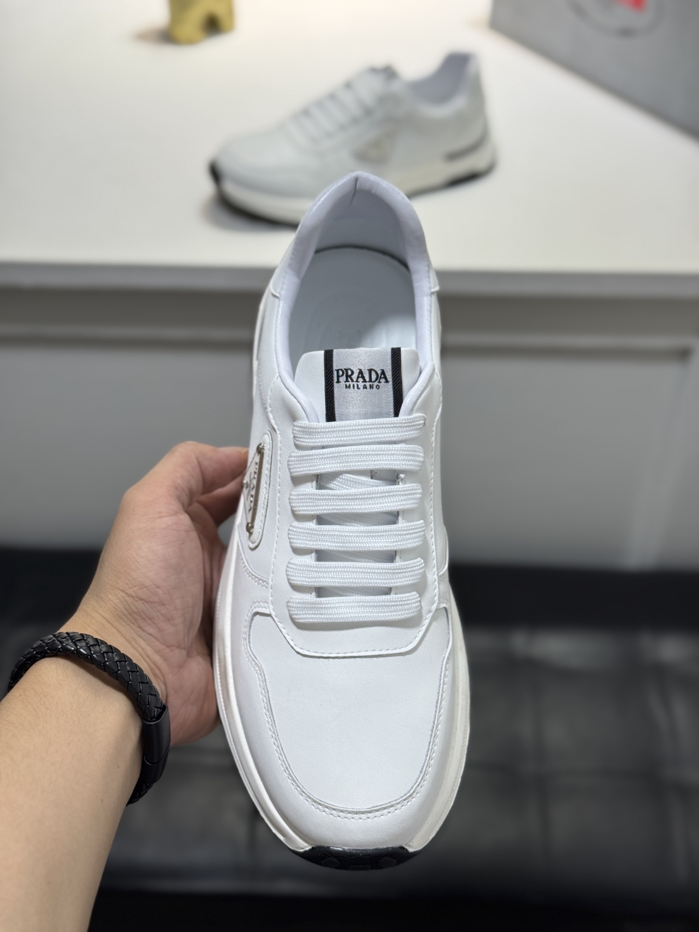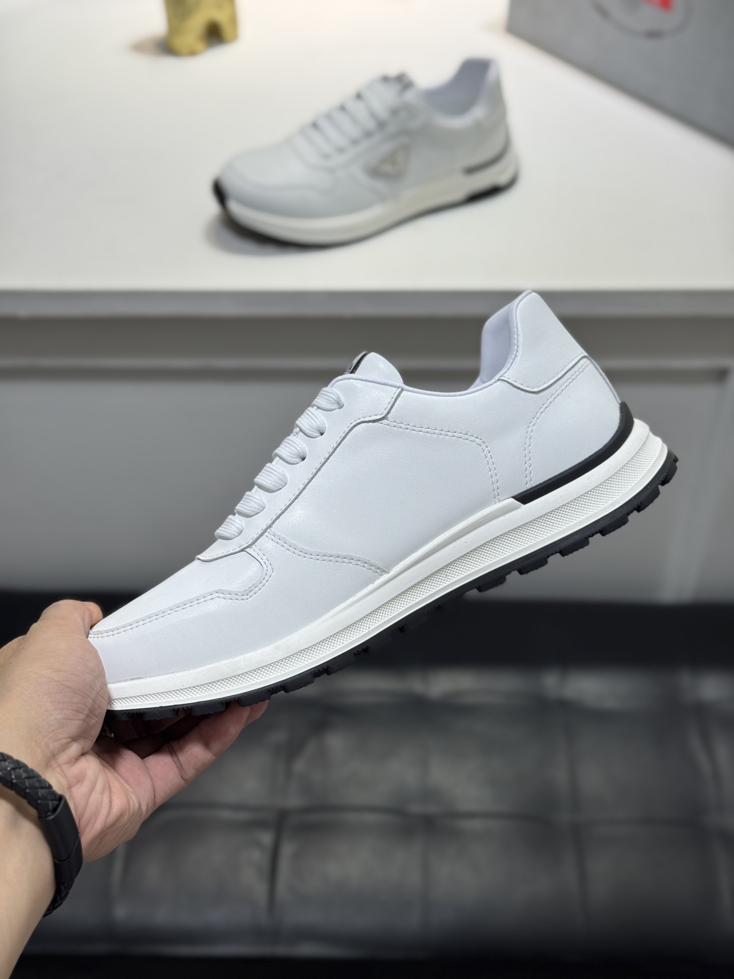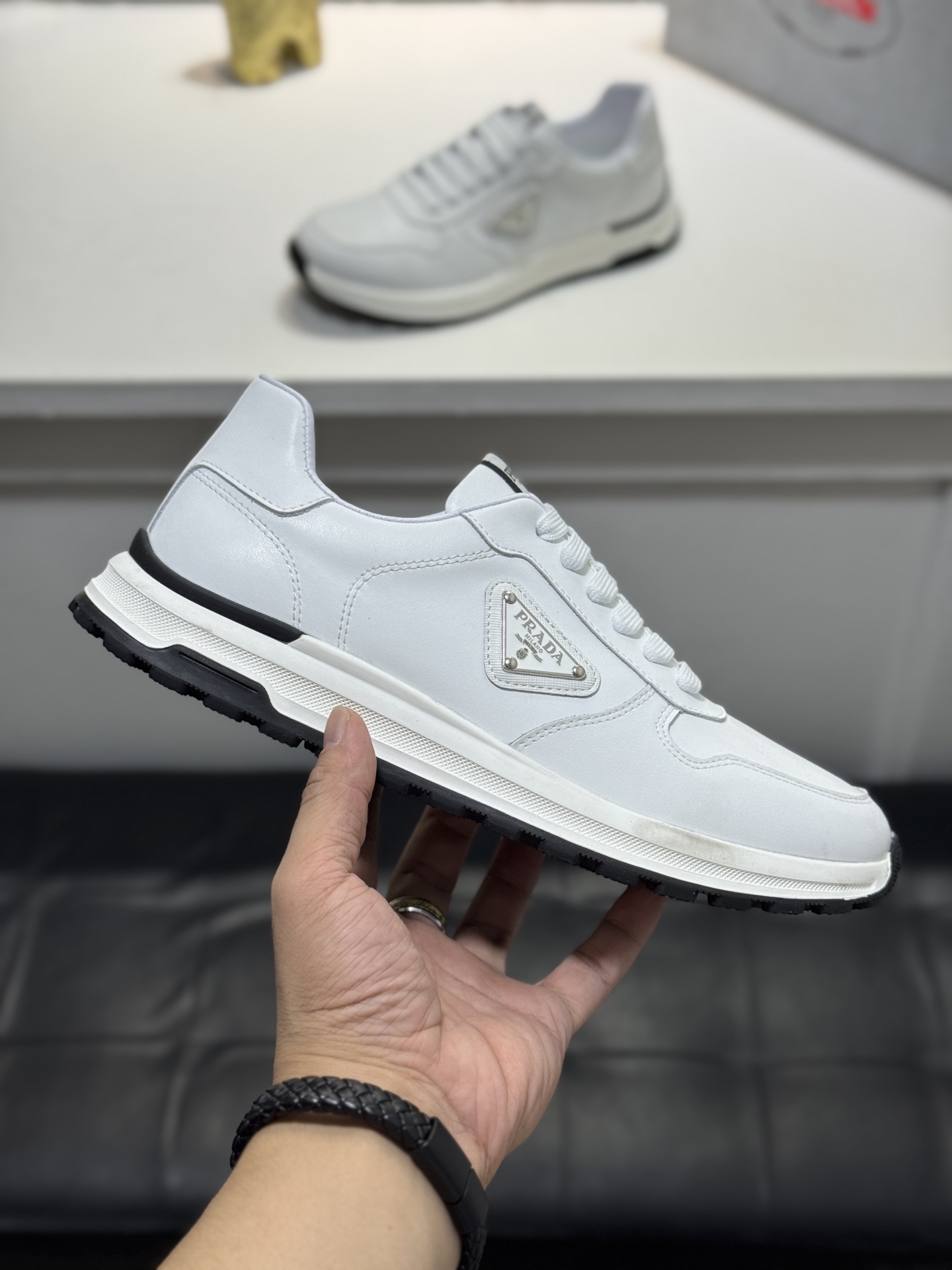這款鞋子是AAAAA 1:1 質量(非常棒). 使用了和原版一模一樣的材料. 商標部分也保持了和普拉達/Prada一樣. 圖片拍攝是實物鞋子拍攝, 您所收到的實物保證和我們圖片一模一樣.