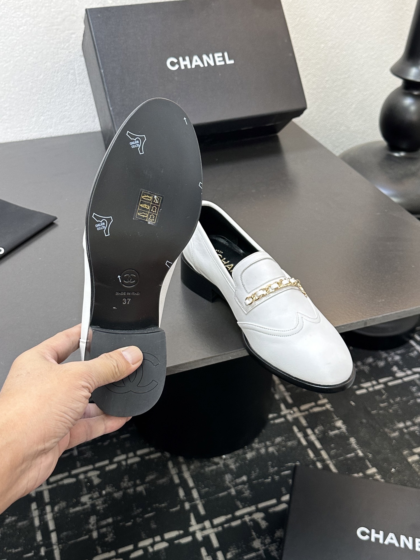 這款鞋子是AAAAA 1:1 質量(非常棒). 使用了和原版一模一樣的材料. 商標部分也保持了和香奈兒/Chanel一樣. 圖片拍攝是實物鞋子拍攝, 您所收到的實物保證和我們圖片一模一樣.