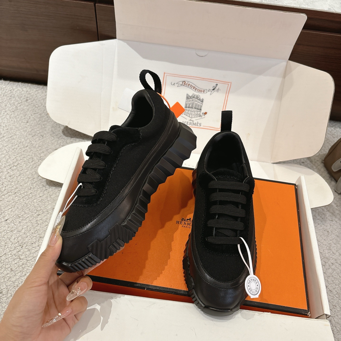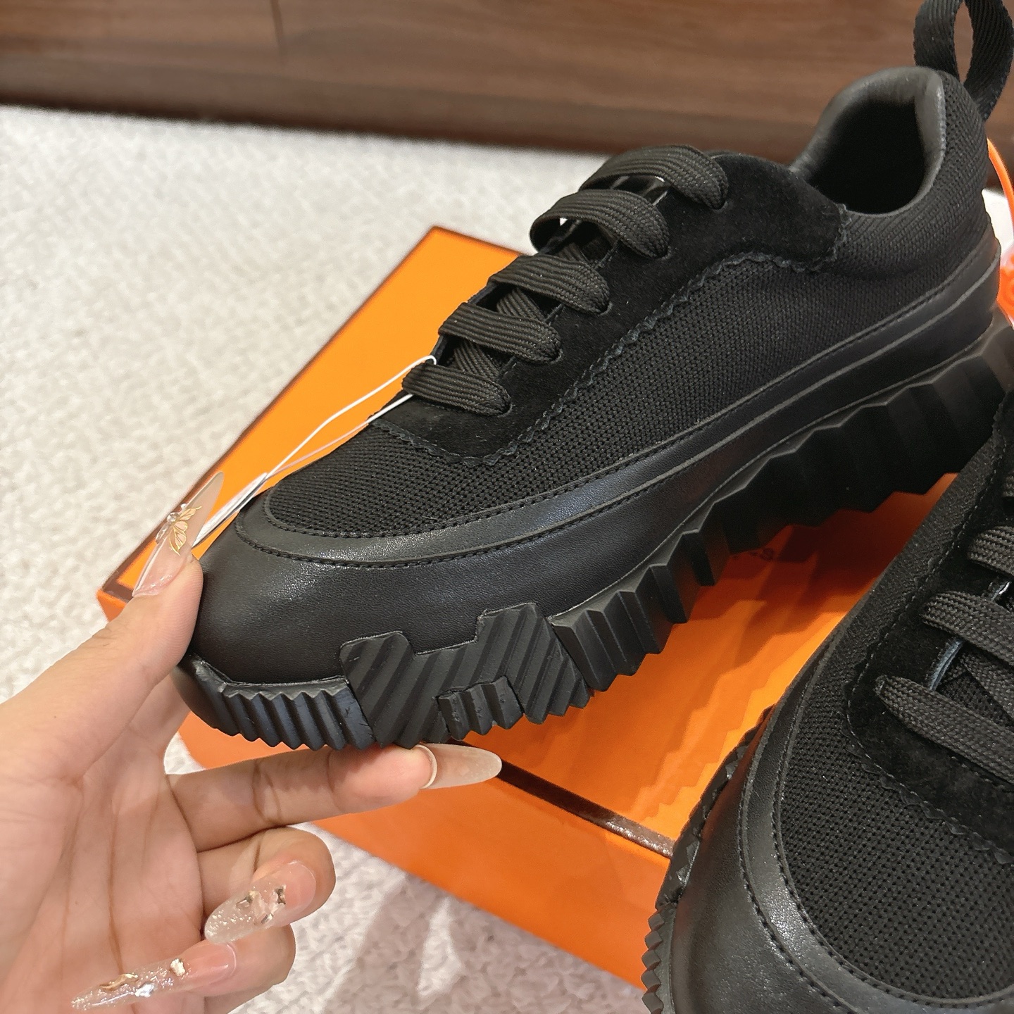 這款鞋子是AAAAA 1:1 質量(非常棒). 使用了和原版一模一樣的材料. 商標部分也保持了和愛馬仕/Hermes一樣. 圖片拍攝是實物鞋子拍攝, 您所收到的實物保證和我們圖片一模一樣.
