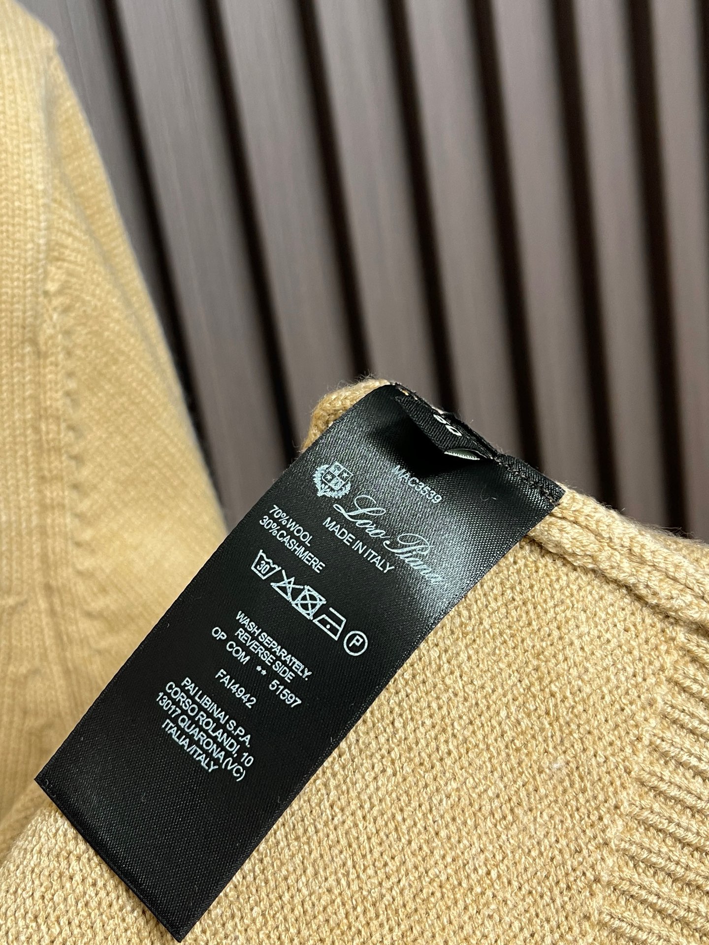 這款衣服是AAAAA 1:1 質量(非常棒). 使用了和原版一模一樣的材料. 商標部分也保持了和Loro Piana一樣. 圖片拍攝是實物衣服拍攝, 您所收到的實物保證和我們圖片一模一樣.