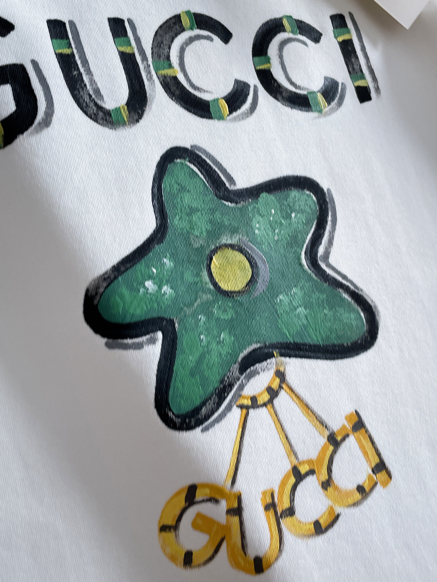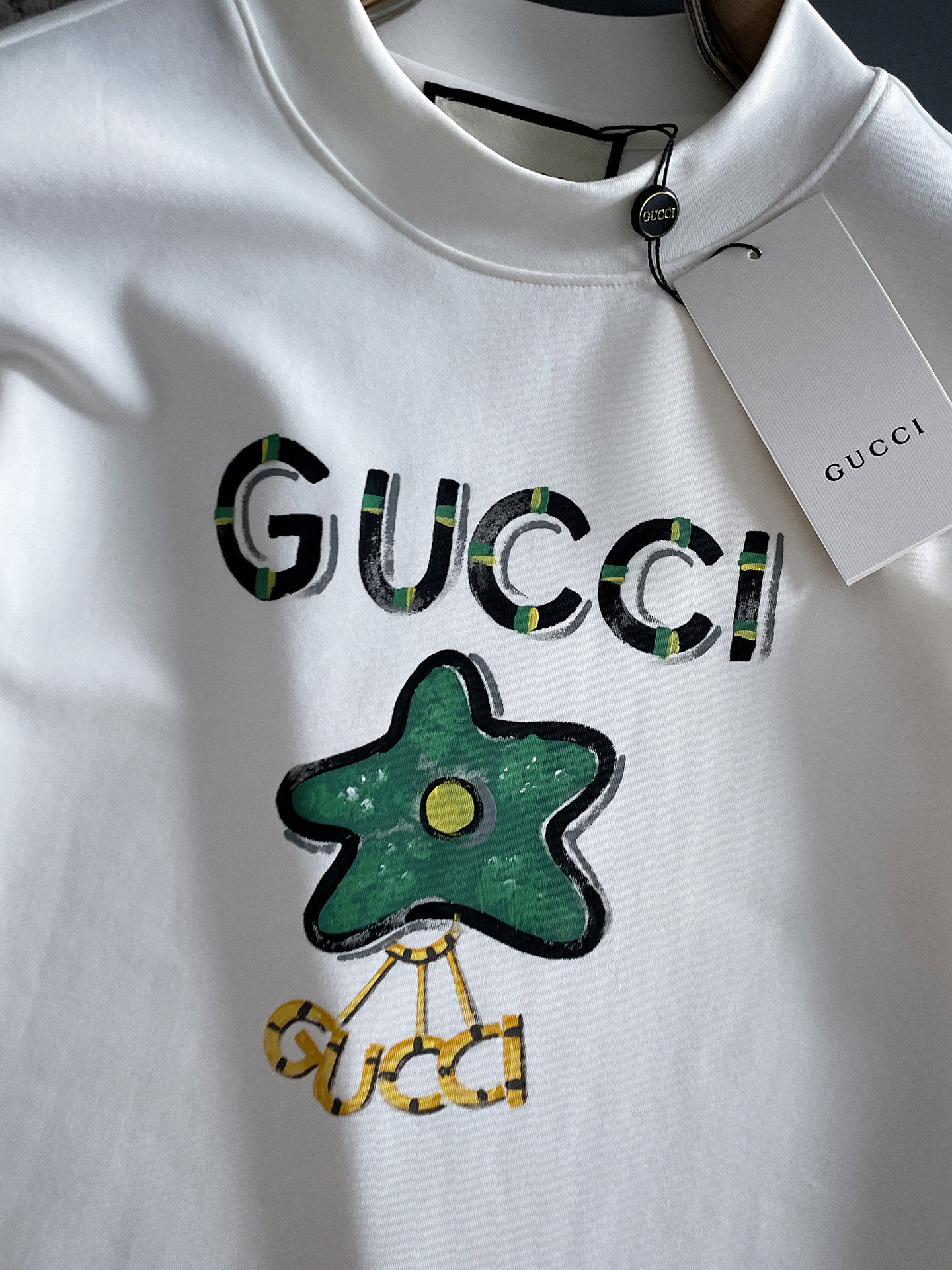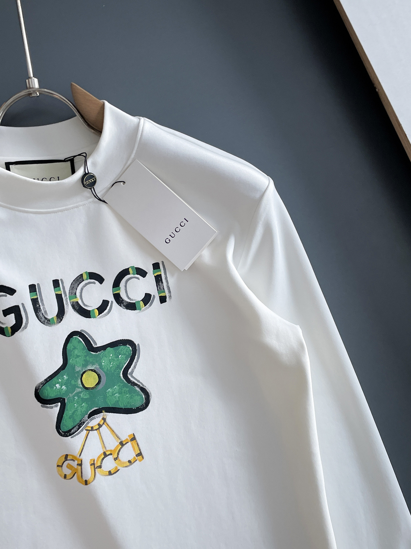 這款衣服是AAAAA 1:1 質量(非常棒). 使用了和原版一模一樣的材料. 商標部分也保持了和古奇/Gucci一樣. 圖片拍攝是實物衣服拍攝, 您所收到的實物保證和我們圖片一模一樣.