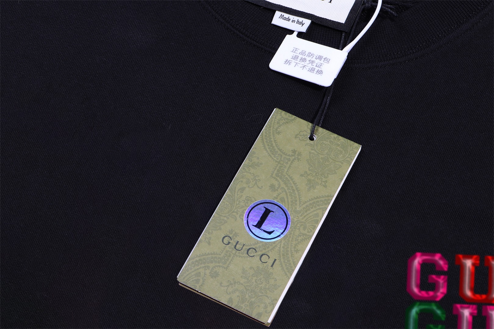 這款衣服是AAAAA 1:1 質量(非常棒). 使用了和原版一模一樣的材料. 商標部分也保持了和古奇/Gucci一樣. 圖片拍攝是實物衣服拍攝, 您所收到的實物保證和我們圖片一模一樣.