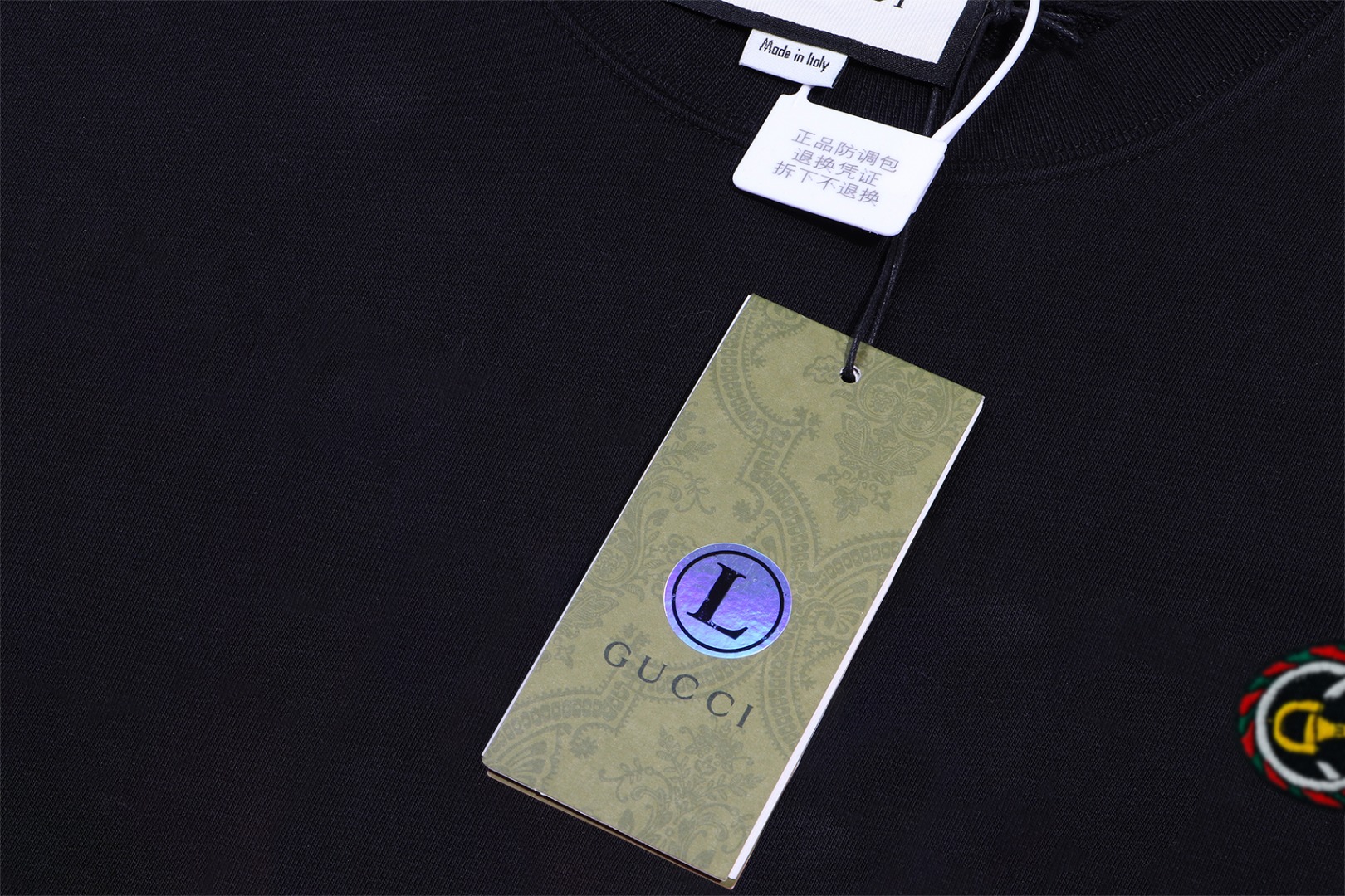 這款衣服是AAAAA 1:1 質量(非常棒). 使用了和原版一模一樣的材料. 商標部分也保持了和古奇/Gucci一樣. 圖片拍攝是實物衣服拍攝, 您所收到的實物保證和我們圖片一模一樣.
