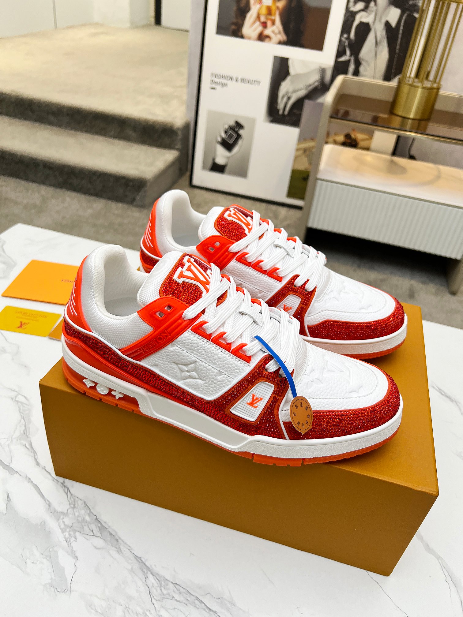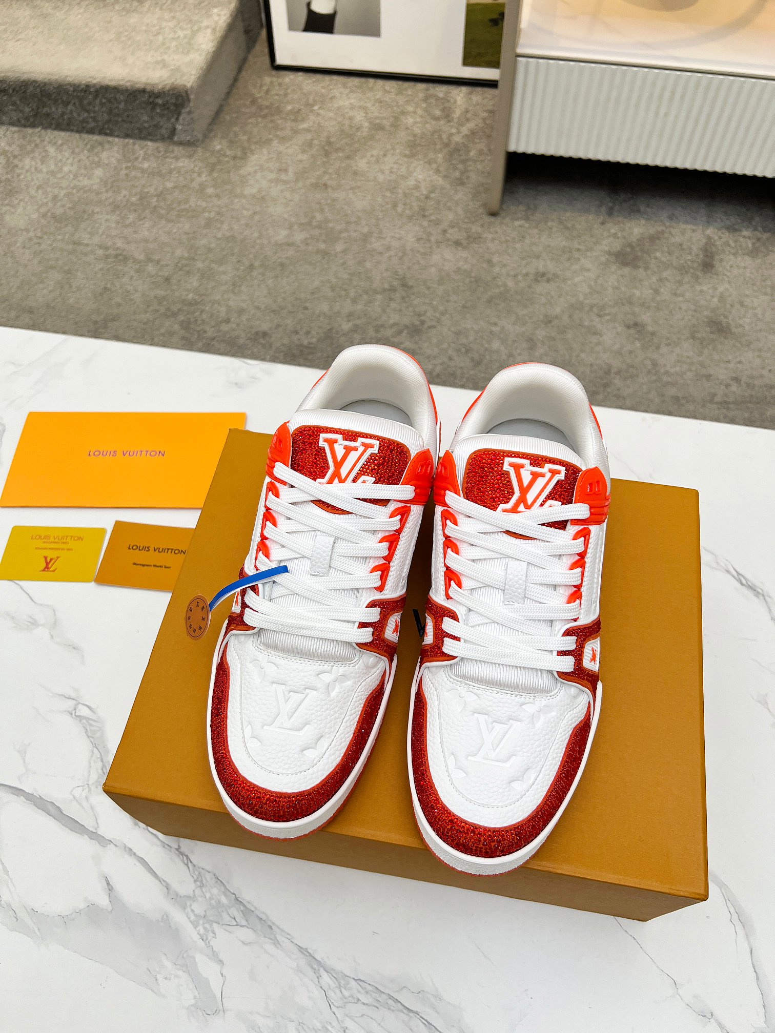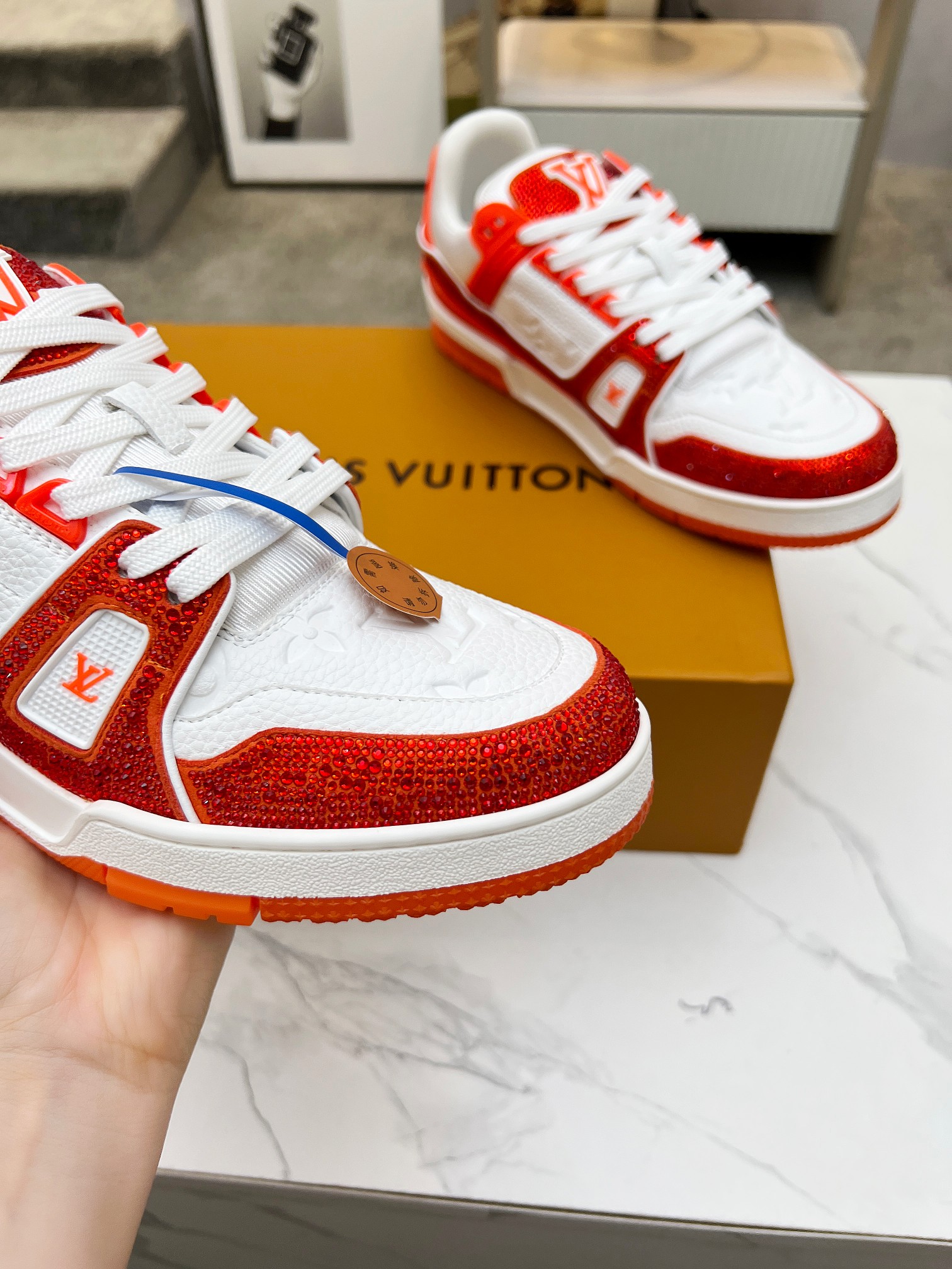 這款鞋子是AAAAA 1:1 質量(非常棒). 使用了和原版一模一樣的材料. 商標部分也保持了和路易威登/Louis Vuitton一樣. 圖片拍攝是實物鞋子拍攝, 您所收到的實物保證和我們圖片一模一樣.