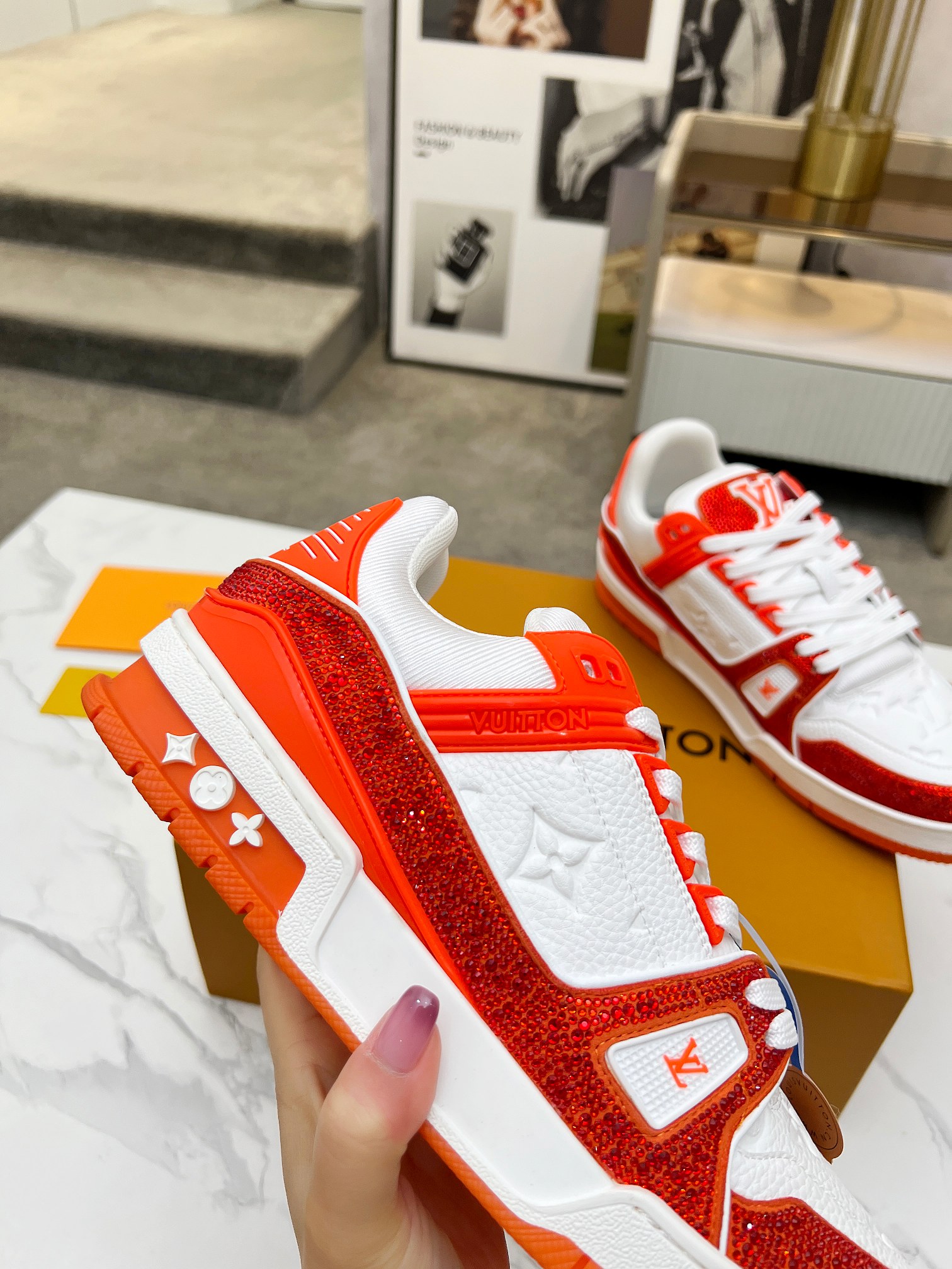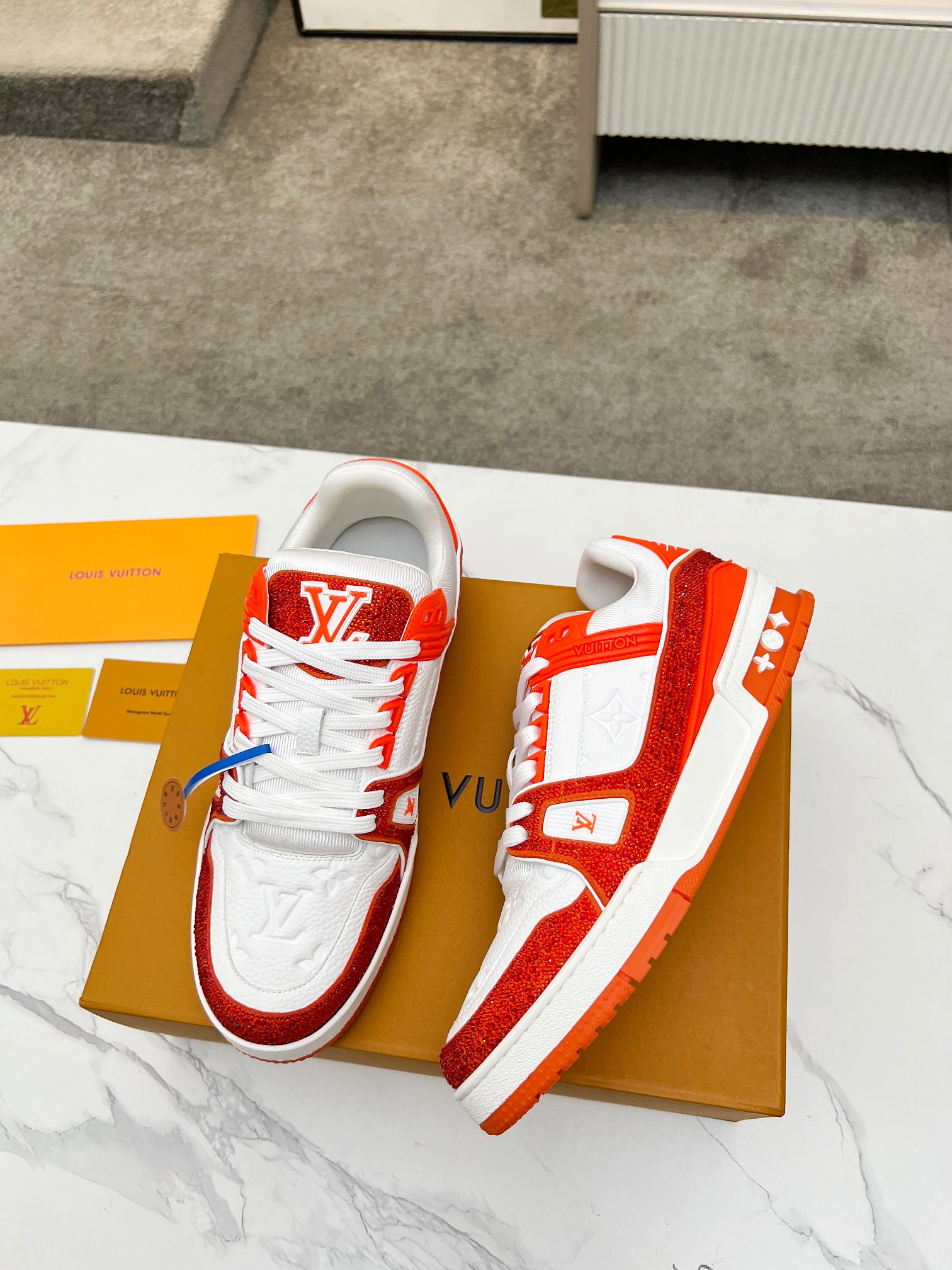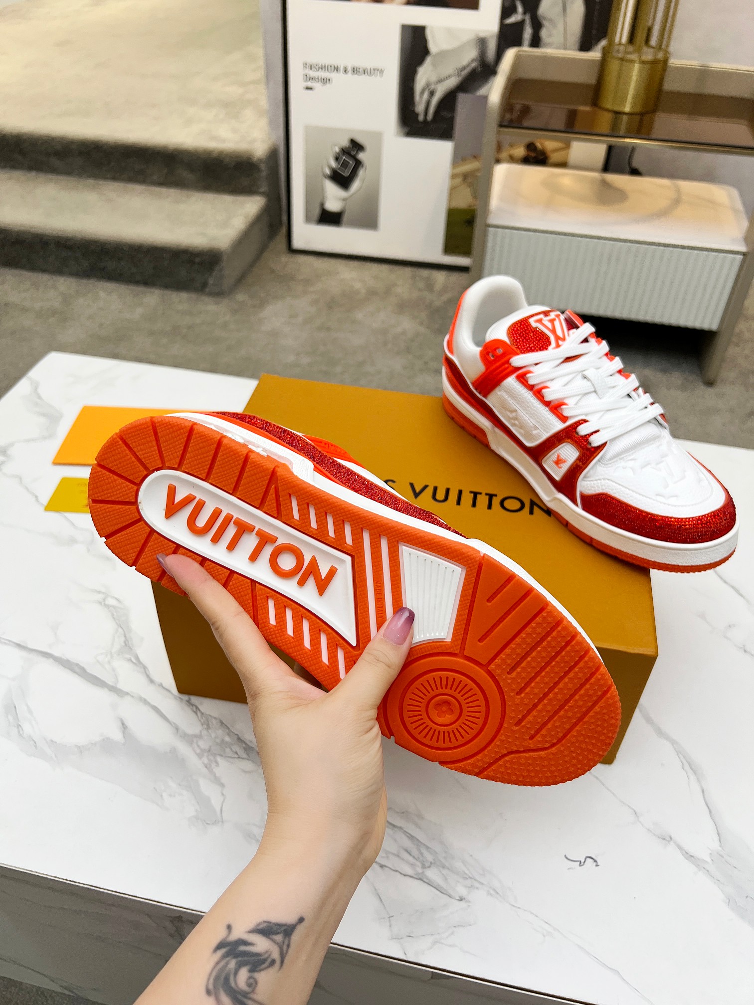 這款鞋子是AAAAA 1:1 質量(非常棒). 使用了和原版一模一樣的材料. 商標部分也保持了和路易威登/Louis Vuitton一樣. 圖片拍攝是實物鞋子拍攝, 您所收到的實物保證和我們圖片一模一樣.