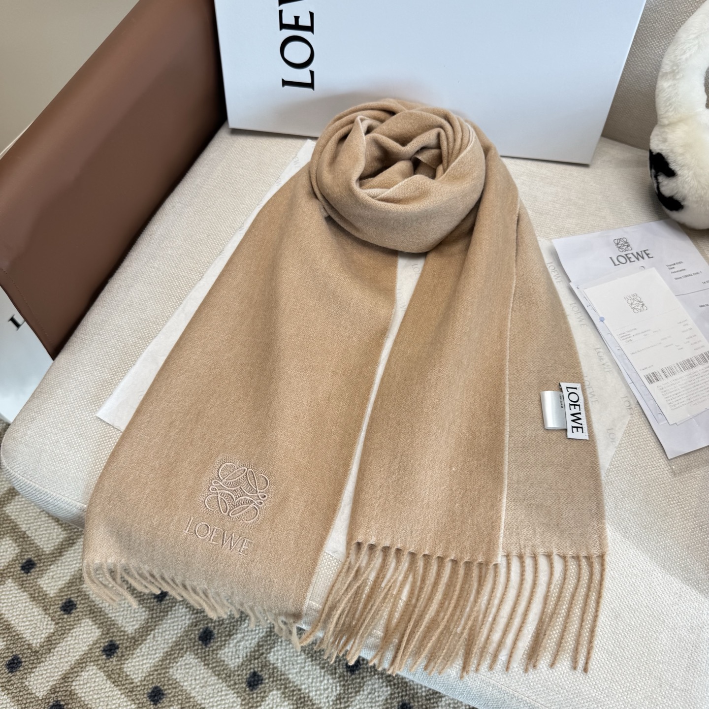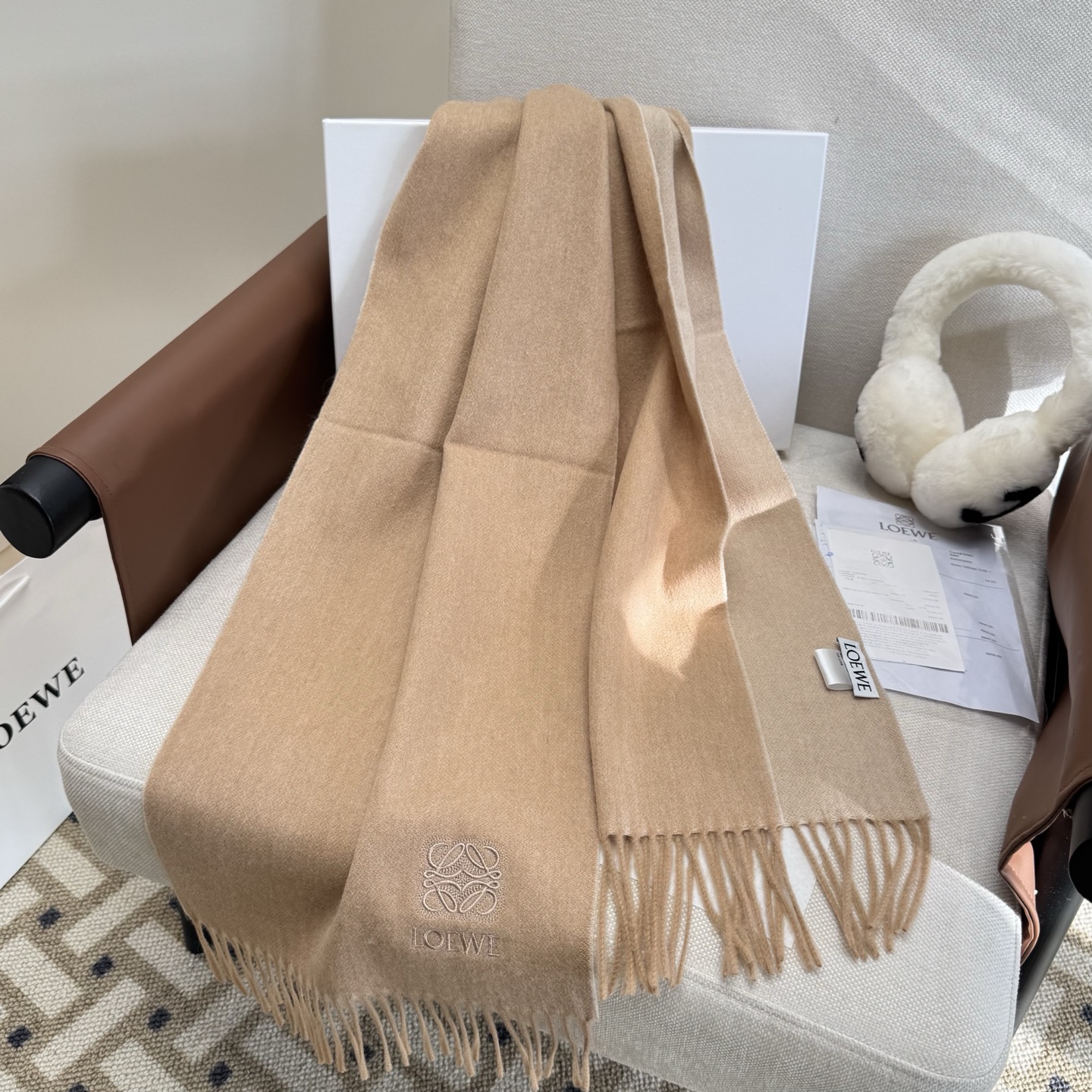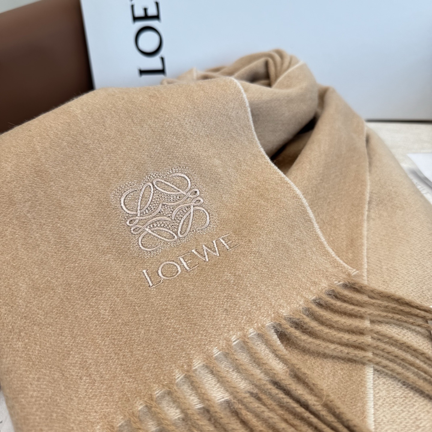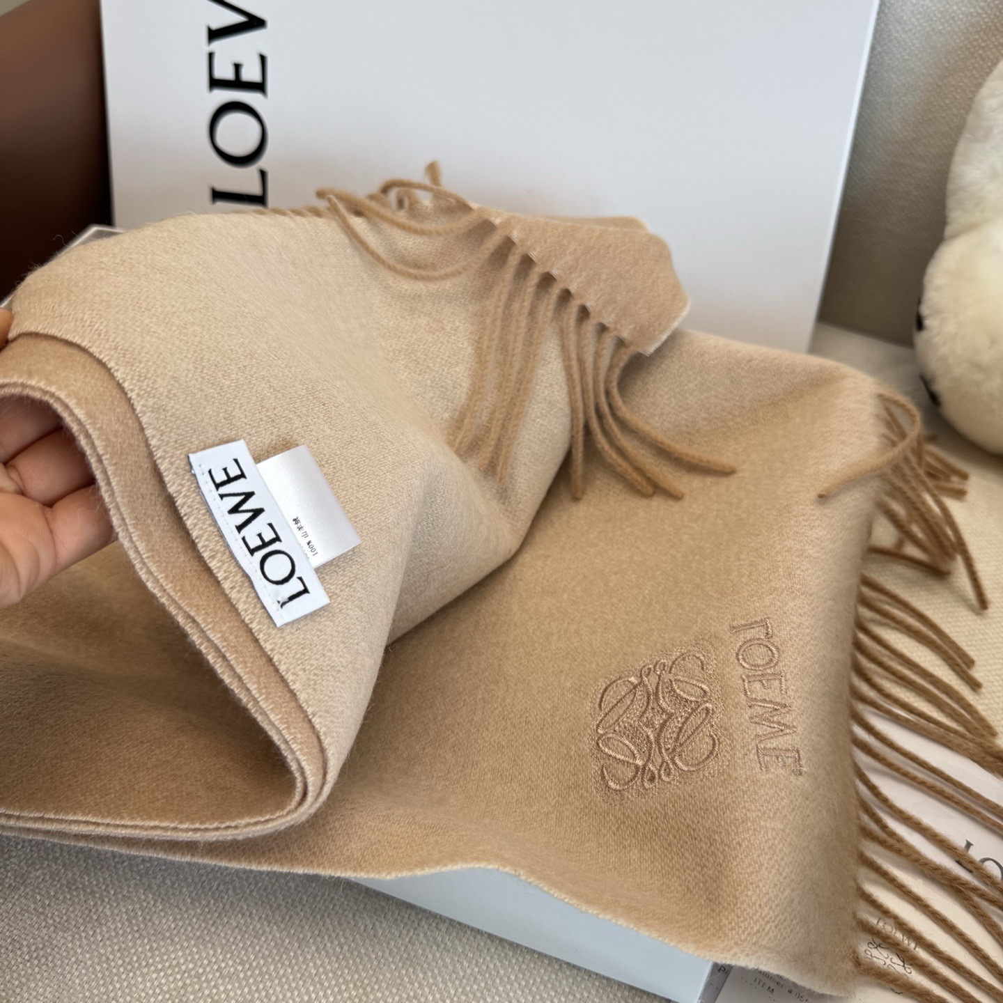 這款圍巾是AAAAA 1:1 質量(非常棒). 使用了和原版一模一樣的材料. 商標部分也保持了和Loewe一樣. 圖片拍攝是實物圍巾拍攝, 您所收到的實物保證和我們圖片一模一樣.