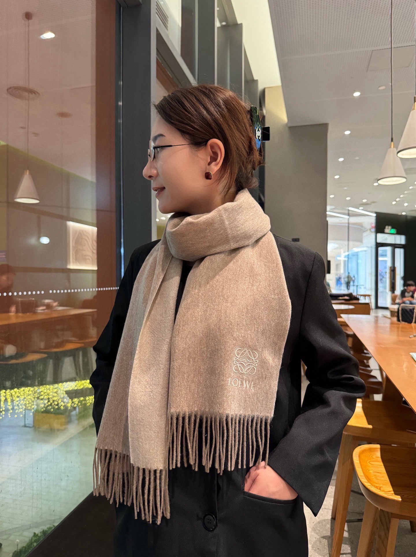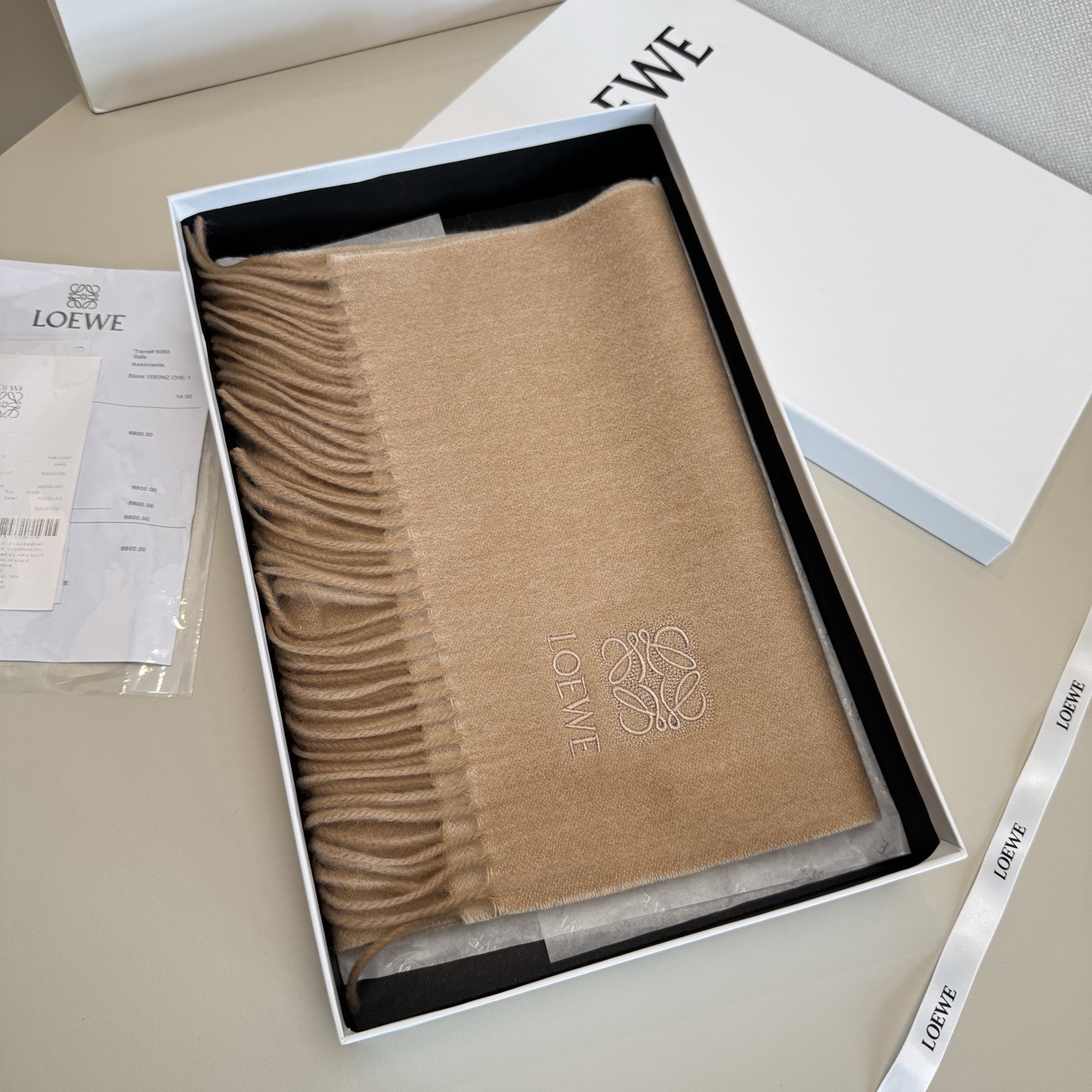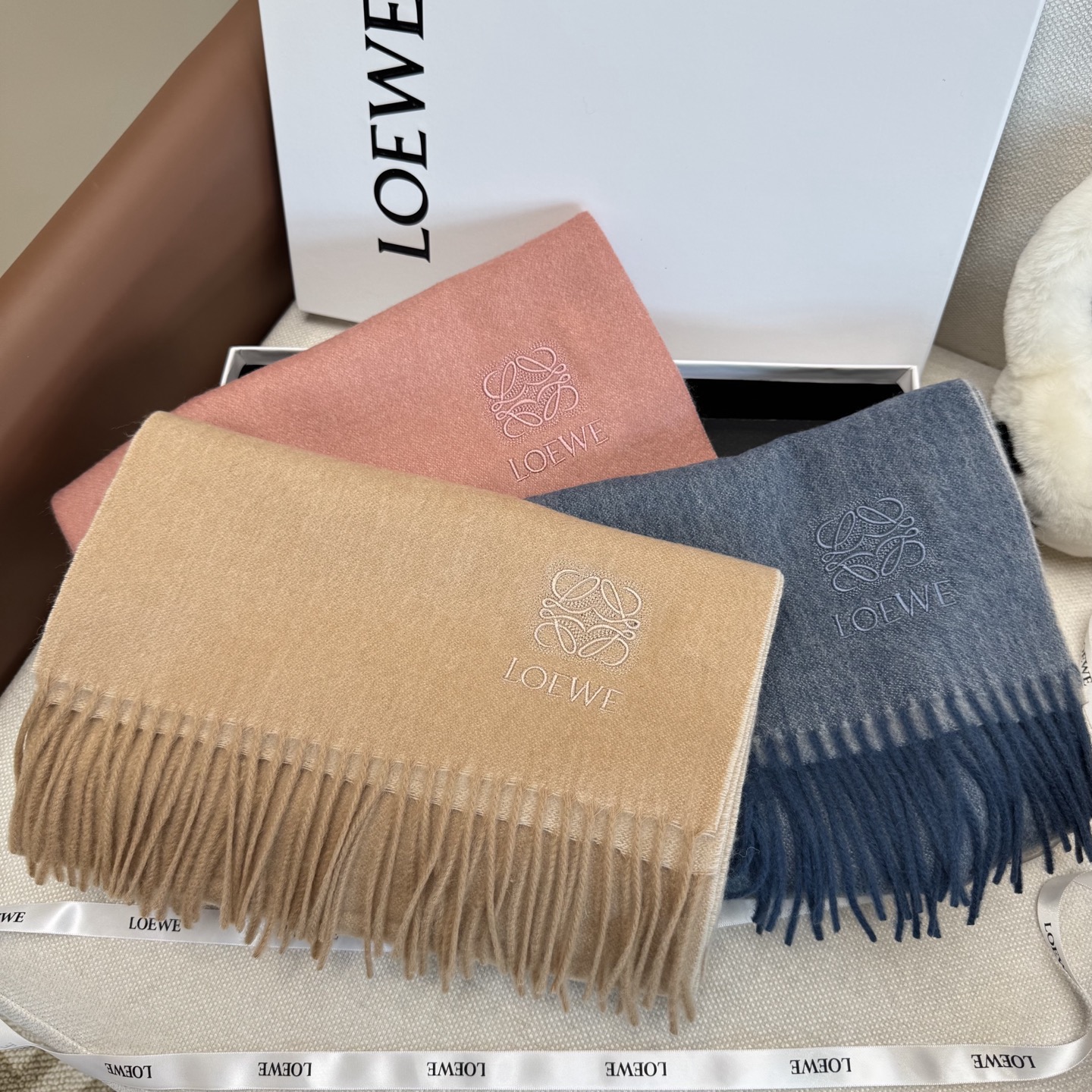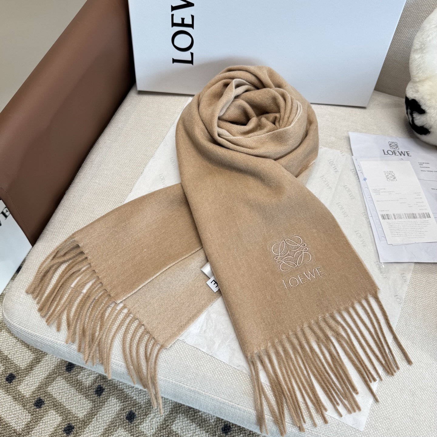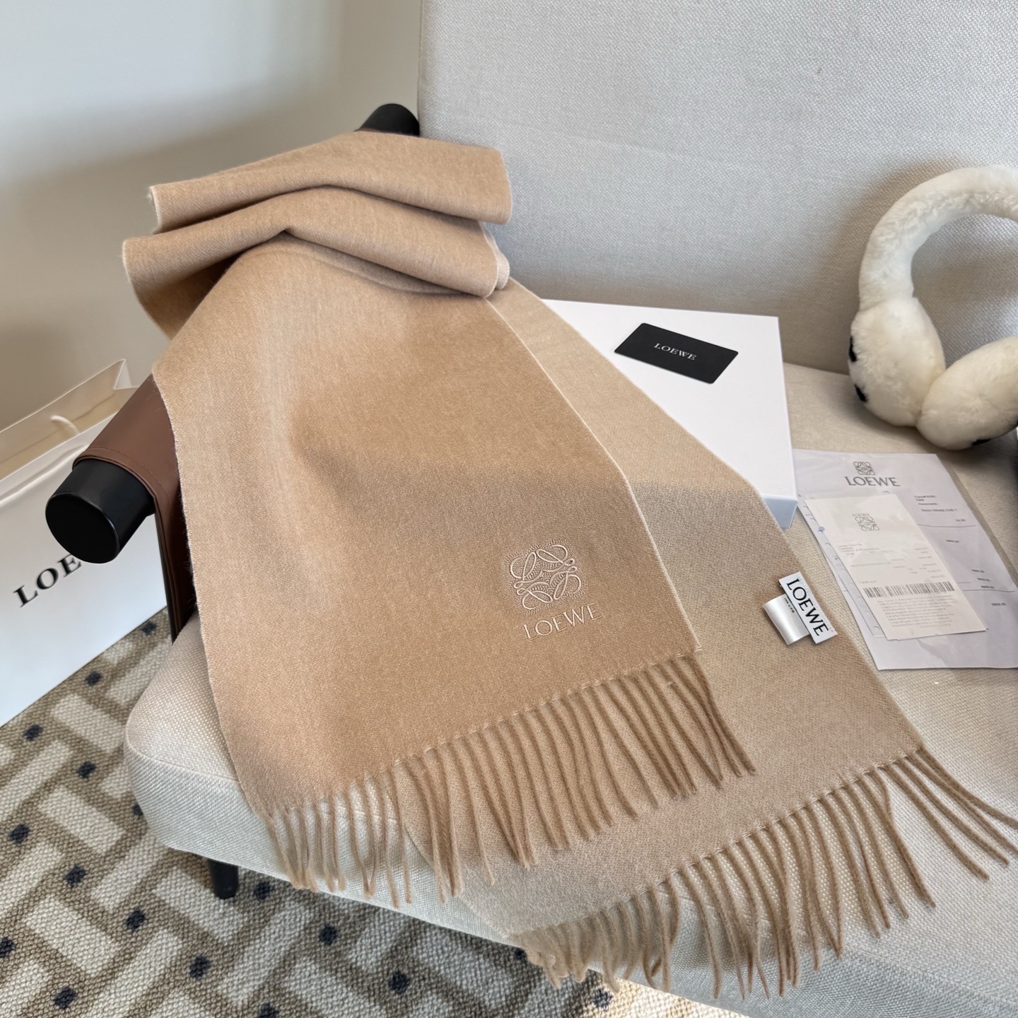這款圍巾是AAAAA 1:1 質量(非常棒). 使用了和原版一模一樣的材料. 商標部分也保持了和Loewe一樣. 圖片拍攝是實物圍巾拍攝, 您所收到的實物保證和我們圖片一模一樣.