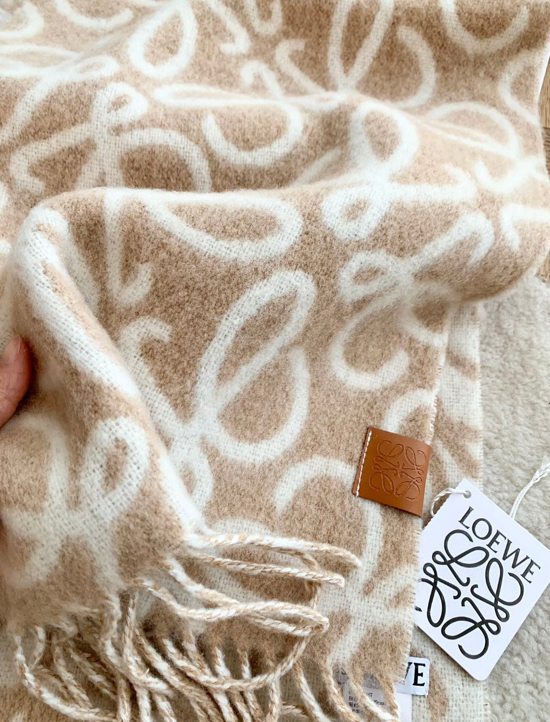 這款圍巾是AAAAA 1:1 質量(非常棒). 使用了和原版一模一樣的材料. 商標部分也保持了和Loewe一樣. 圖片拍攝是實物圍巾拍攝, 您所收到的實物保證和我們圖片一模一樣.
