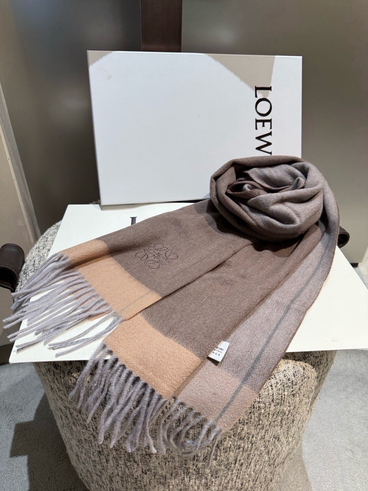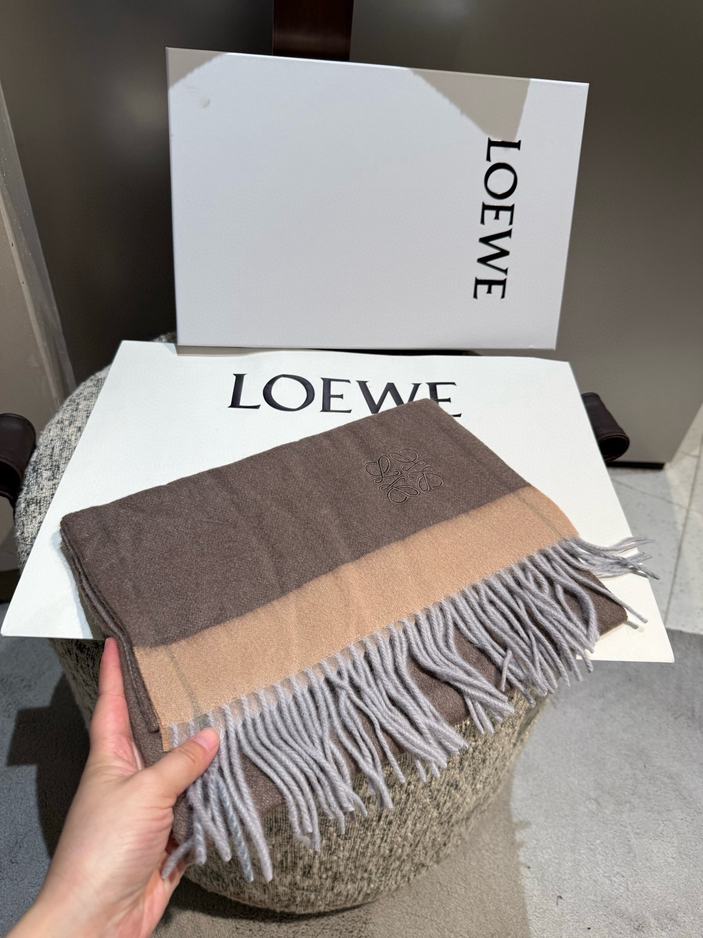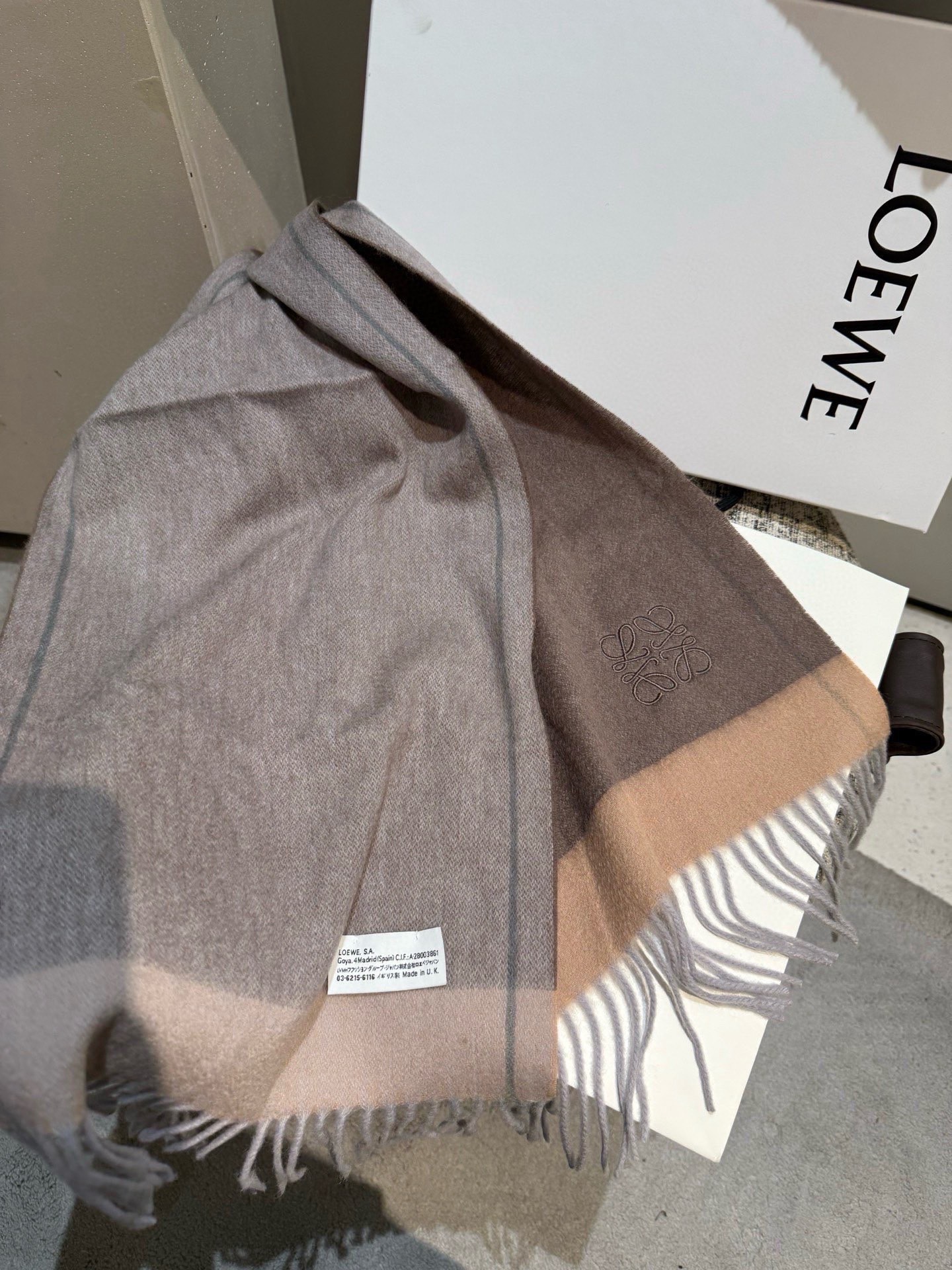 這款圍巾是AAAAA 1:1 質量(非常棒). 使用了和原版一模一樣的材料. 商標部分也保持了和Loewe一樣. 圖片拍攝是實物圍巾拍攝, 您所收到的實物保證和我們圖片一模一樣.