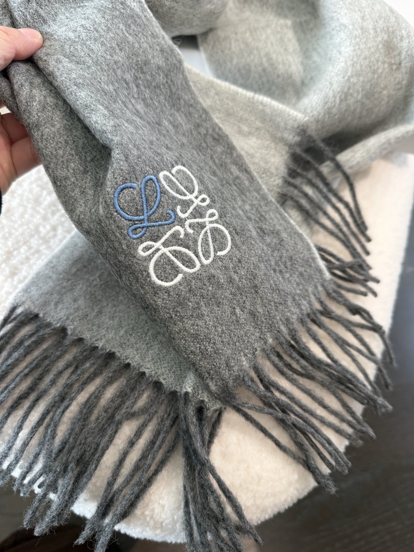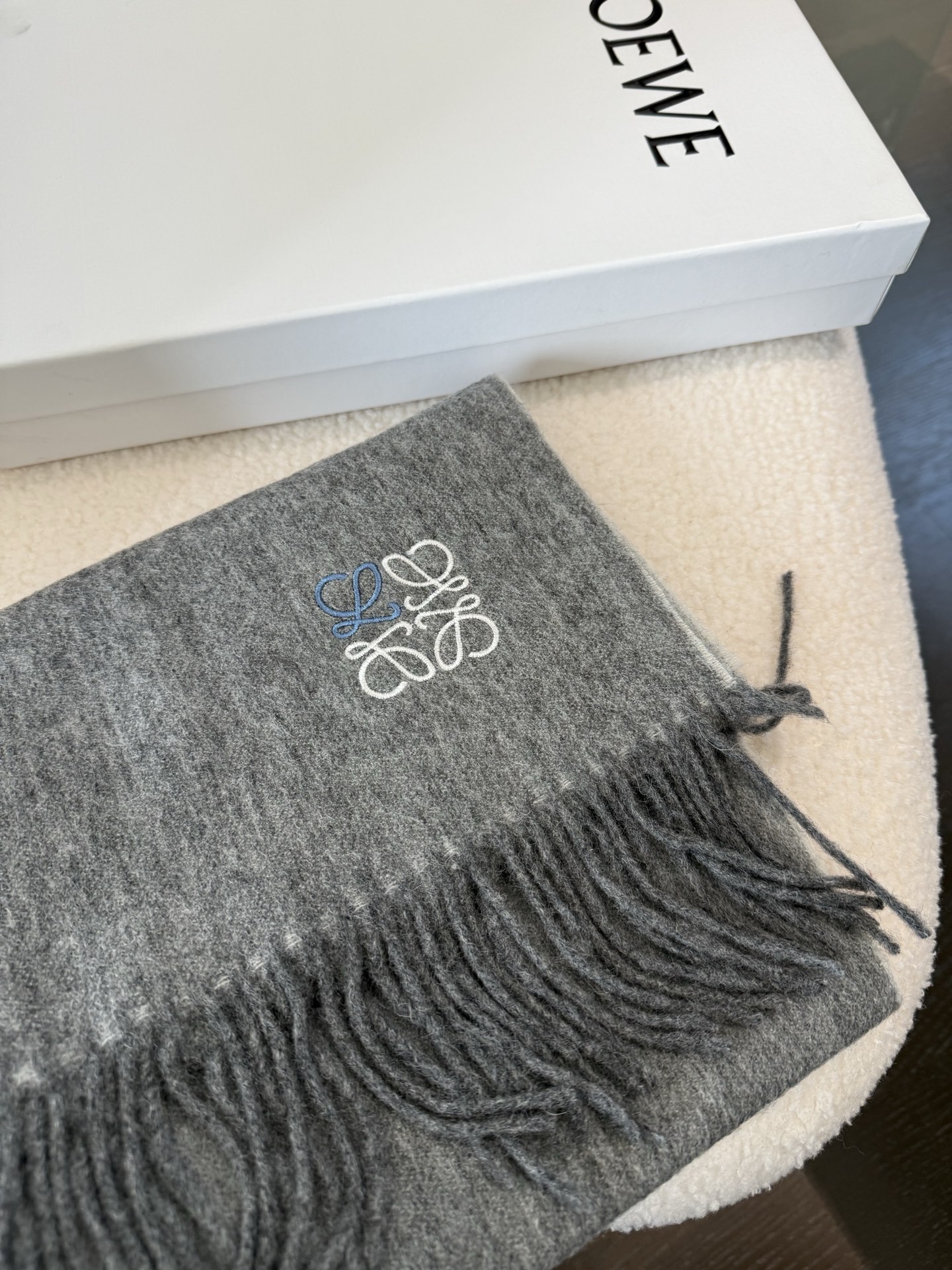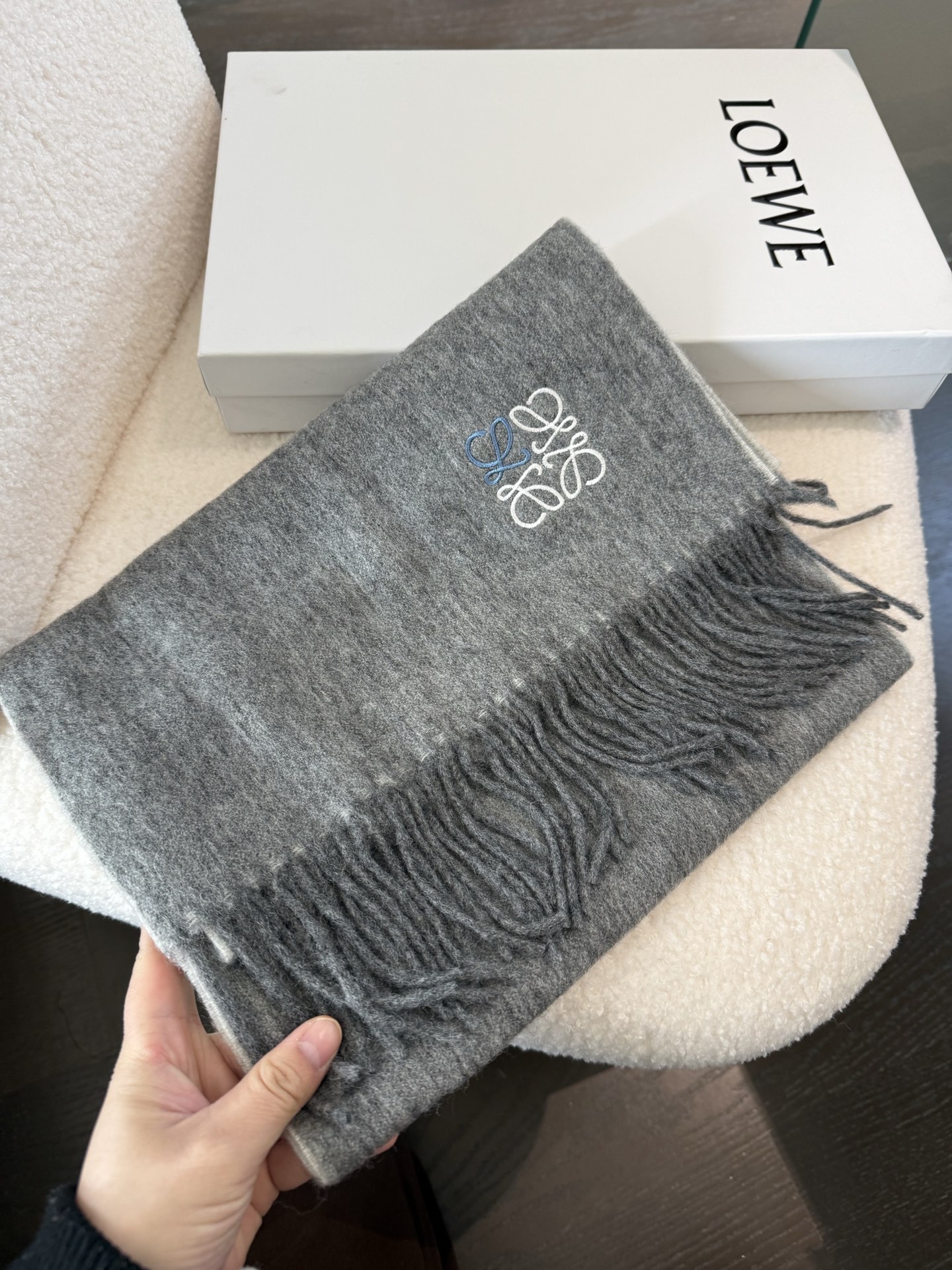 這款圍巾是AAAAA 1:1 質量(非常棒). 使用了和原版一模一樣的材料. 商標部分也保持了和Loewe一樣. 圖片拍攝是實物圍巾拍攝, 您所收到的實物保證和我們圖片一模一樣.