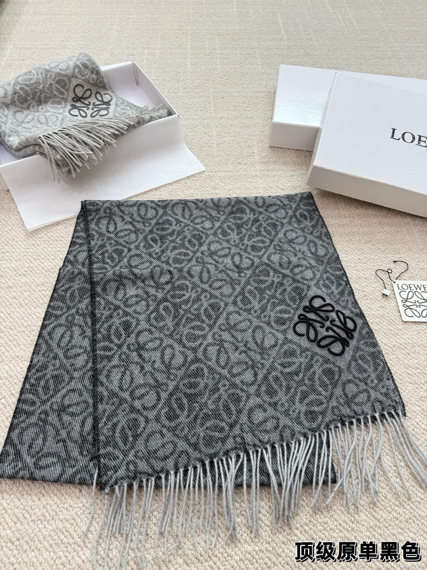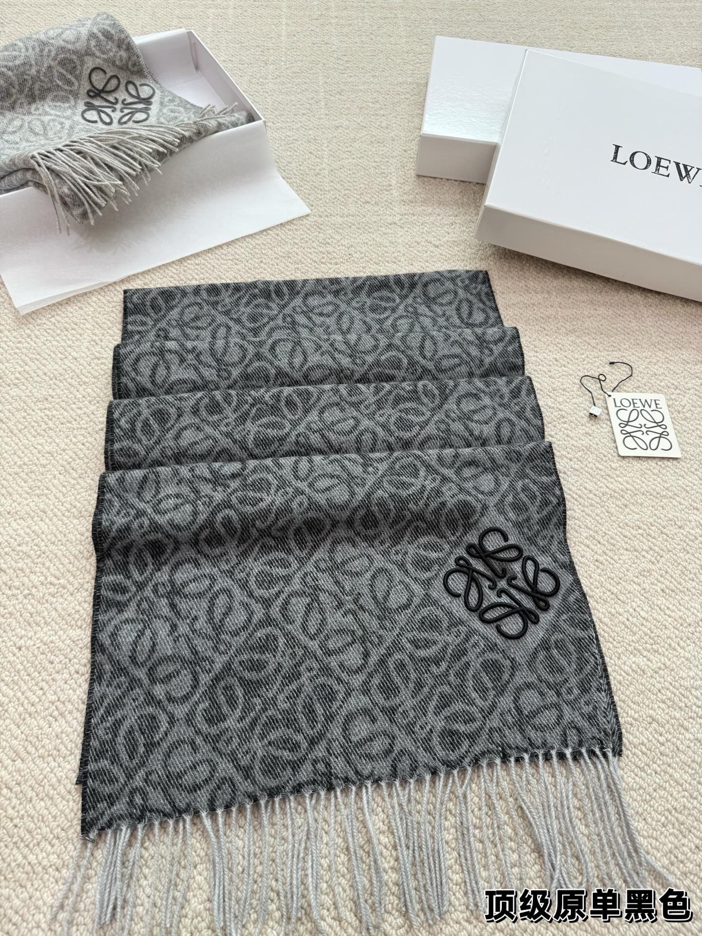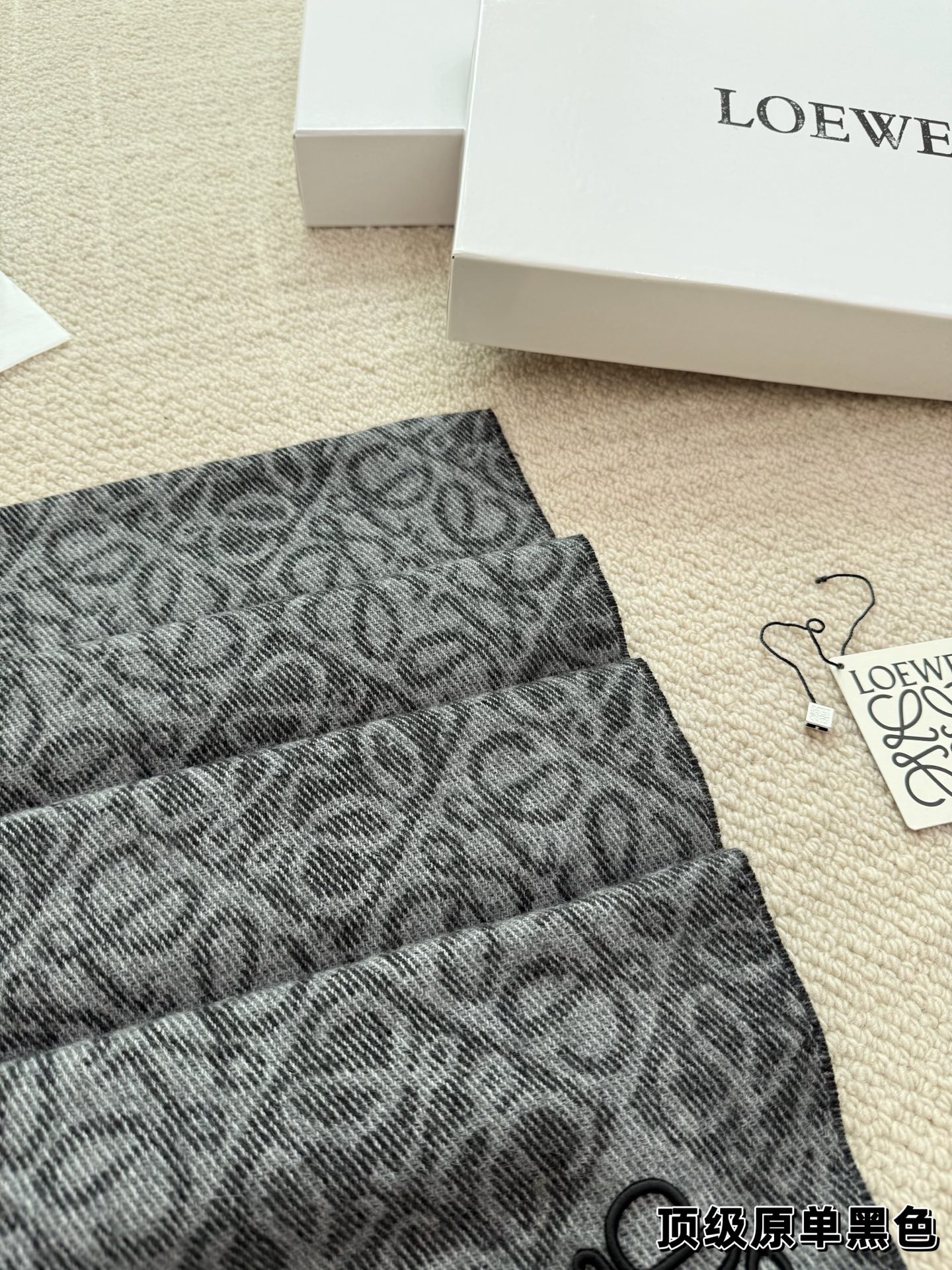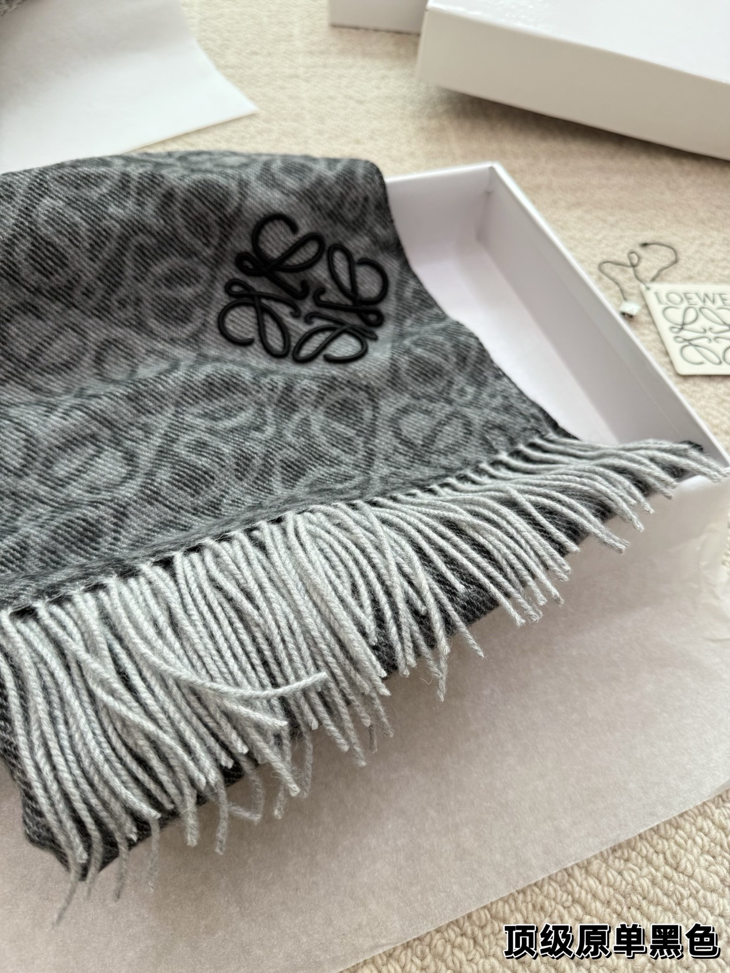 這款圍巾是AAAAA 1:1 質量(非常棒). 使用了和原版一模一樣的材料. 商標部分也保持了和Loewe一樣. 圖片拍攝是實物圍巾拍攝, 您所收到的實物保證和我們圖片一模一樣.