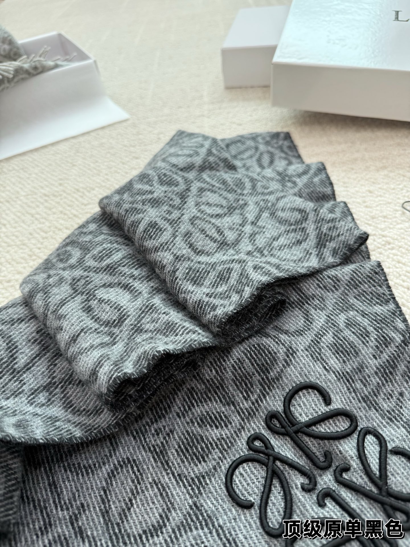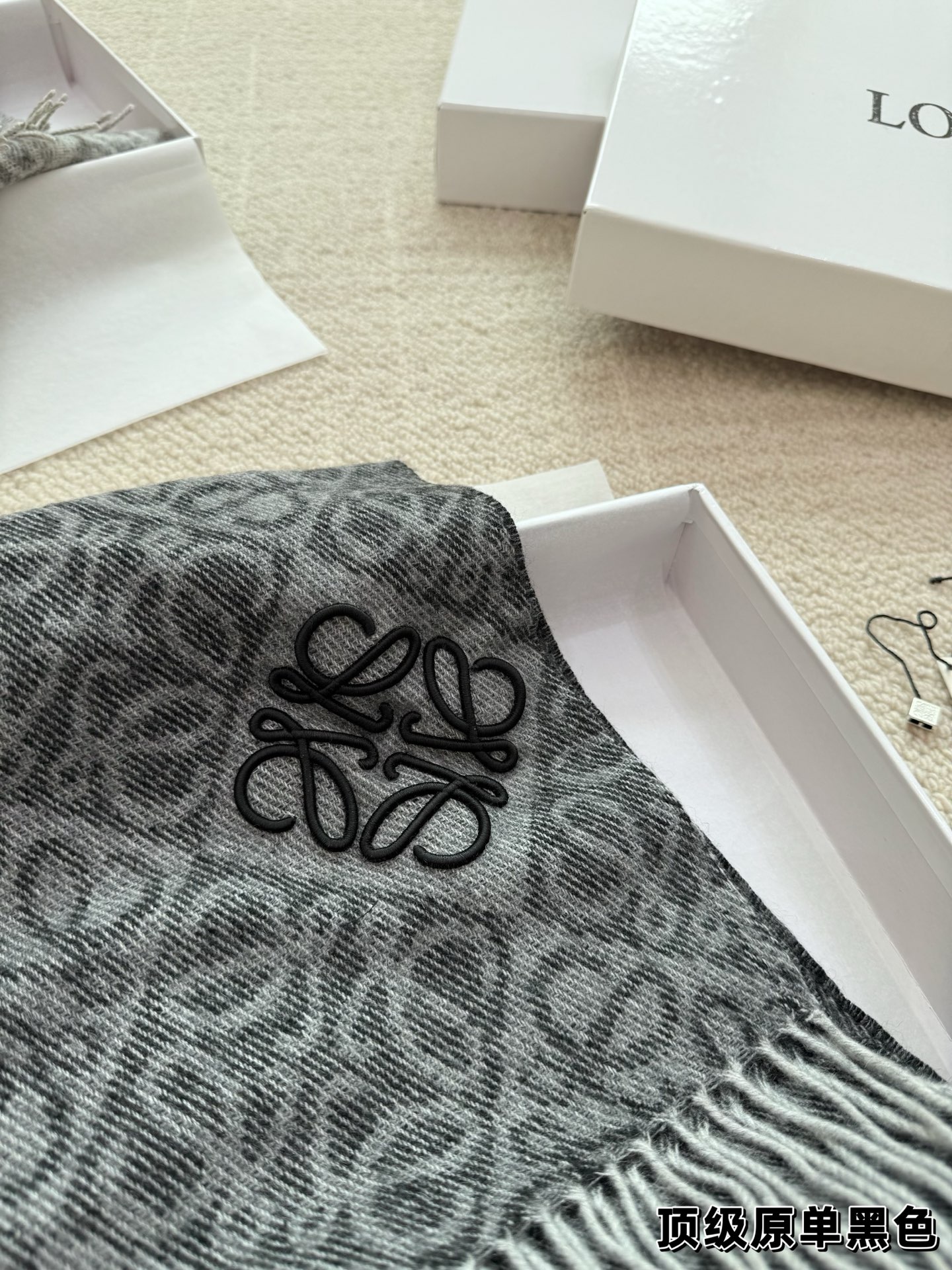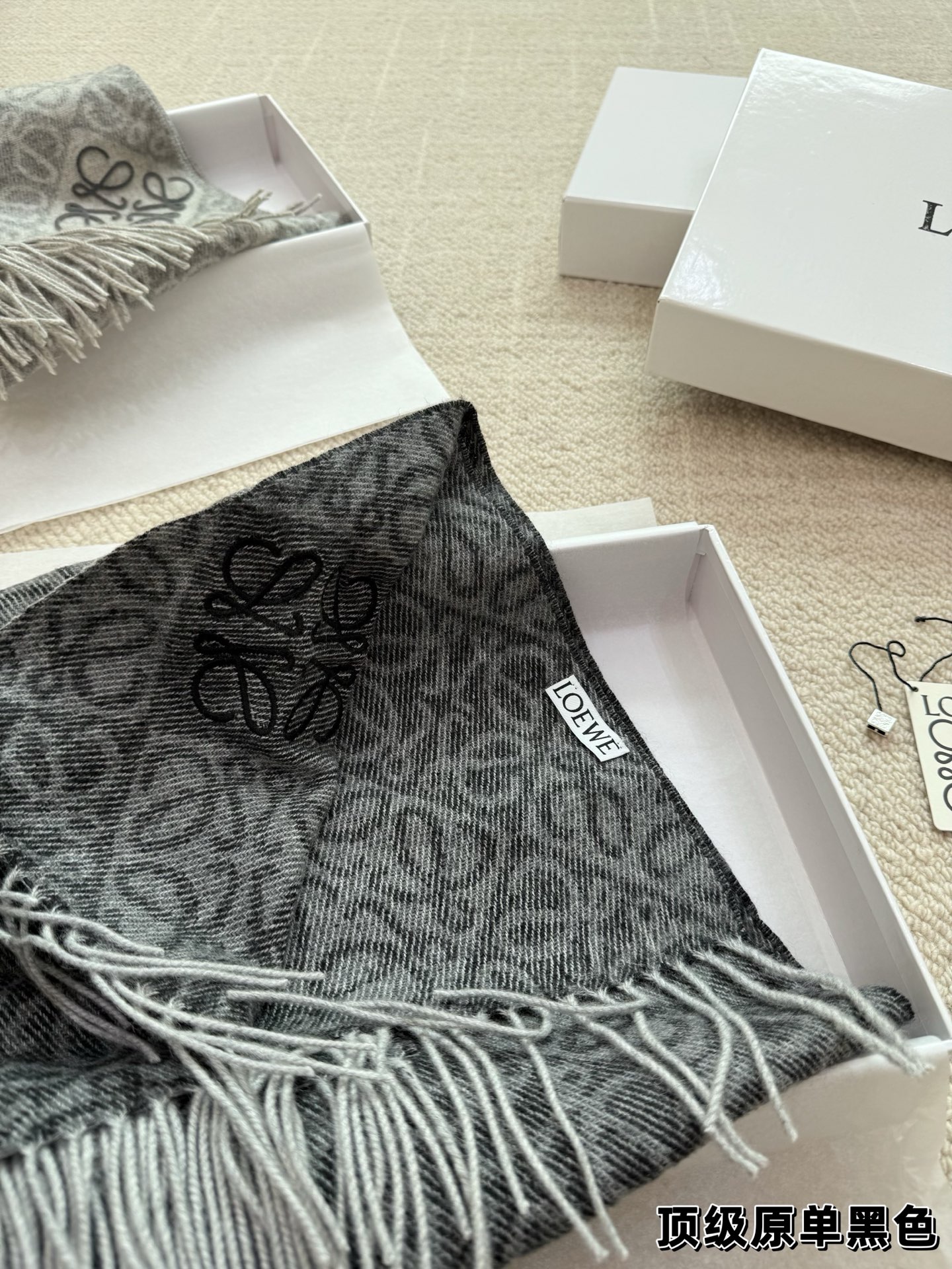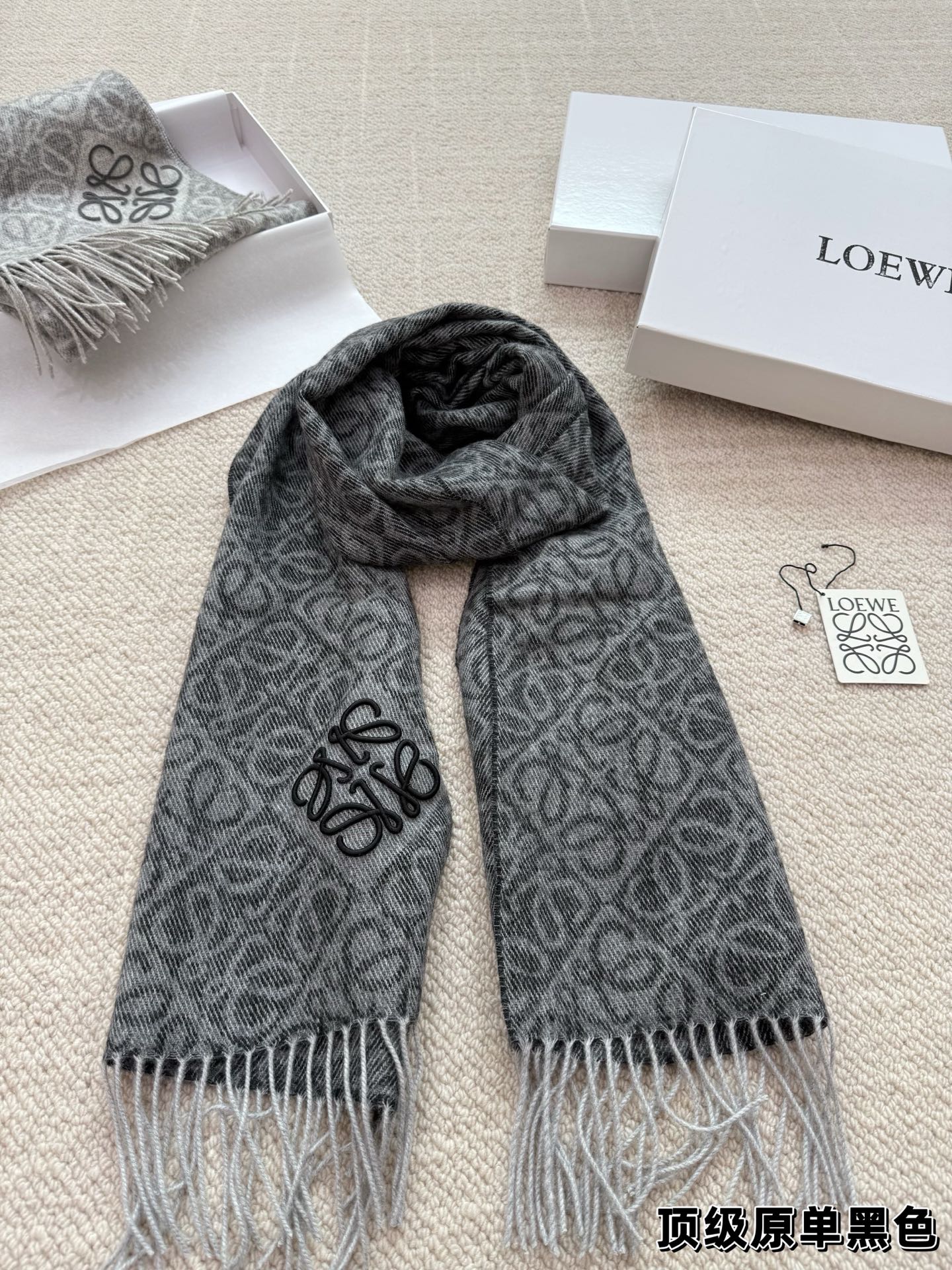 這款圍巾是AAAAA 1:1 質量(非常棒). 使用了和原版一模一樣的材料. 商標部分也保持了和Loewe一樣. 圖片拍攝是實物圍巾拍攝, 您所收到的實物保證和我們圖片一模一樣.