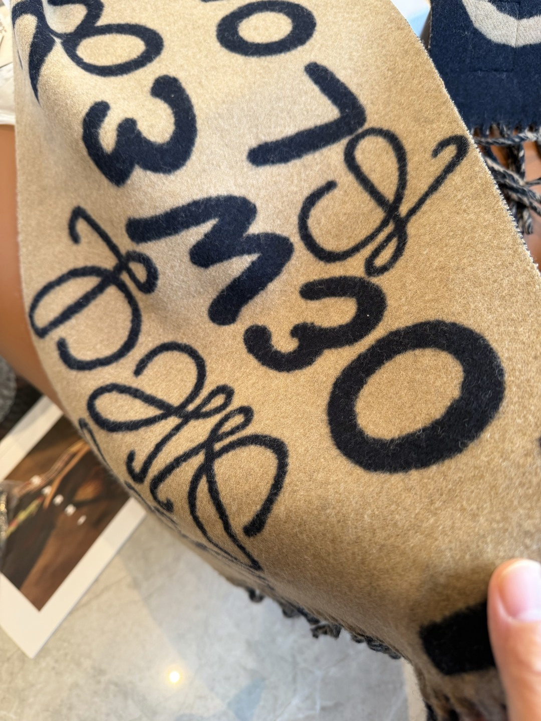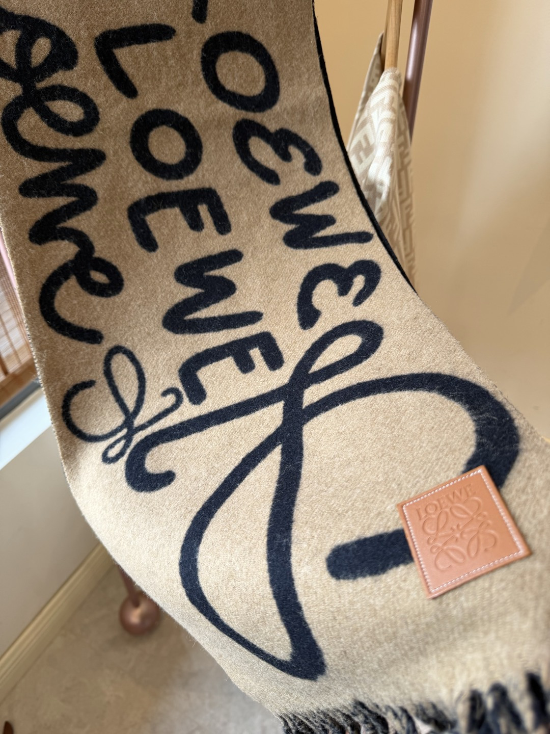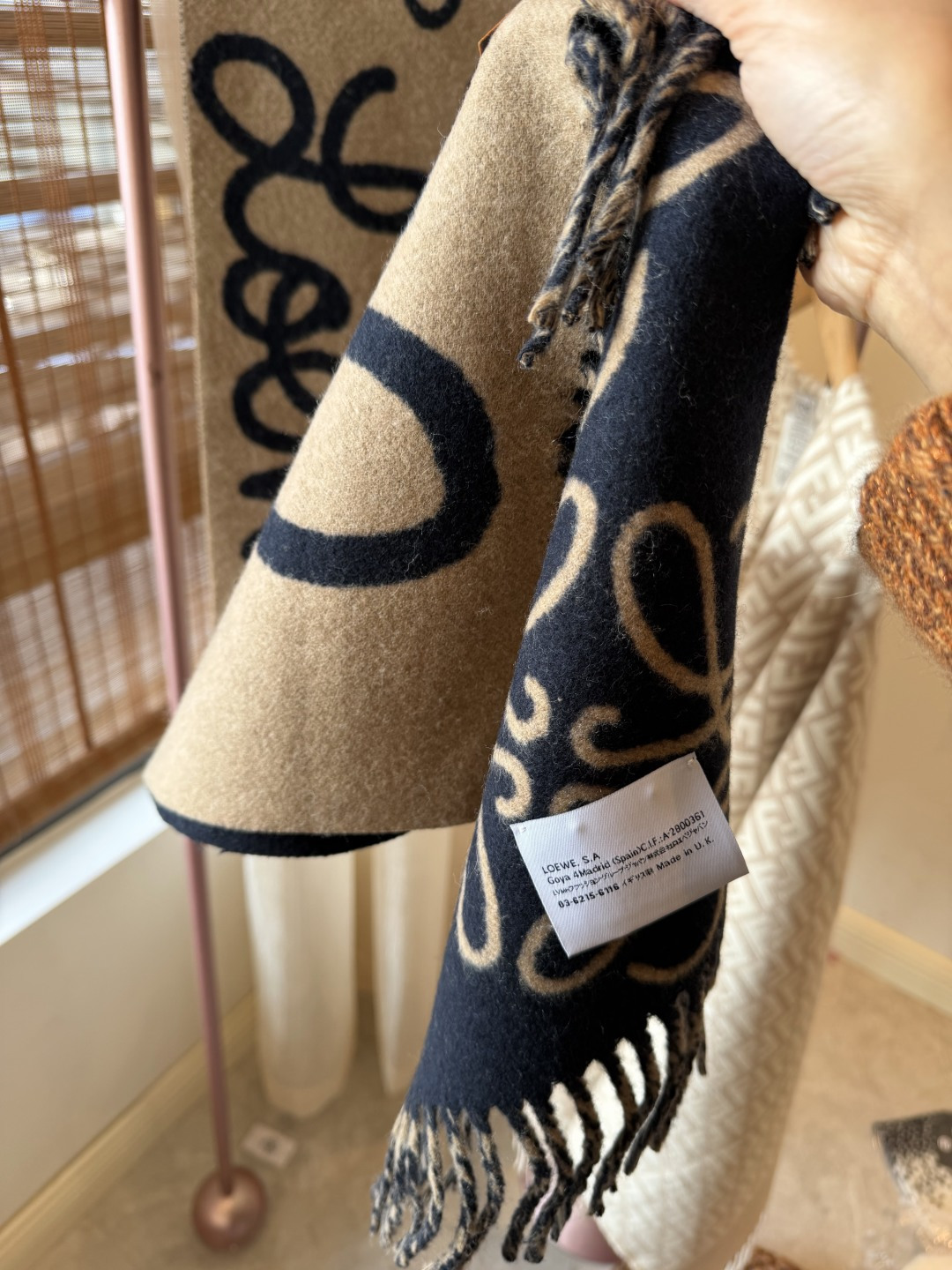 這款圍巾是AAAAA 1:1 質量(非常棒). 使用了和原版一模一樣的材料. 商標部分也保持了和Loewe一樣. 圖片拍攝是實物圍巾拍攝, 您所收到的實物保證和我們圖片一模一樣.