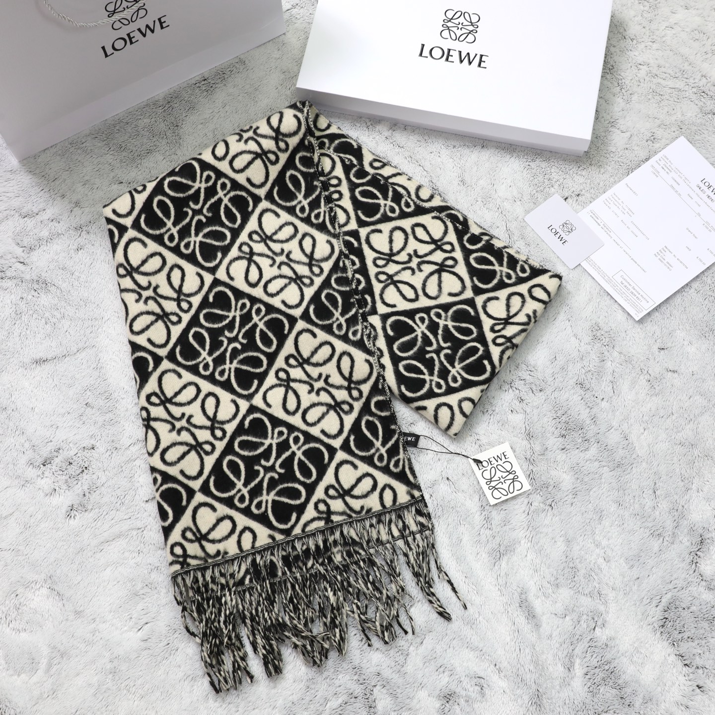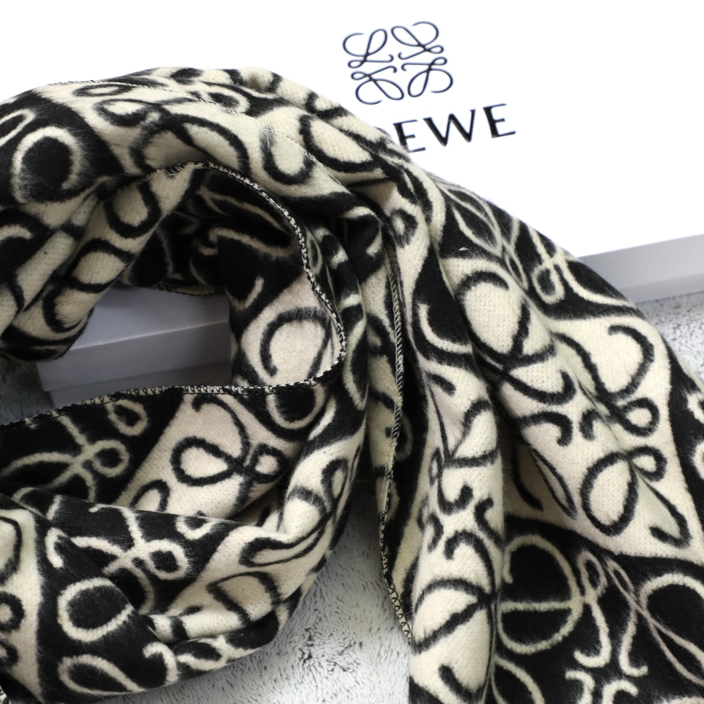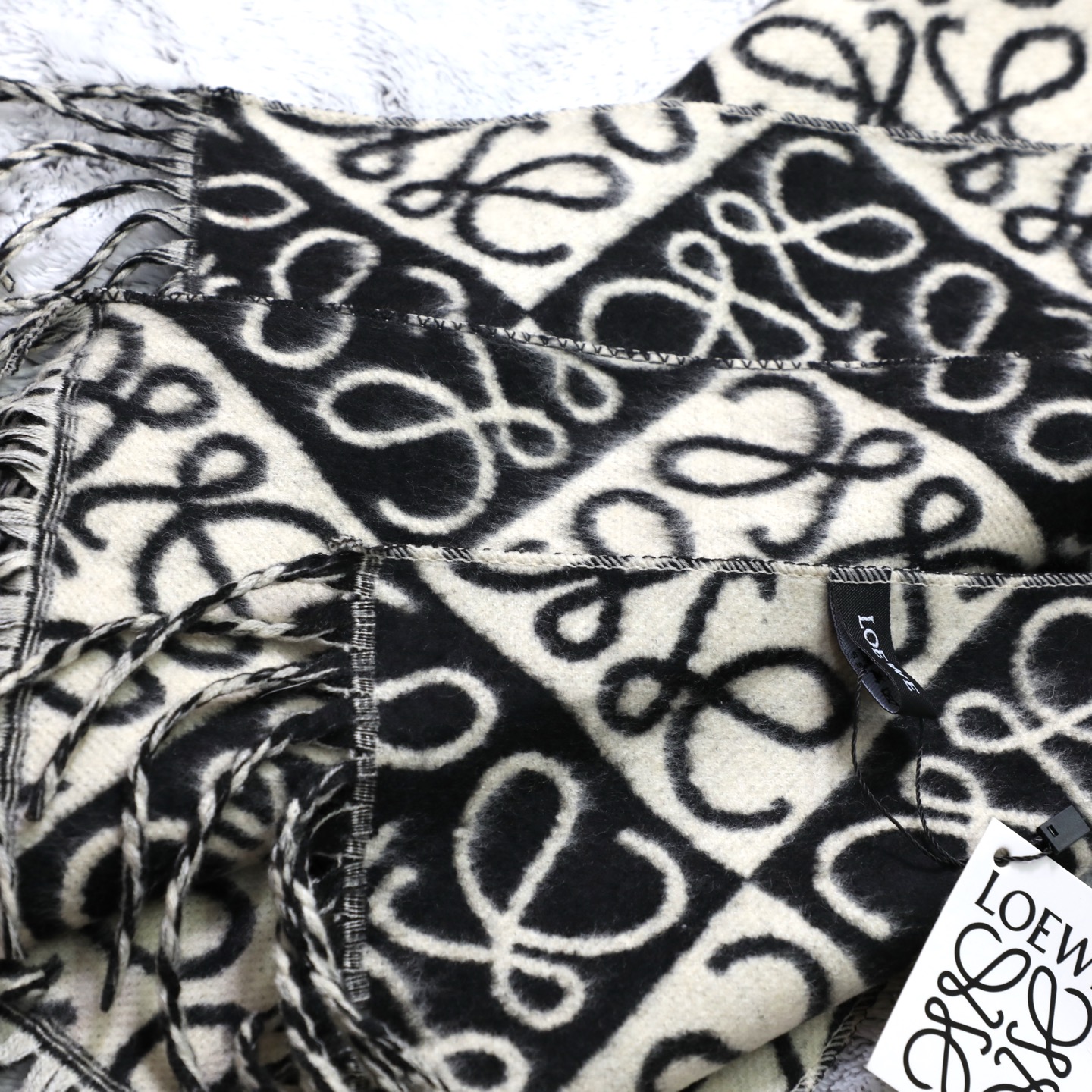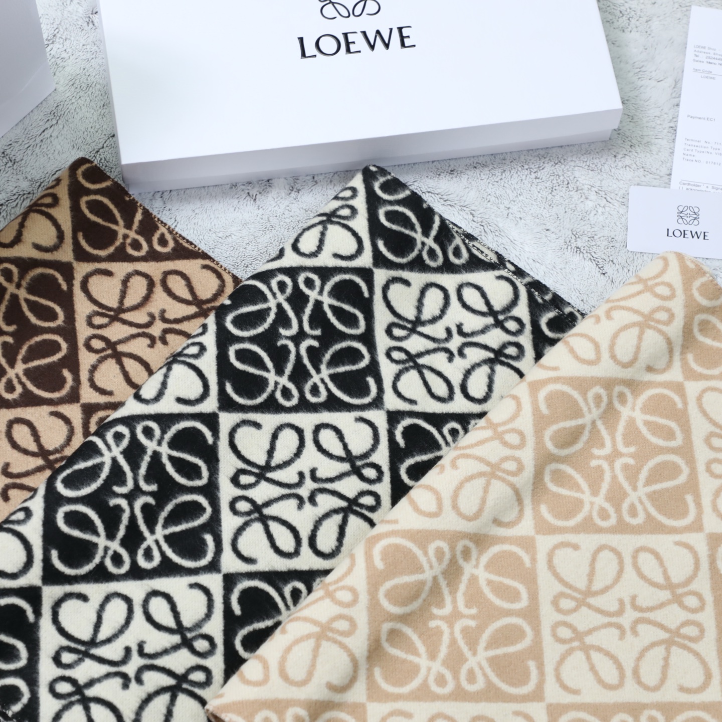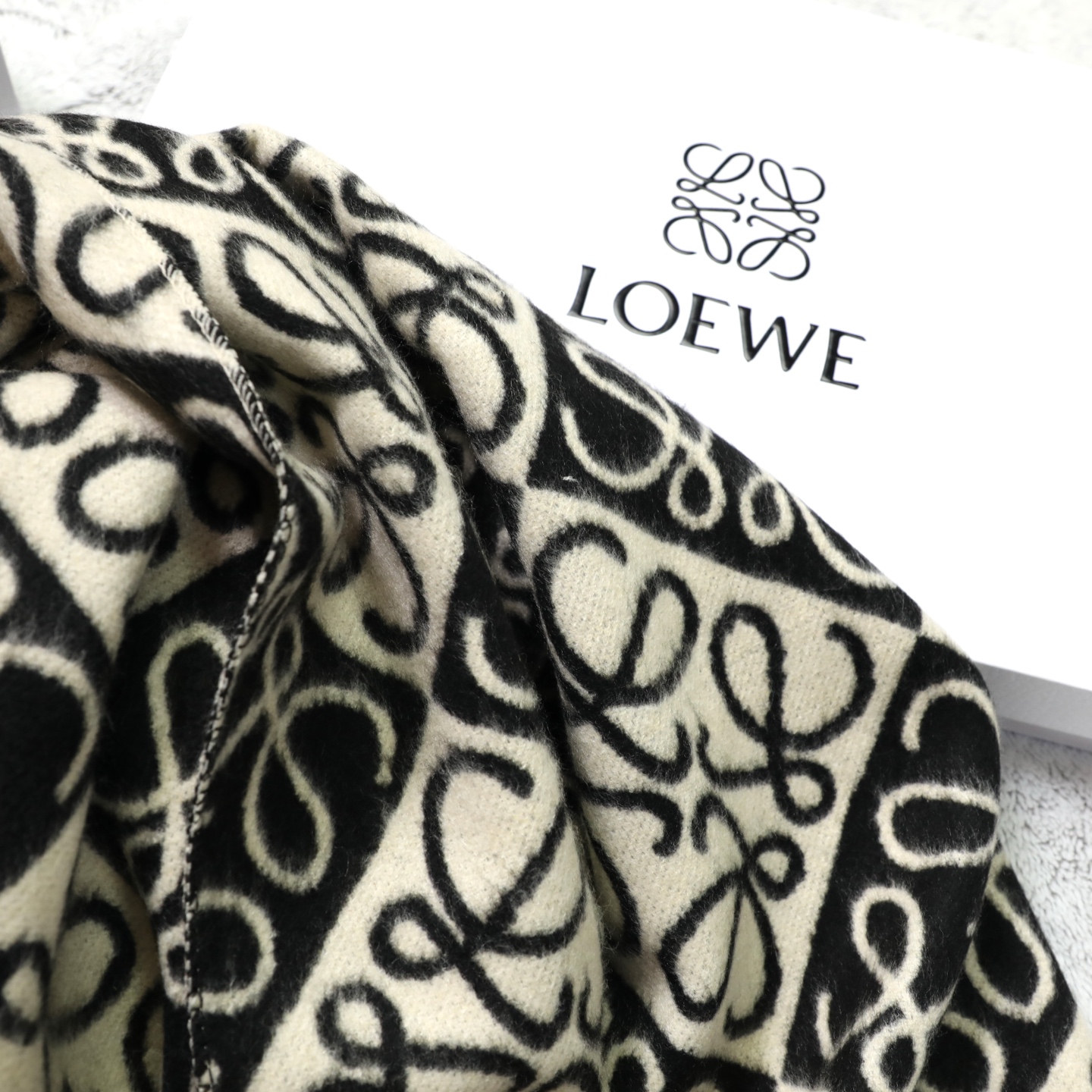 這款圍巾是AAAAA 1:1 質量(非常棒). 使用了和原版一模一樣的材料. 商標部分也保持了和Loewe一樣. 圖片拍攝是實物圍巾拍攝, 您所收到的實物保證和我們圖片一模一樣.