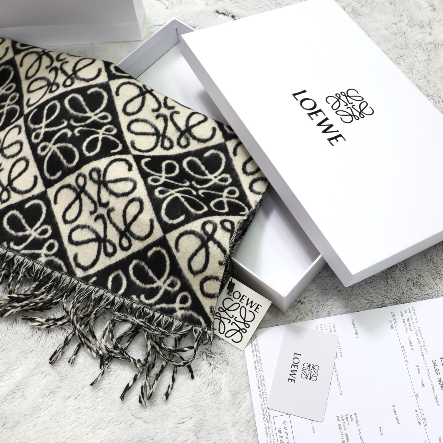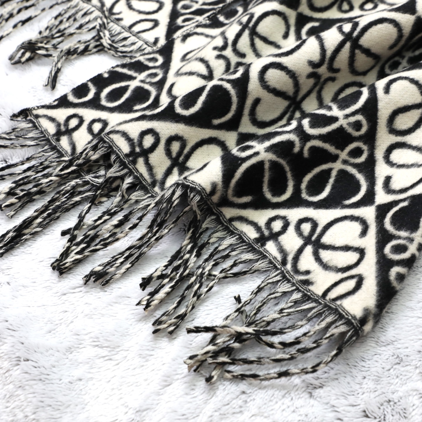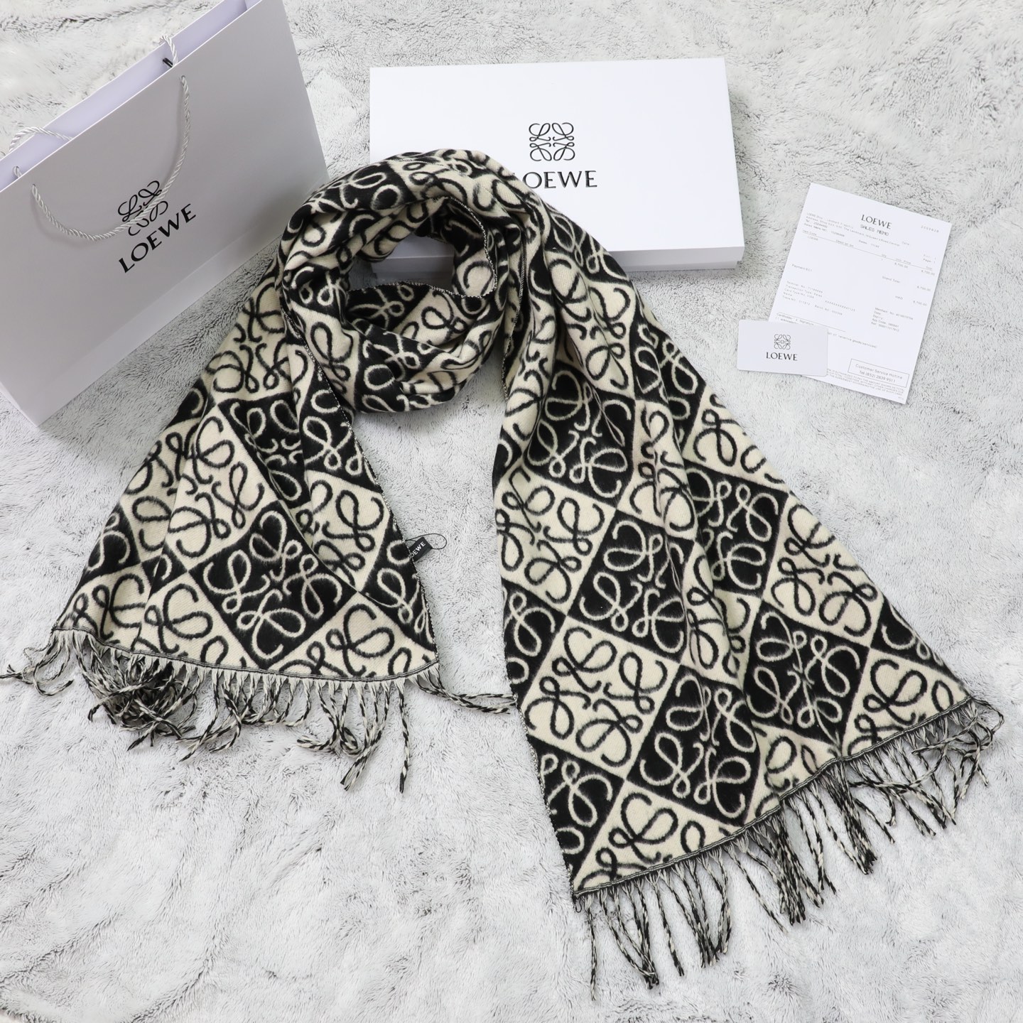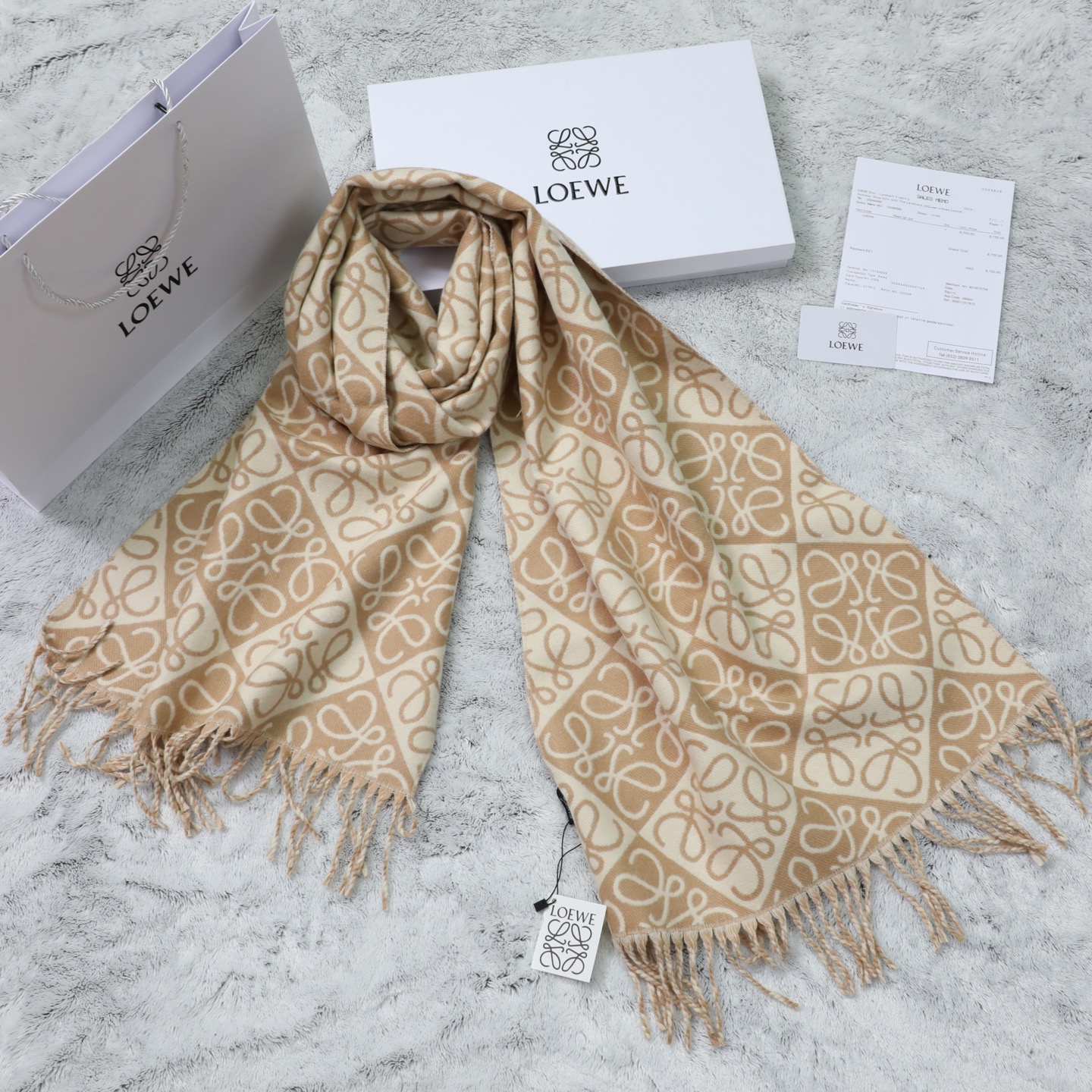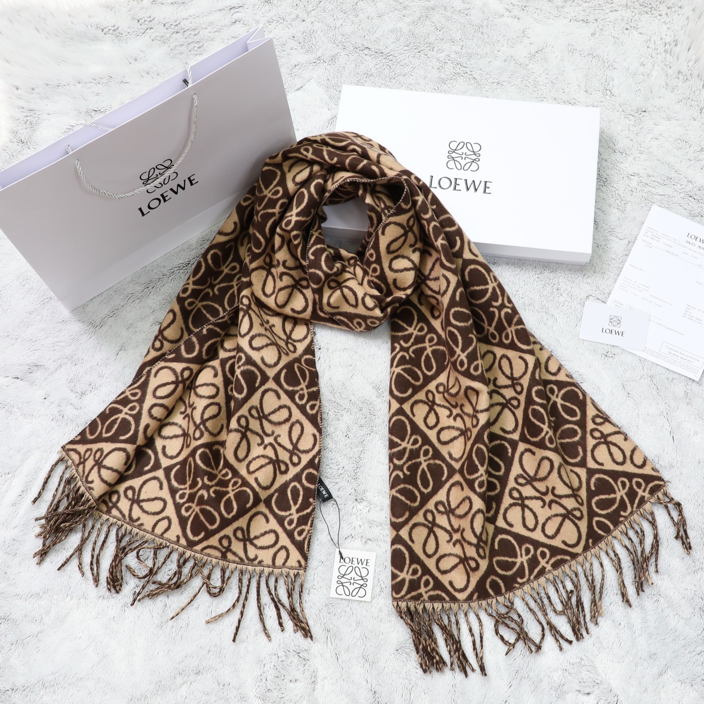 這款圍巾是AAAAA 1:1 質量(非常棒). 使用了和原版一模一樣的材料. 商標部分也保持了和Loewe一樣. 圖片拍攝是實物圍巾拍攝, 您所收到的實物保證和我們圖片一模一樣.