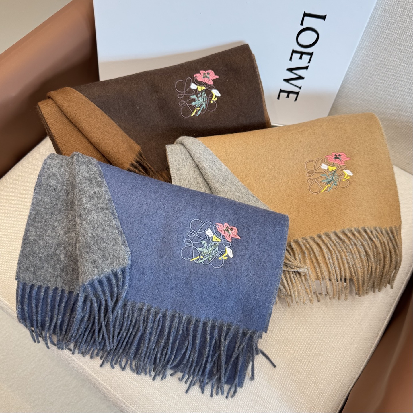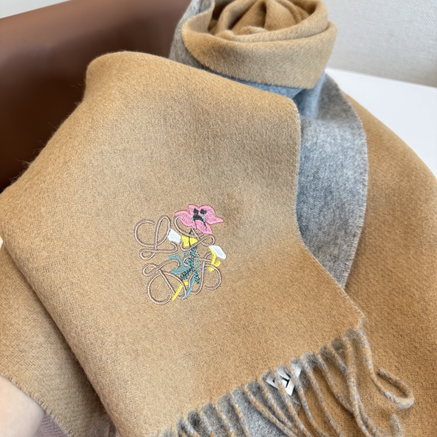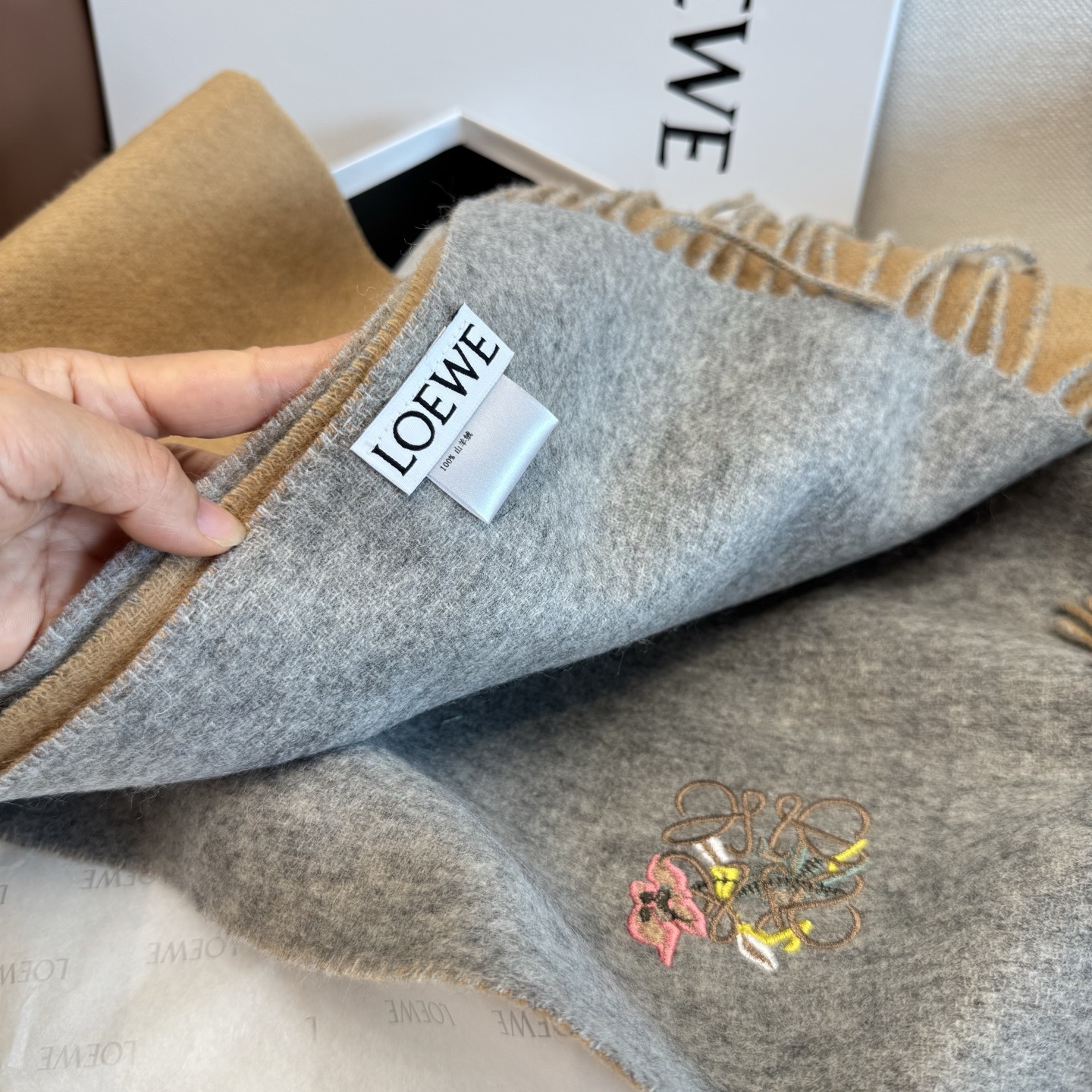 這款圍巾是AAAAA 1:1 質量(非常棒). 使用了和原版一模一樣的材料. 商標部分也保持了和Loewe一樣. 圖片拍攝是實物圍巾拍攝, 您所收到的實物保證和我們圖片一模一樣.