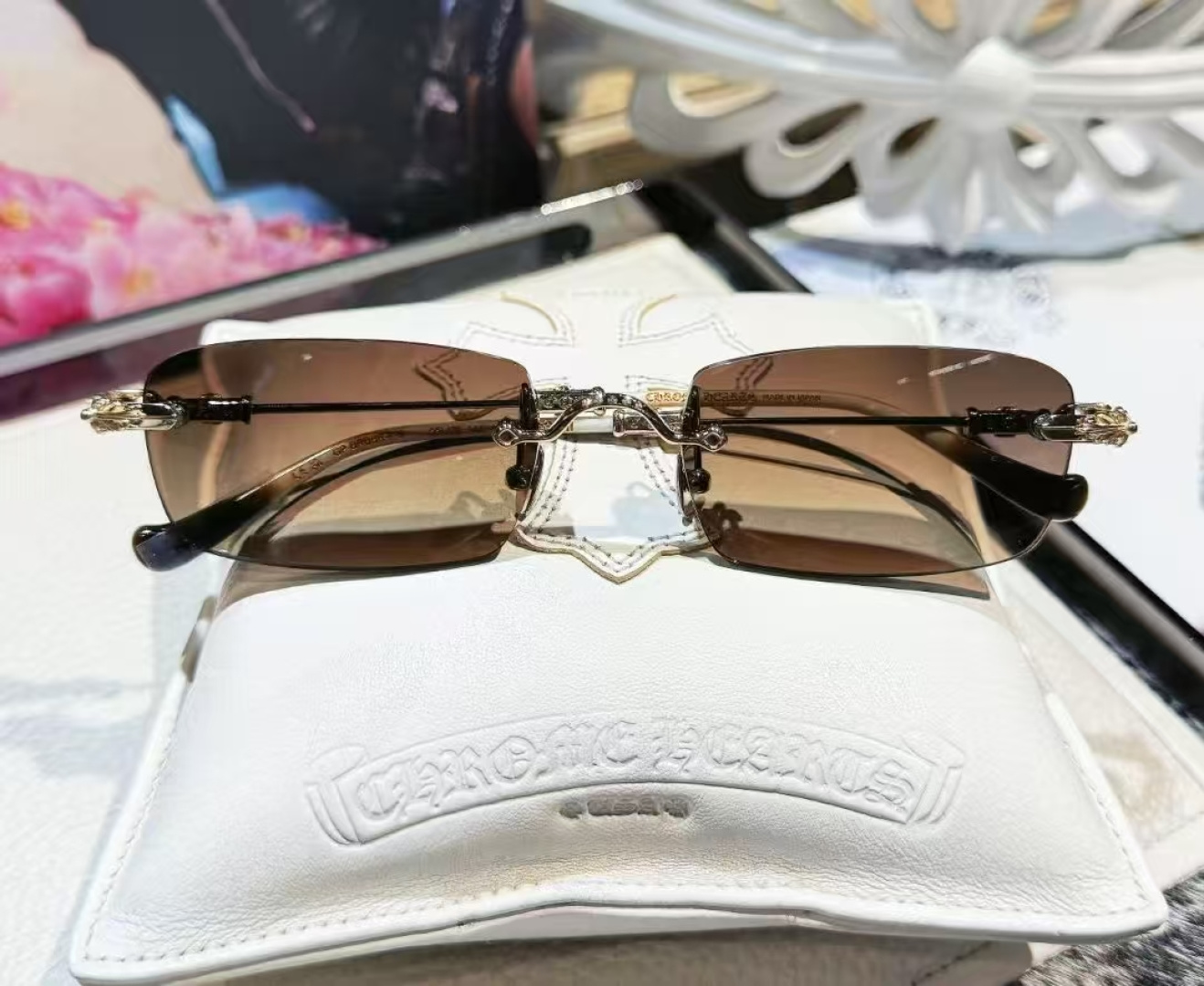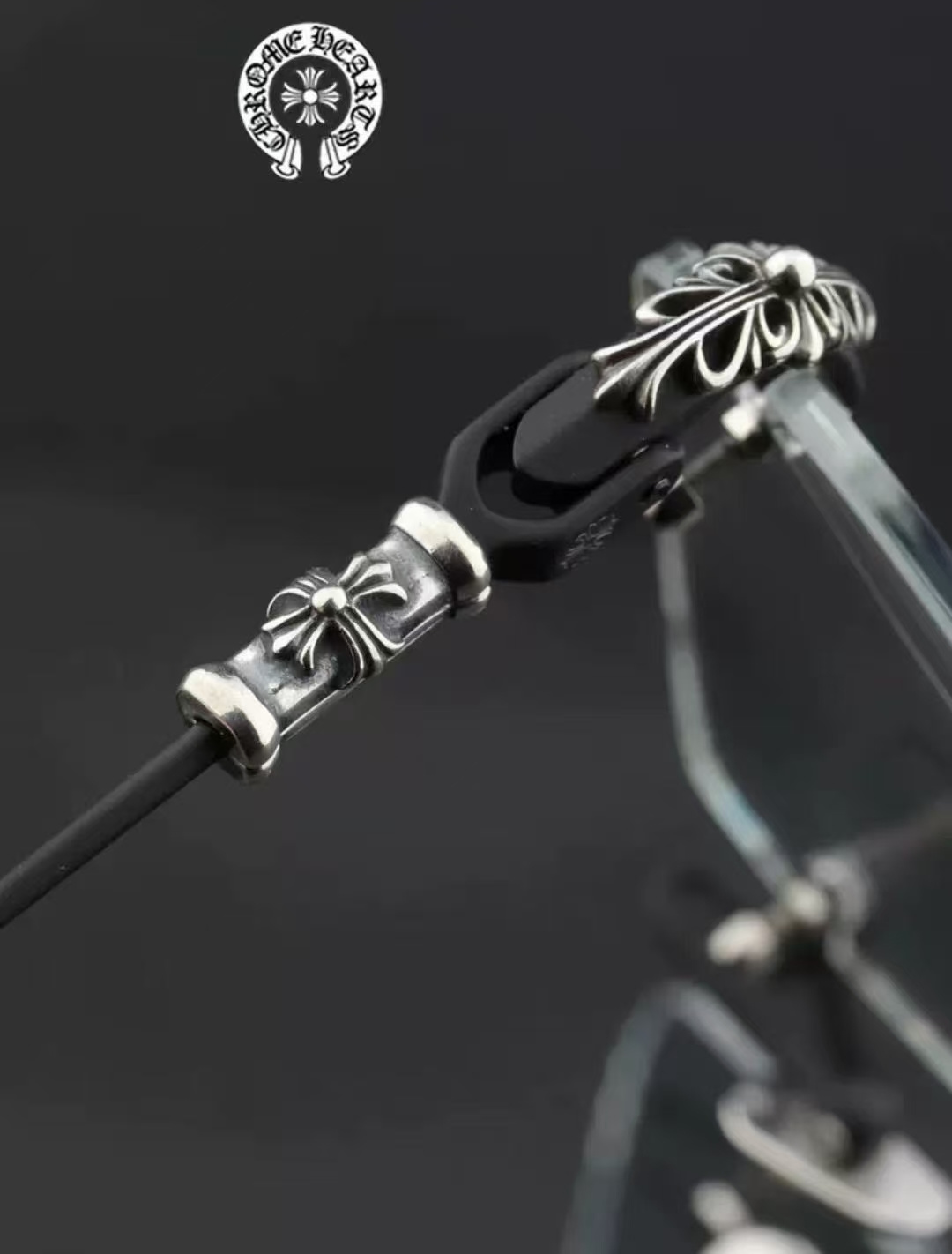 這款太陽眼鏡是AAAAA 1:1 質量(非常棒). 使用了和原版一模一樣的材料. 商標部分也保持了和鉻心/Chrome Hearts一樣. 圖片拍攝是實物太陽眼鏡拍攝, 您所收到的實物保證和我們圖片一模一樣.