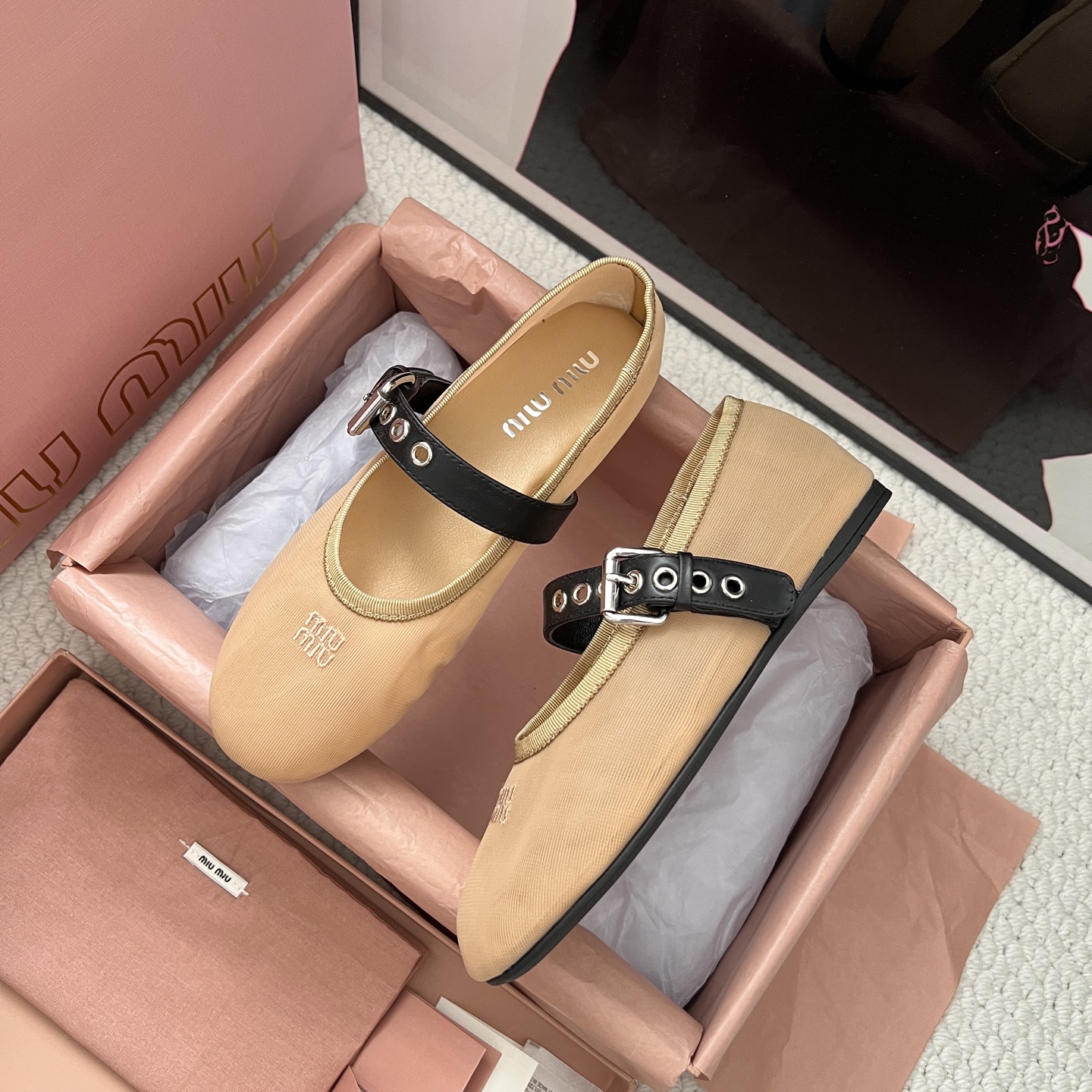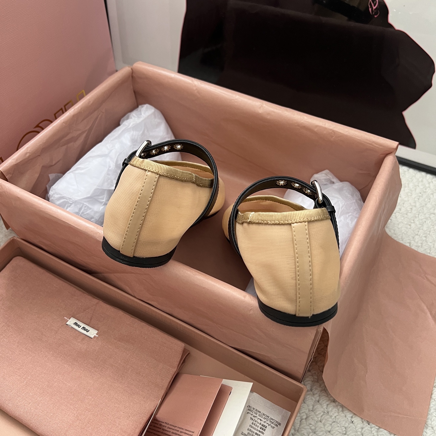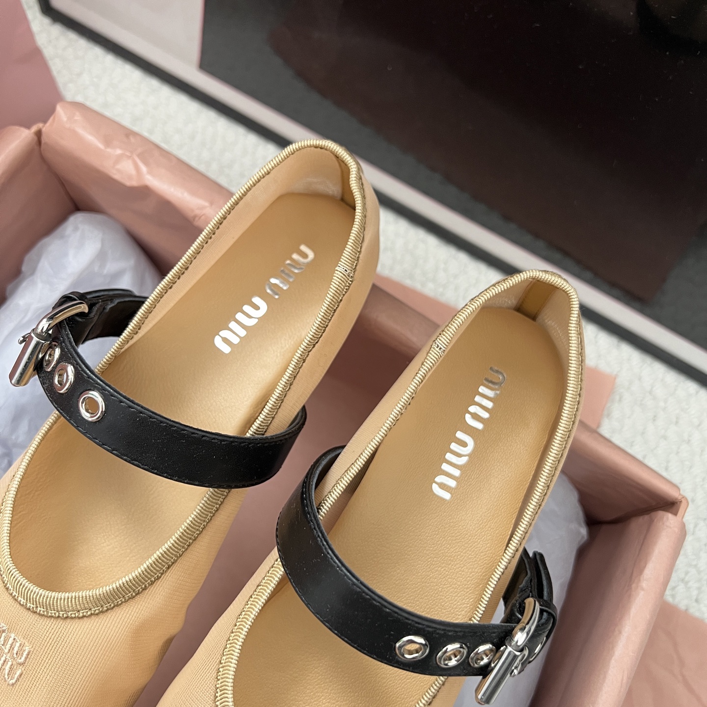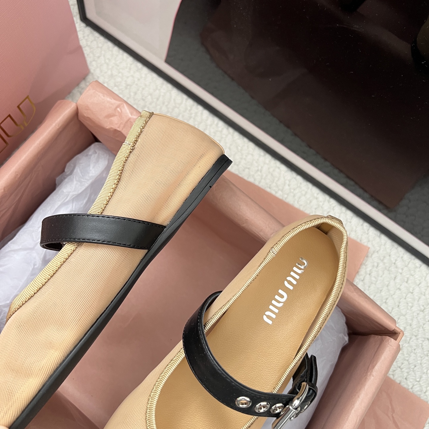 這款鞋子是AAAAA 1:1 質量(非常棒). 使用了和原版一模一樣的材料. 商標部分也保持了和繆繆/Miu Miu一樣. 圖片拍攝是實物鞋子拍攝, 您所收到的實物保證和我們圖片一模一樣.