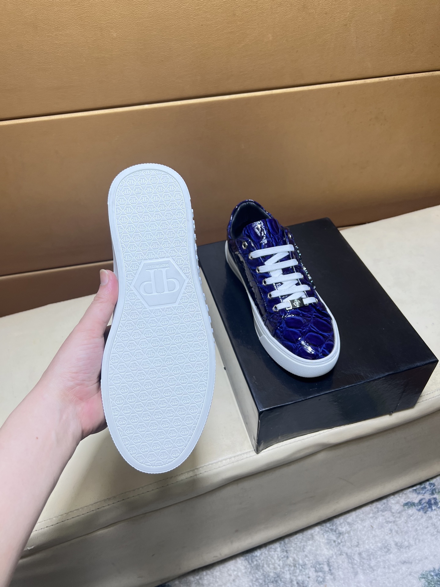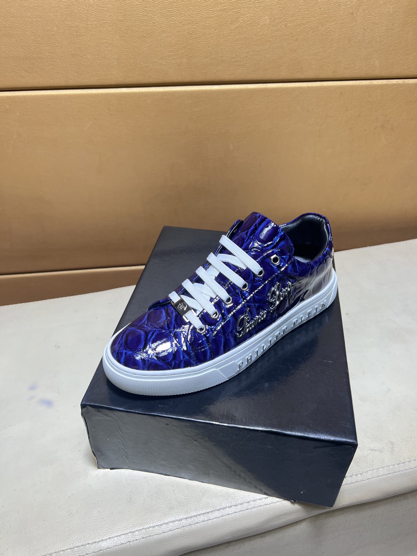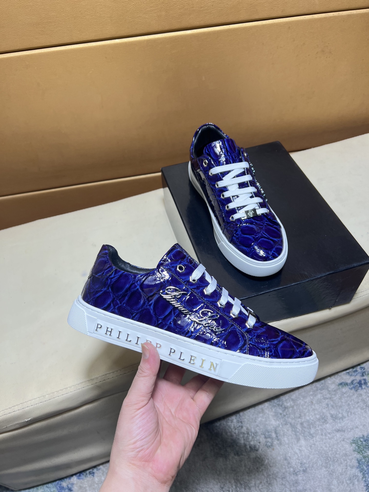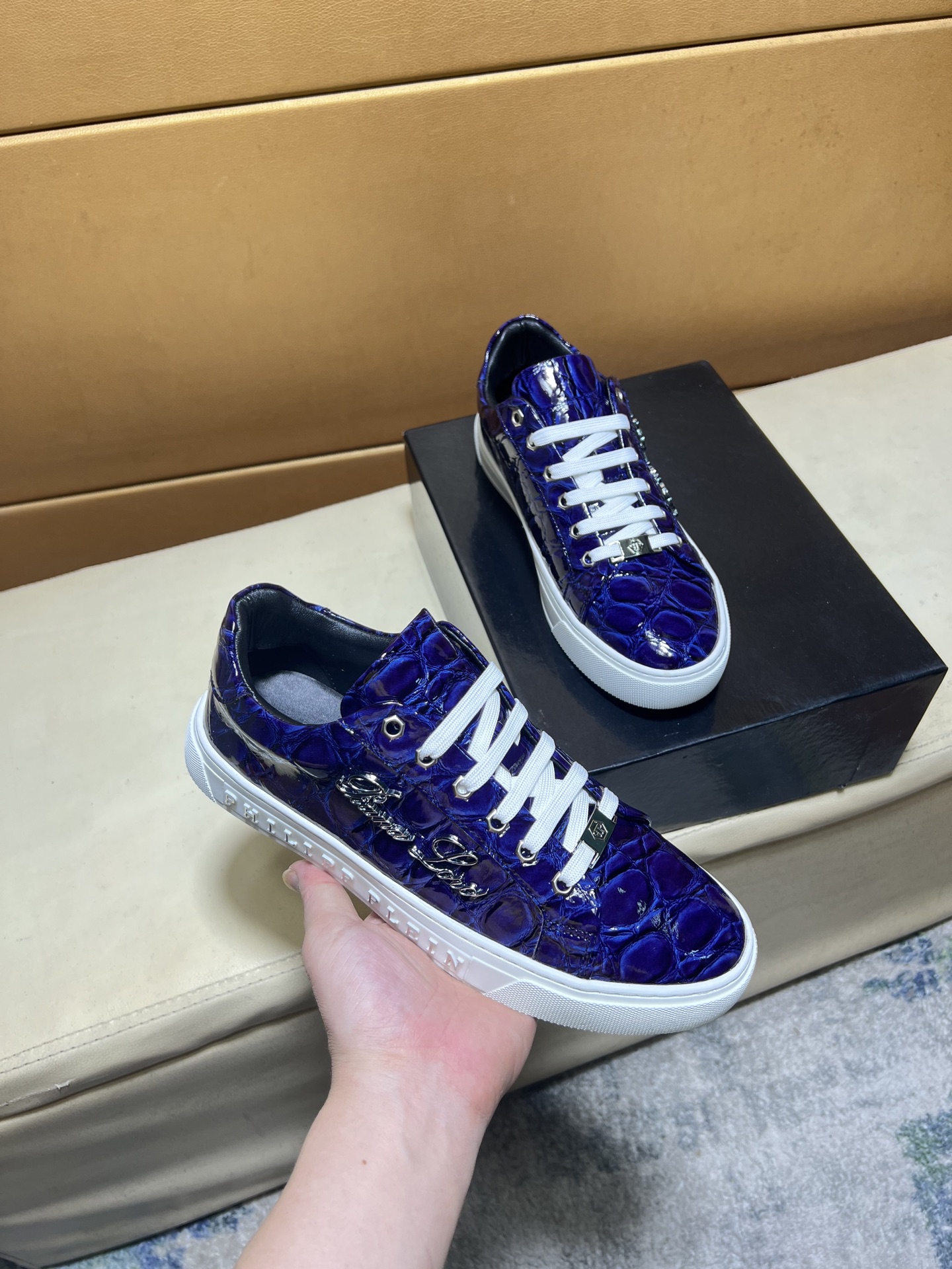 這款鞋子是AAAAA 1:1 質量(非常棒). 使用了和原版一模一樣的材料. 商標部分也保持了和菲利普·普林/Philipp Plein一樣. 圖片拍攝是實物鞋子拍攝, 您所收到的實物保證和我們圖片一模一樣.