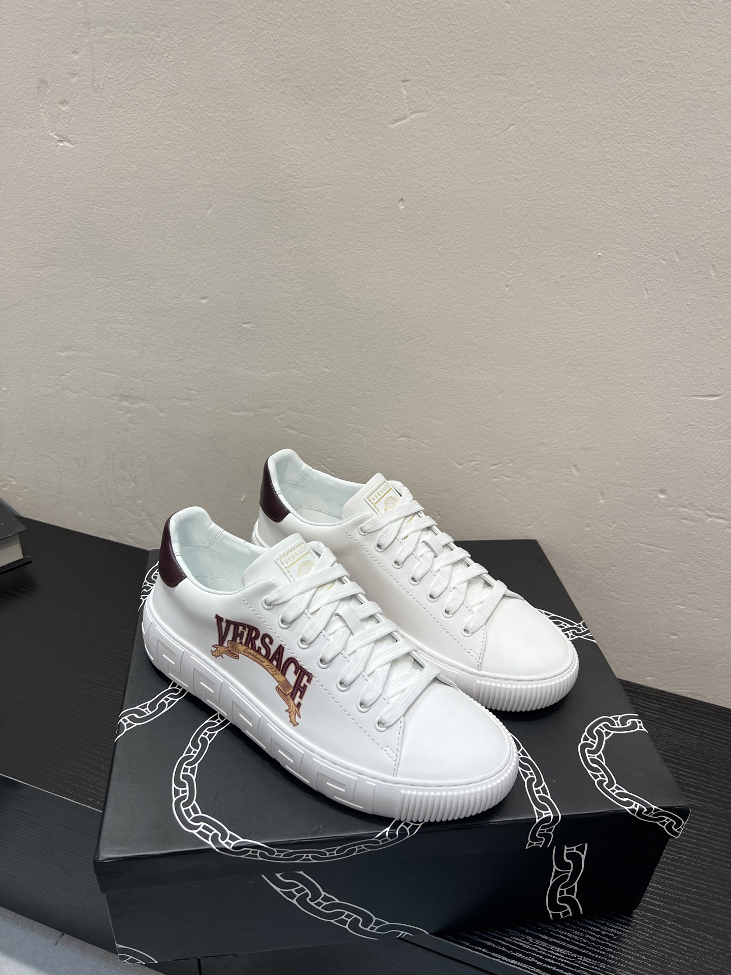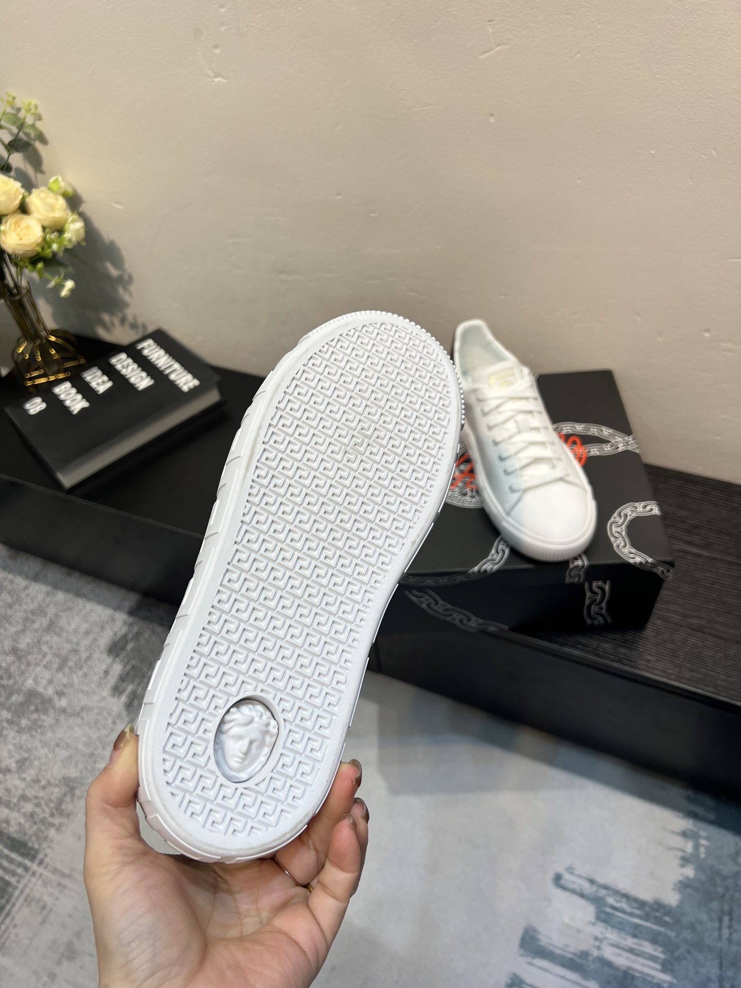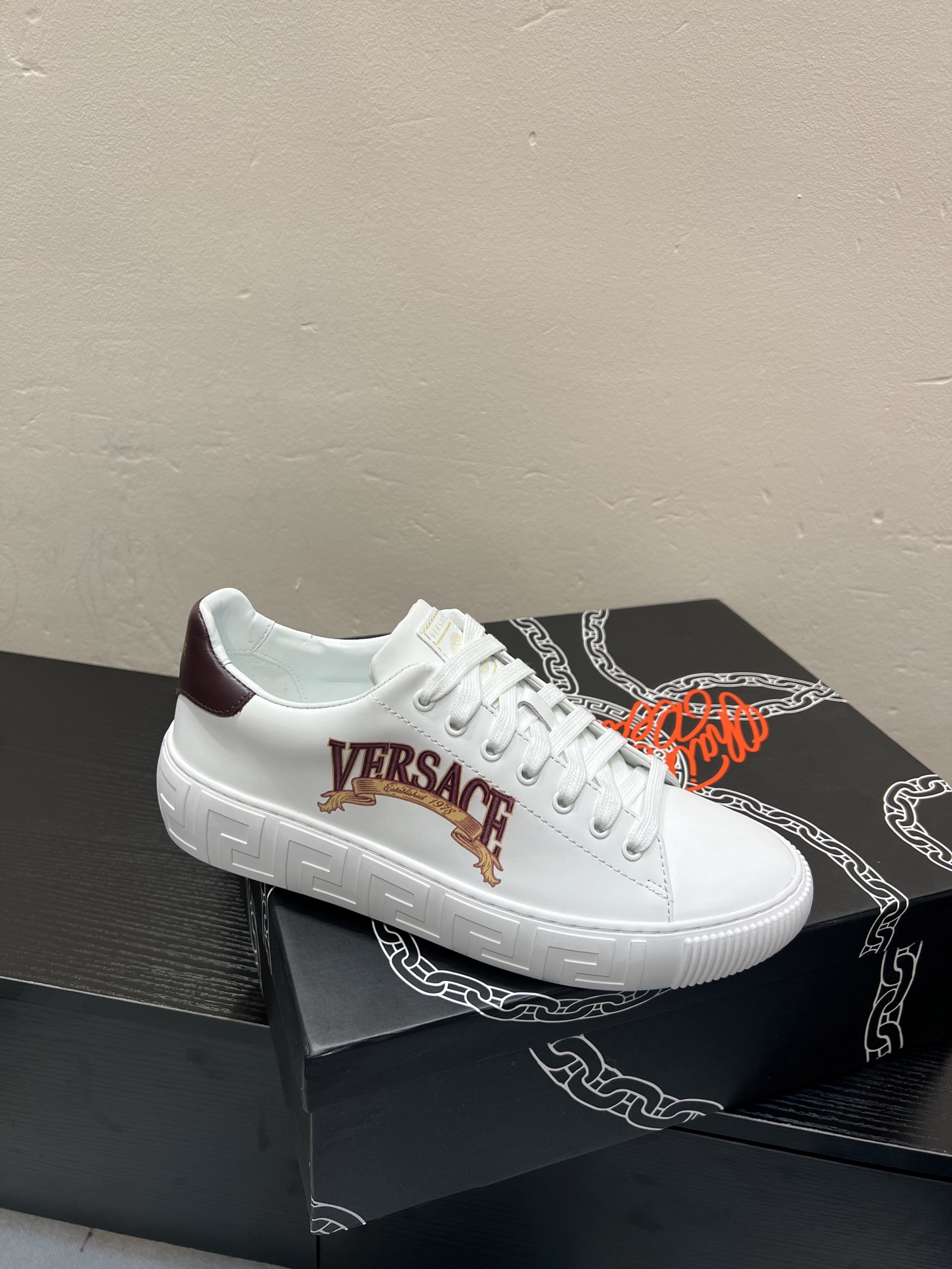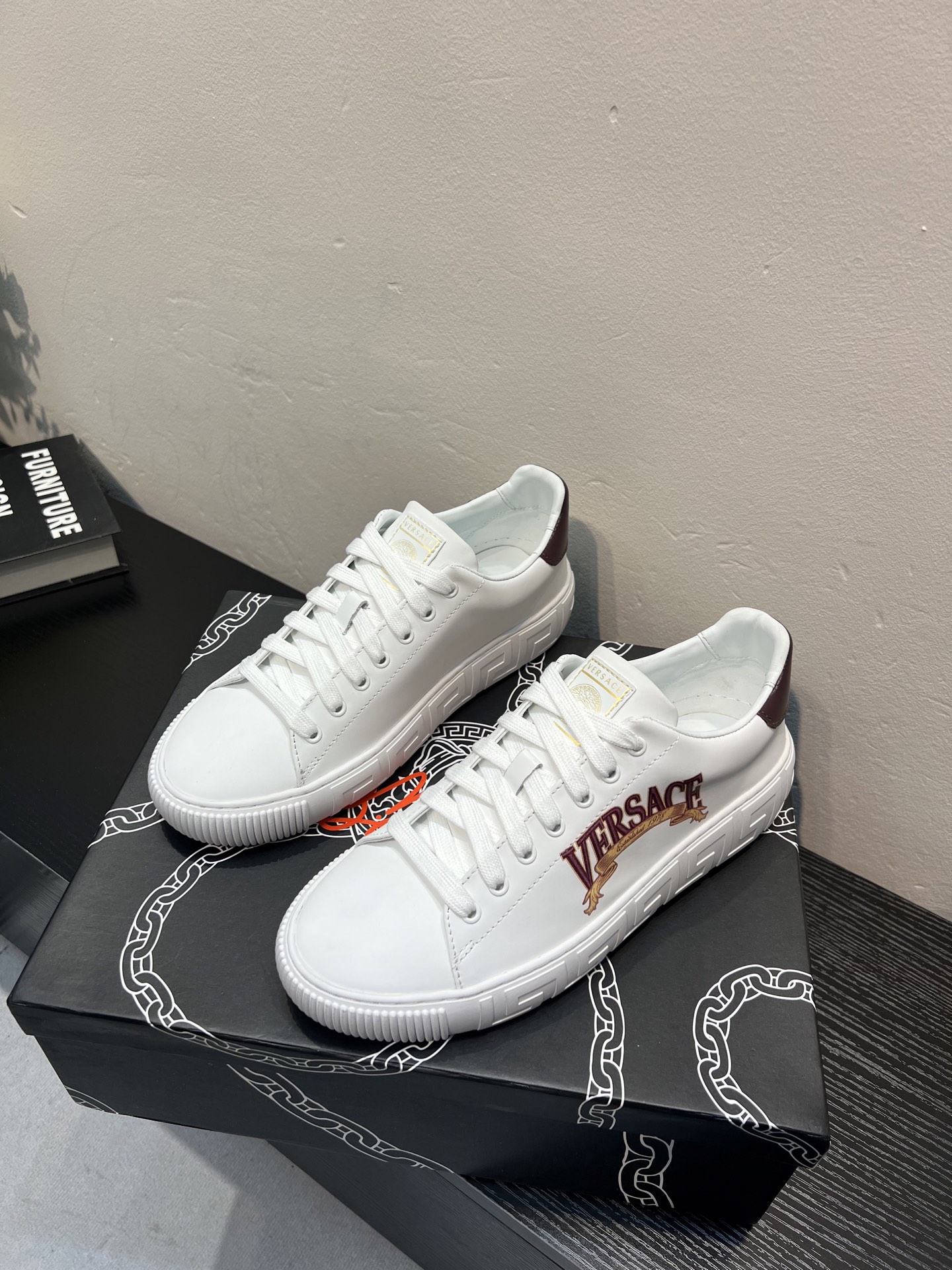 這款鞋子是AAAAA 1:1 質量(非常棒). 使用了和原版一模一樣的材料. 商標部分也保持了和范思哲/Versace一樣. 圖片拍攝是實物鞋子拍攝, 您所收到的實物保證和我們圖片一模一樣.