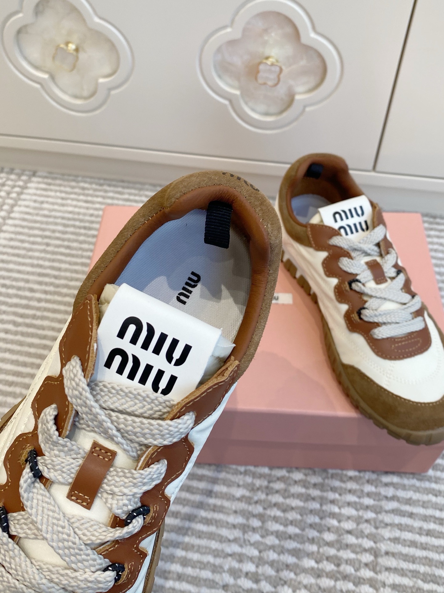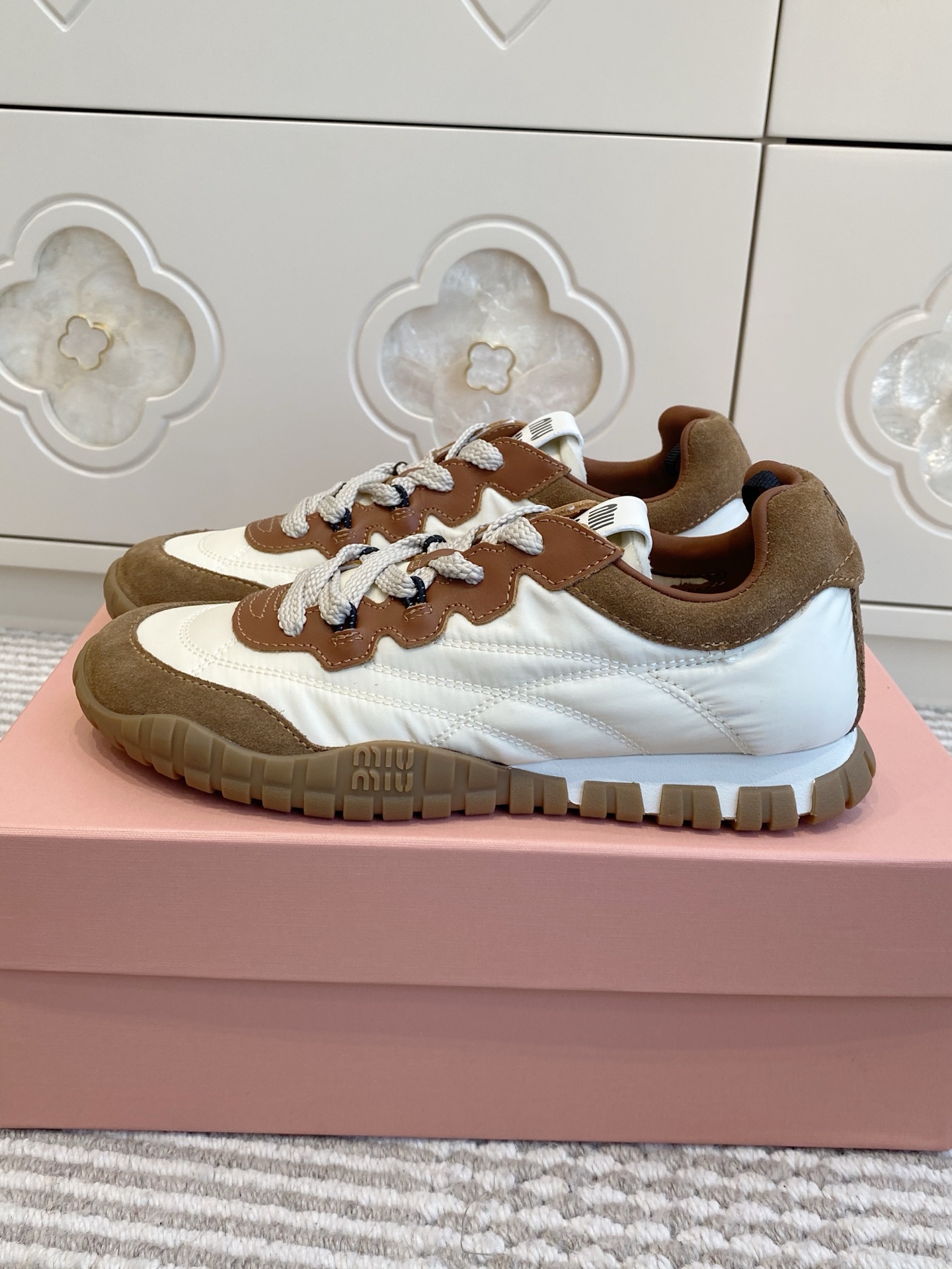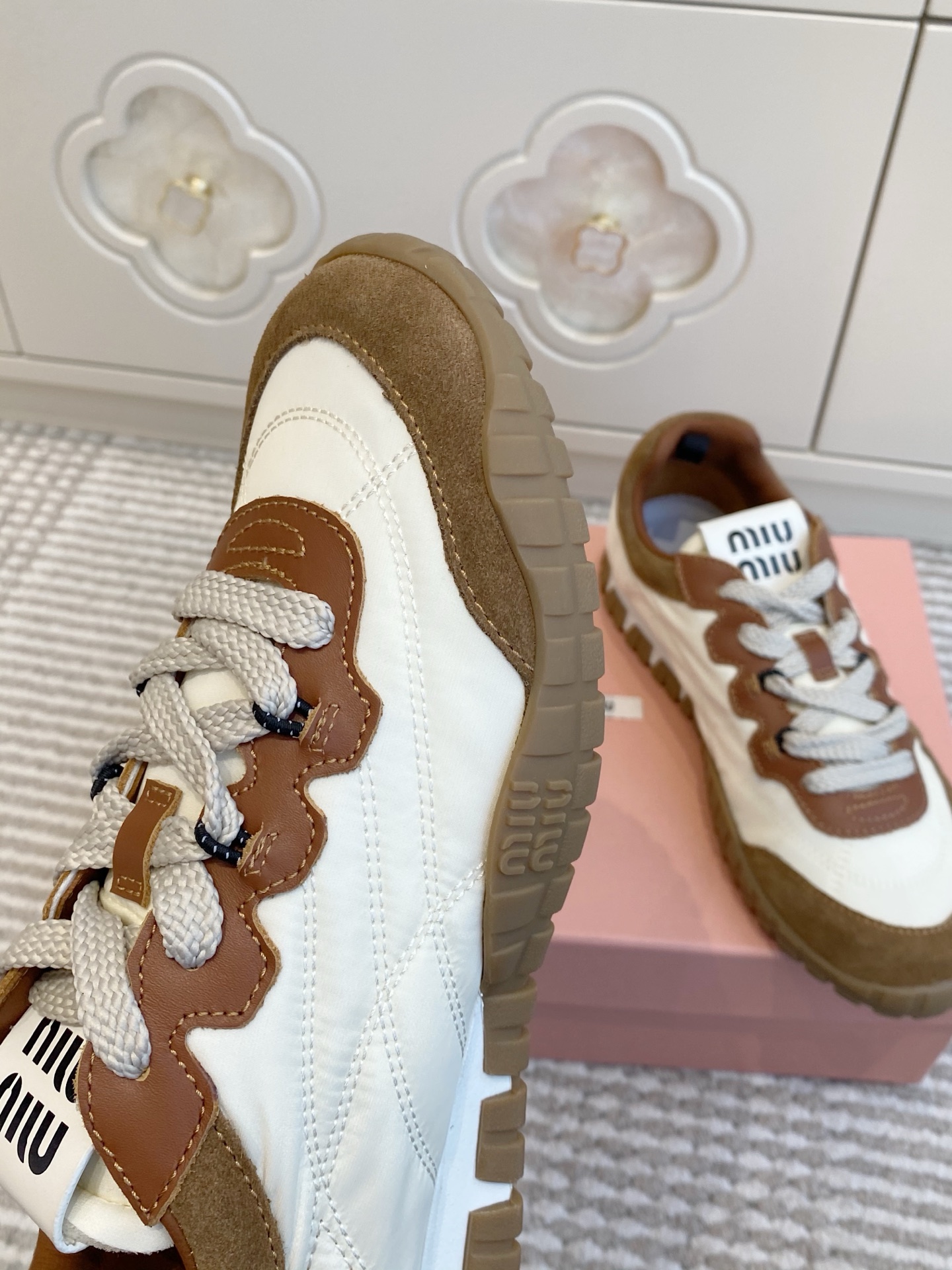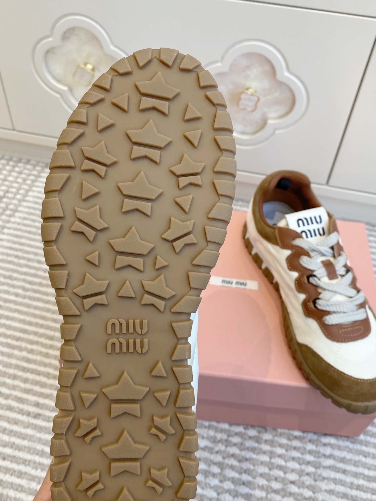 這款鞋子是AAAAA 1:1 質量(非常棒). 使用了和原版一模一樣的材料. 商標部分也保持了和繆繆/Miu Miu一樣. 圖片拍攝是實物鞋子拍攝, 您所收到的實物保證和我們圖片一模一樣.