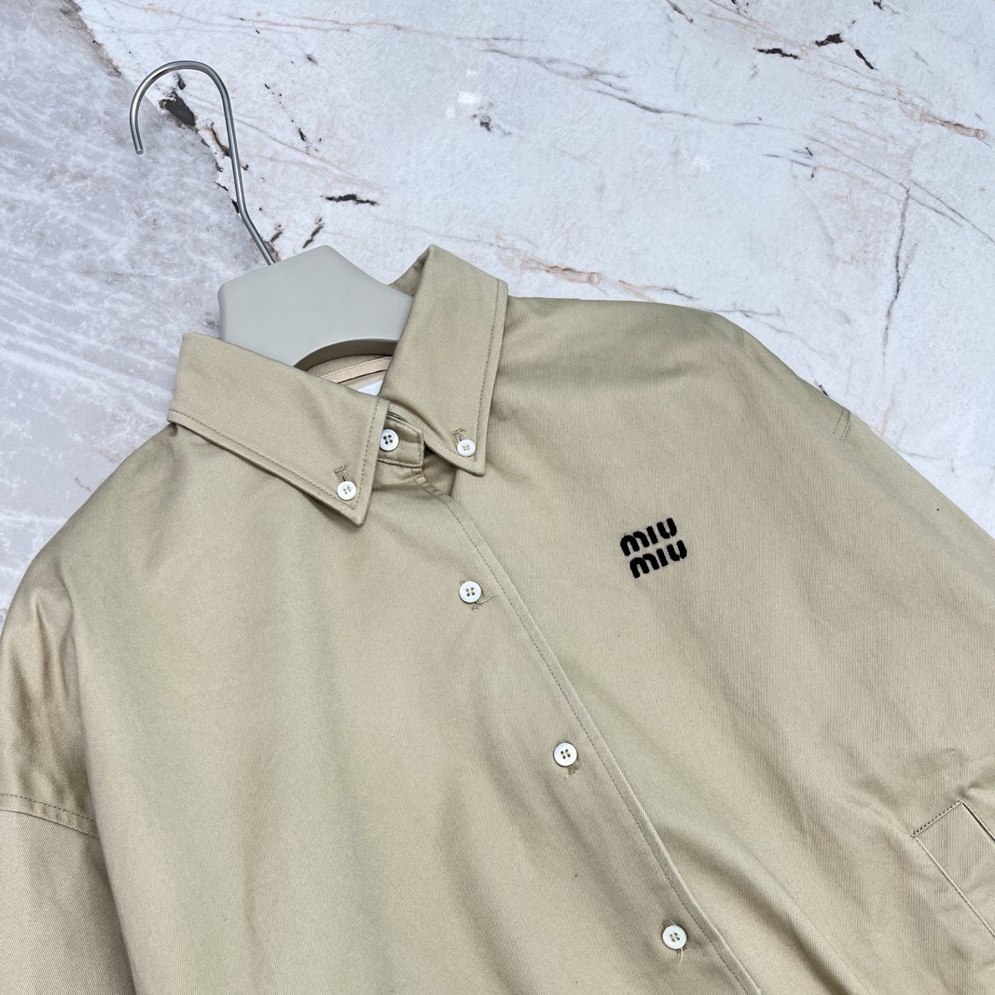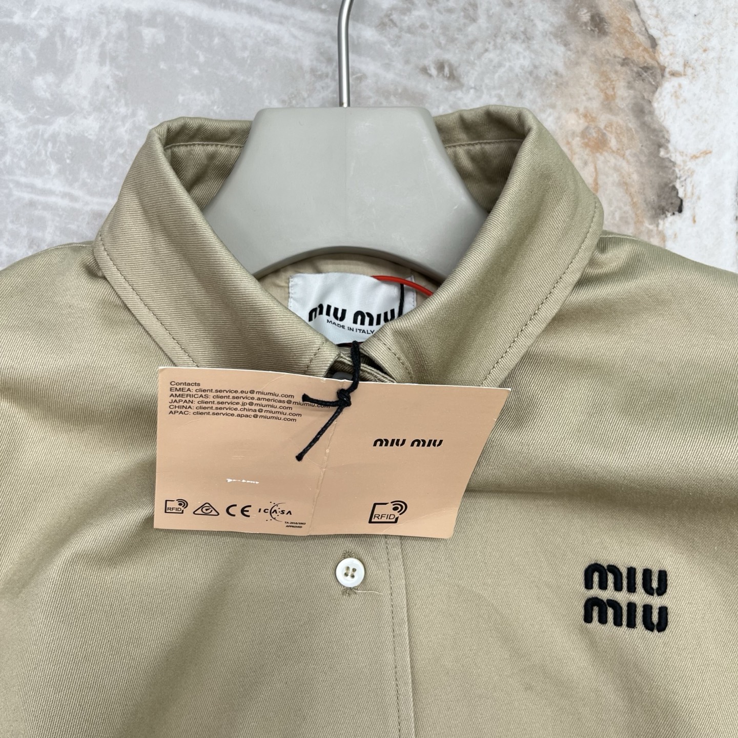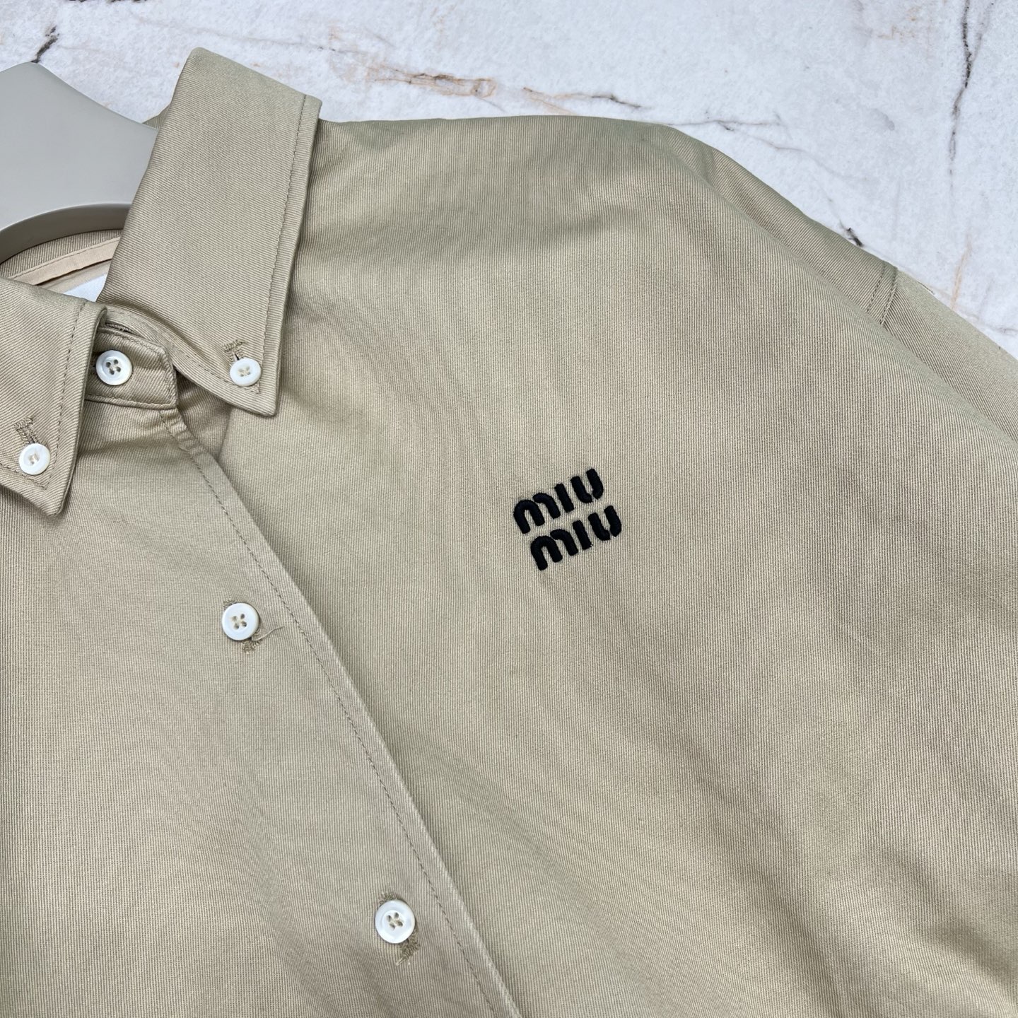 這款衣服是AAAAA 1:1 質量(非常棒). 使用了和原版一模一樣的材料. 商標部分也保持了和繆繆/Miu Miu一樣. 圖片拍攝是實物衣服拍攝, 您所收到的實物保證和我們圖片一模一樣.