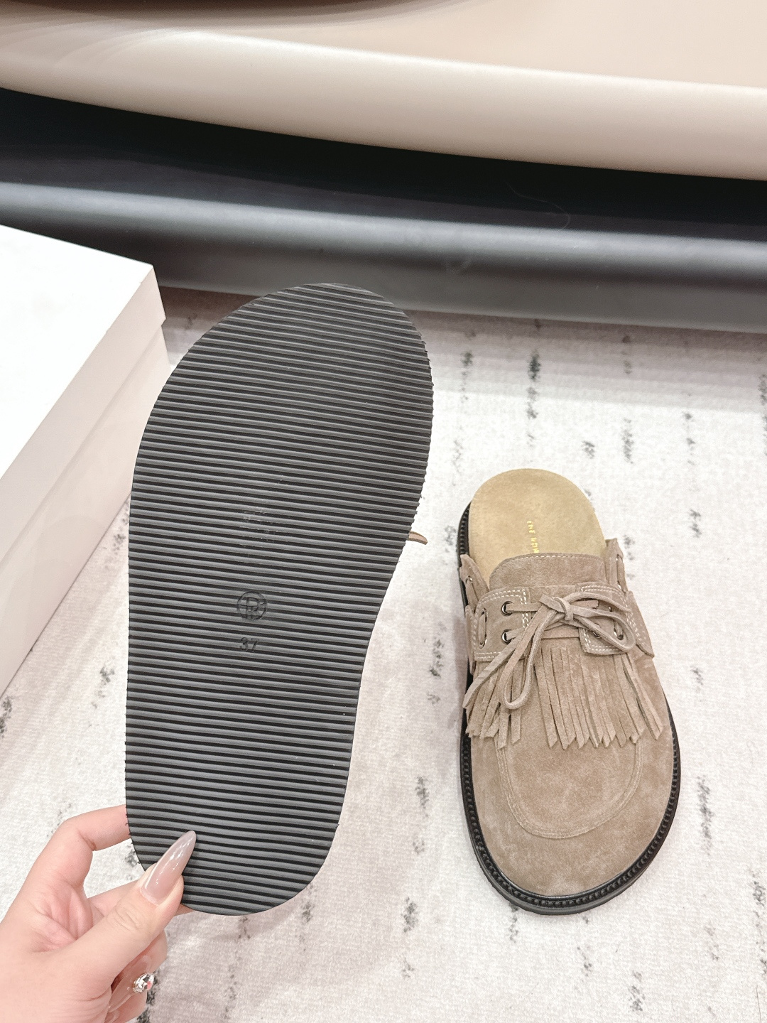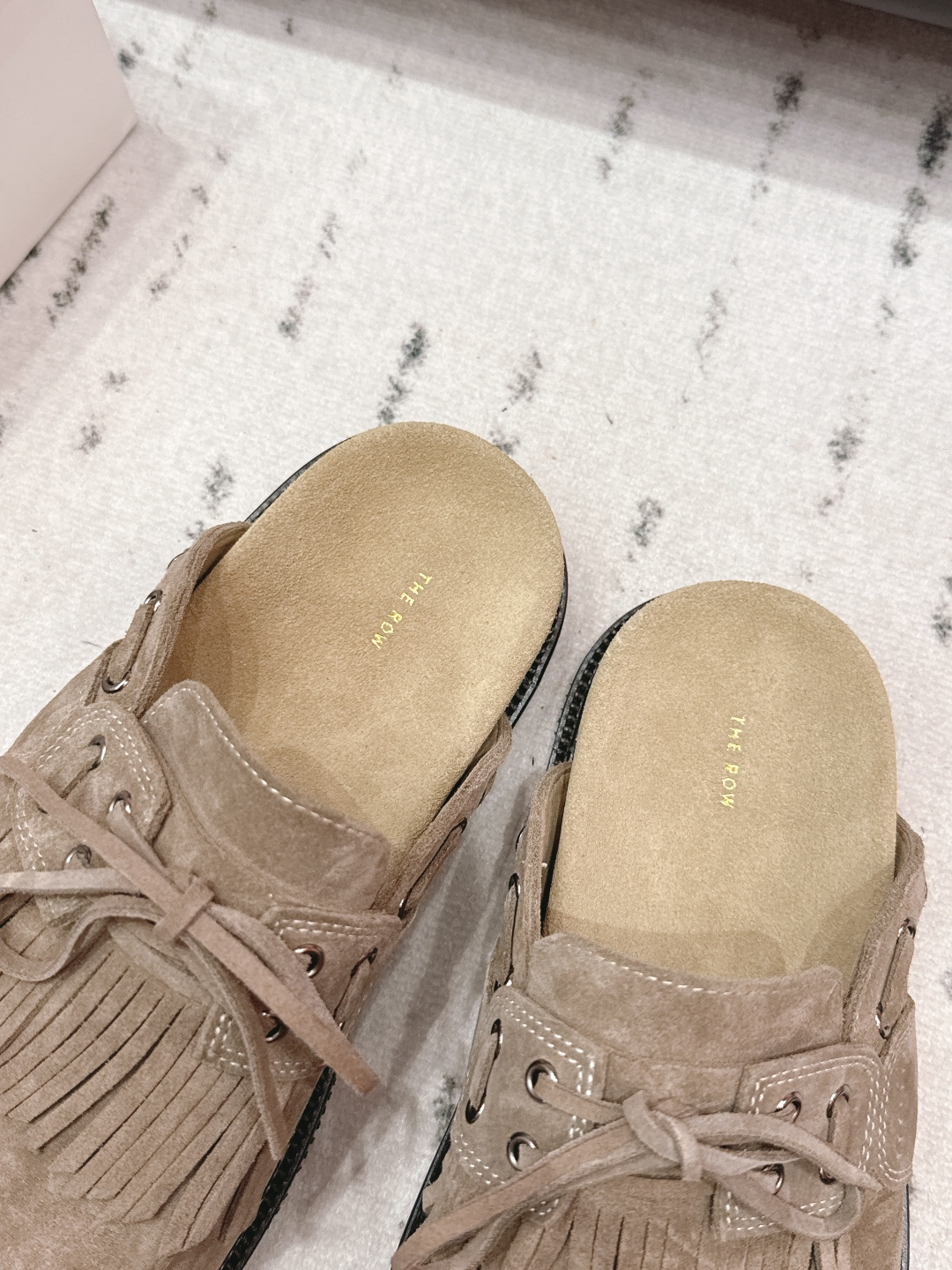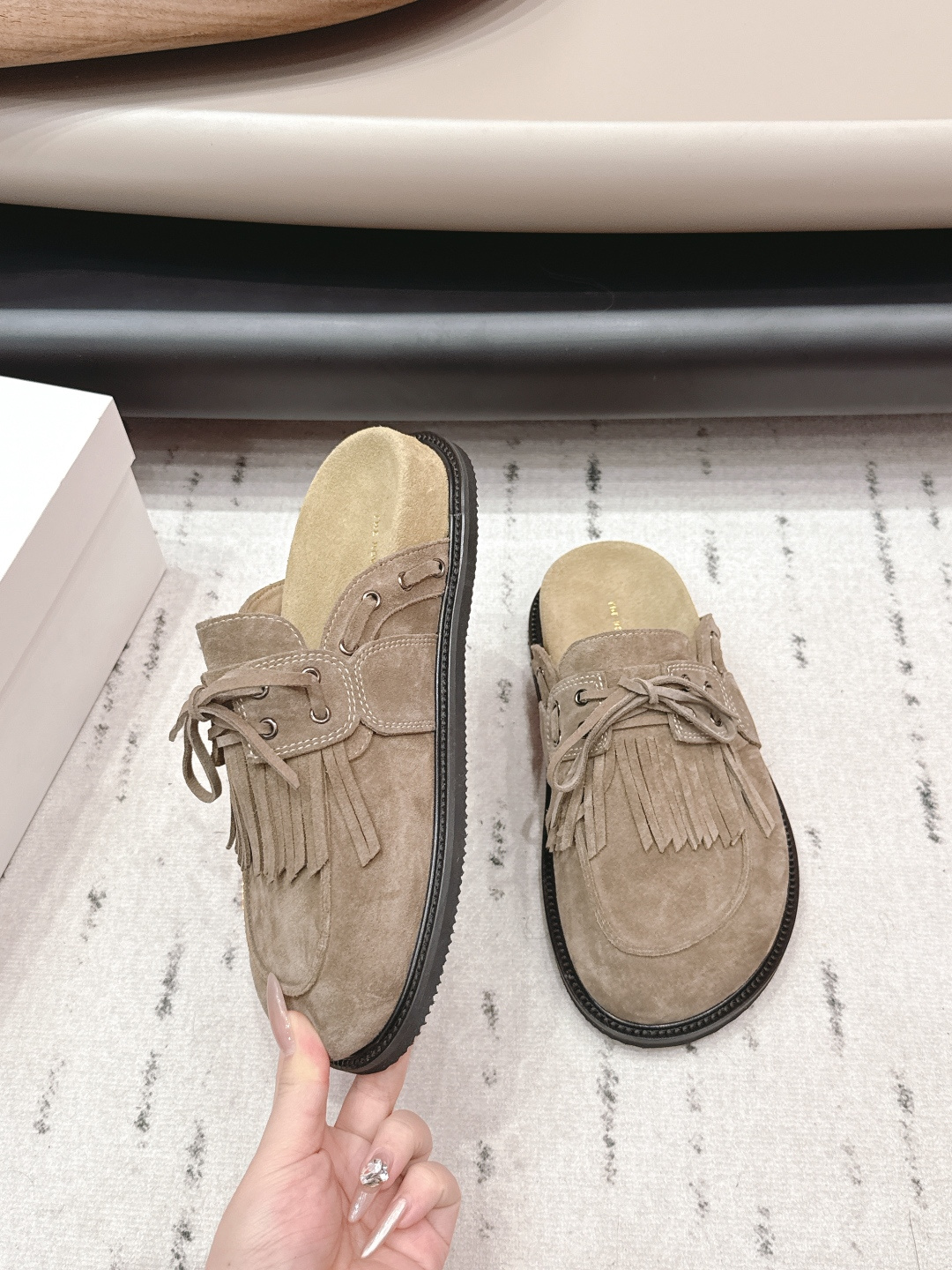 這款鞋子是AAAAA 1:1 質量(非常棒). 使用了和原版一模一樣的材料. 商標部分也保持了和The Row一樣. 圖片拍攝是實物鞋子拍攝, 您所收到的實物保證和我們圖片一模一樣.