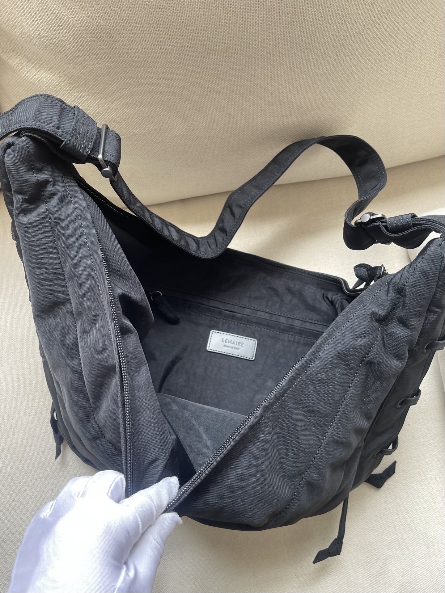 這款包包是AAAAA 1:1 質量(非常棒). 使用了和原版一模一樣的材料. 商標部分也保持了和Lemaire一樣. 圖片拍攝是實物包包拍攝, 您所收到的實物保證和我們圖片一模一樣.