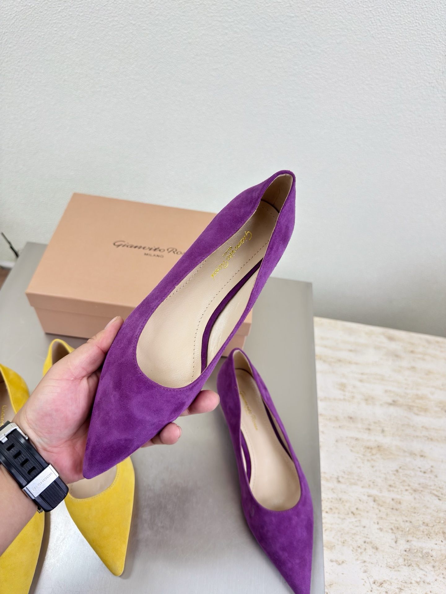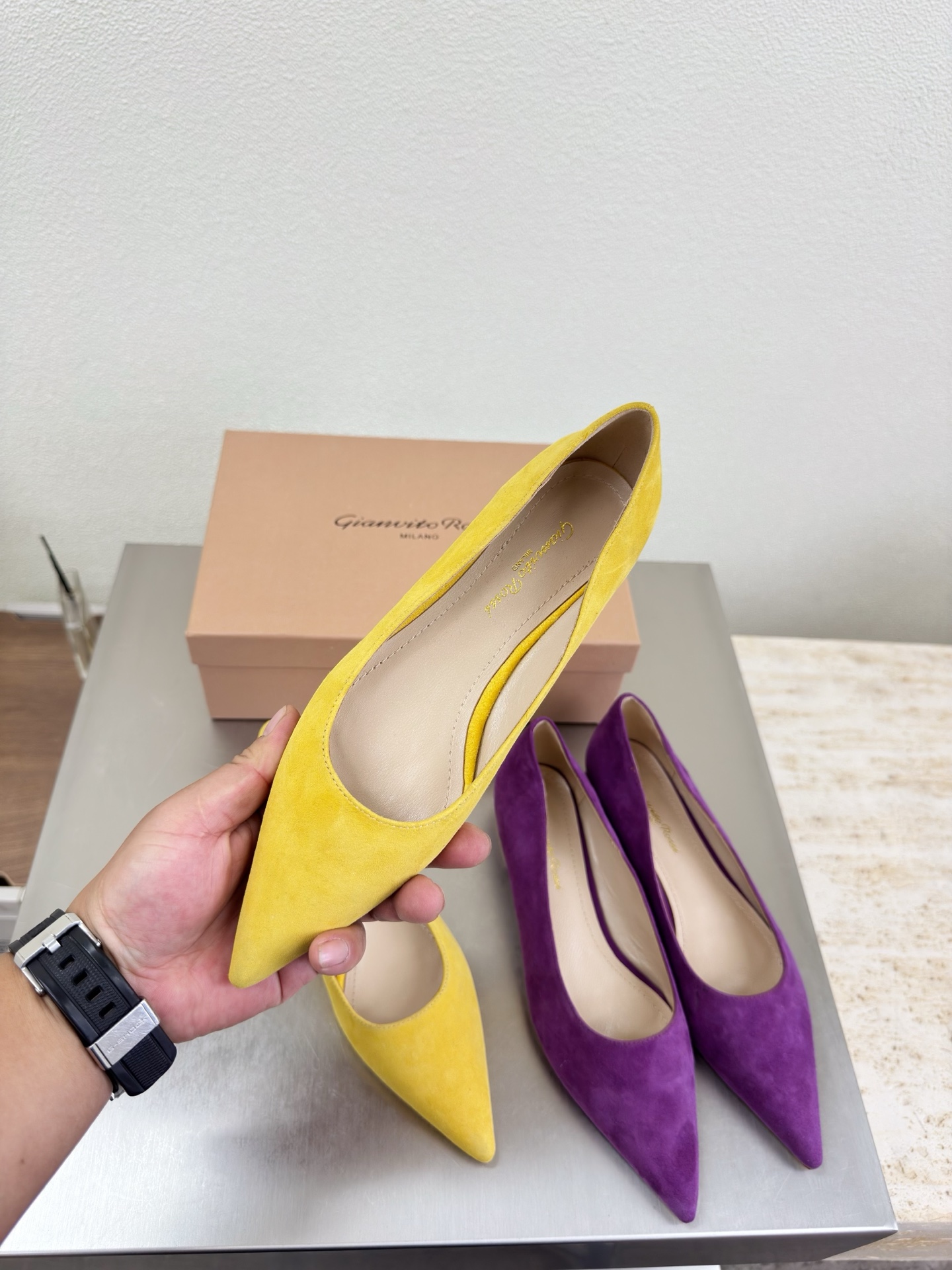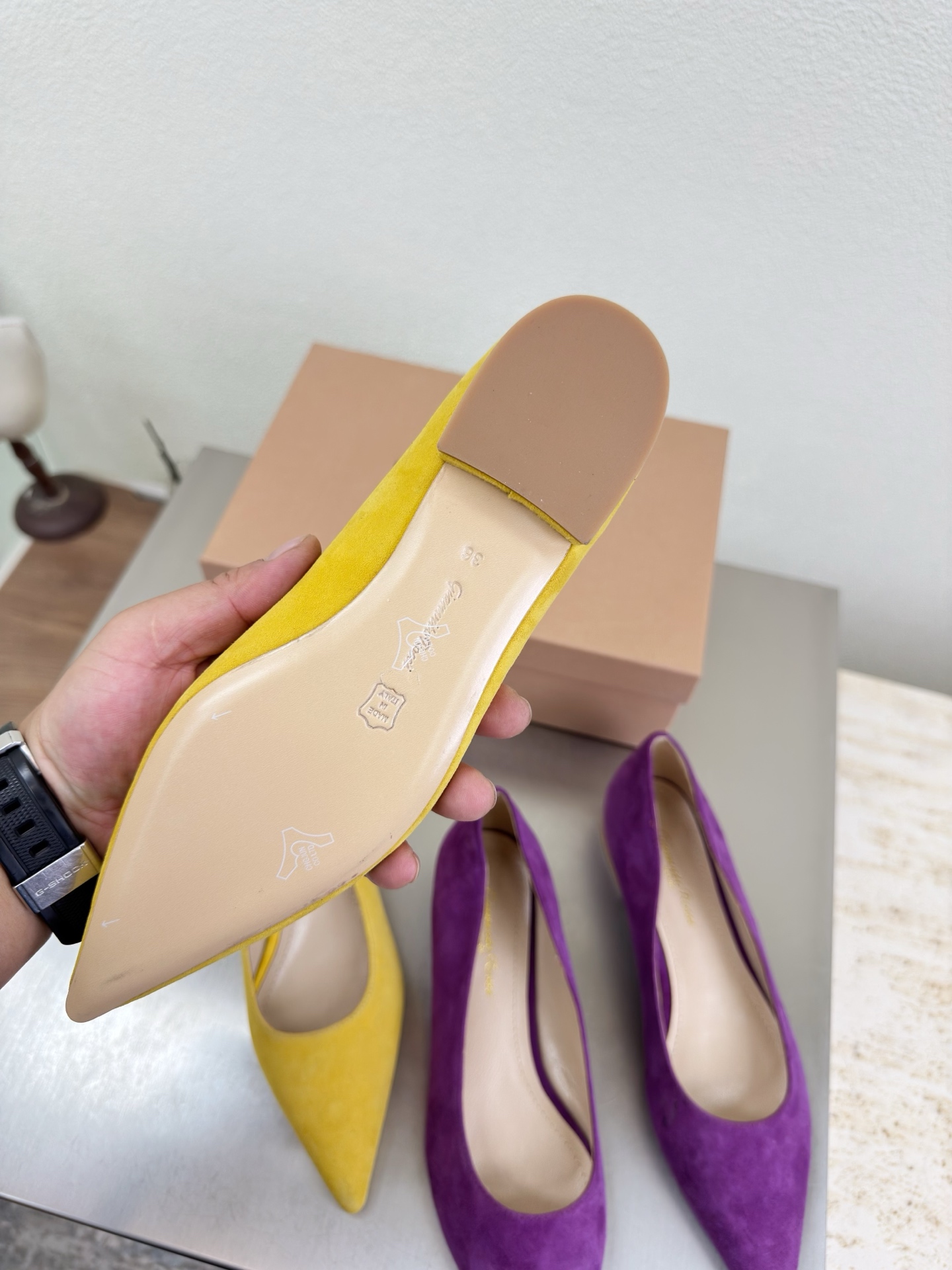 這款鞋子是AAAAA 1:1 質量(非常棒). 使用了和原版一模一樣的材料. 商標部分也保持了和Gianvito Rossi一樣. 圖片拍攝是實物鞋子拍攝, 您所收到的實物保證和我們圖片一模一樣.