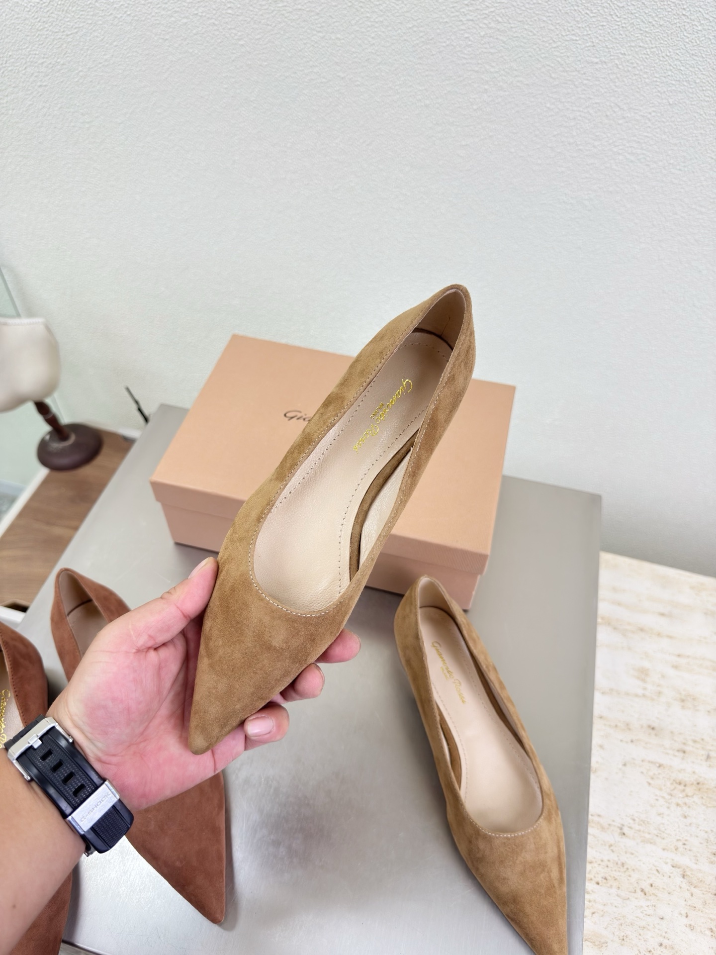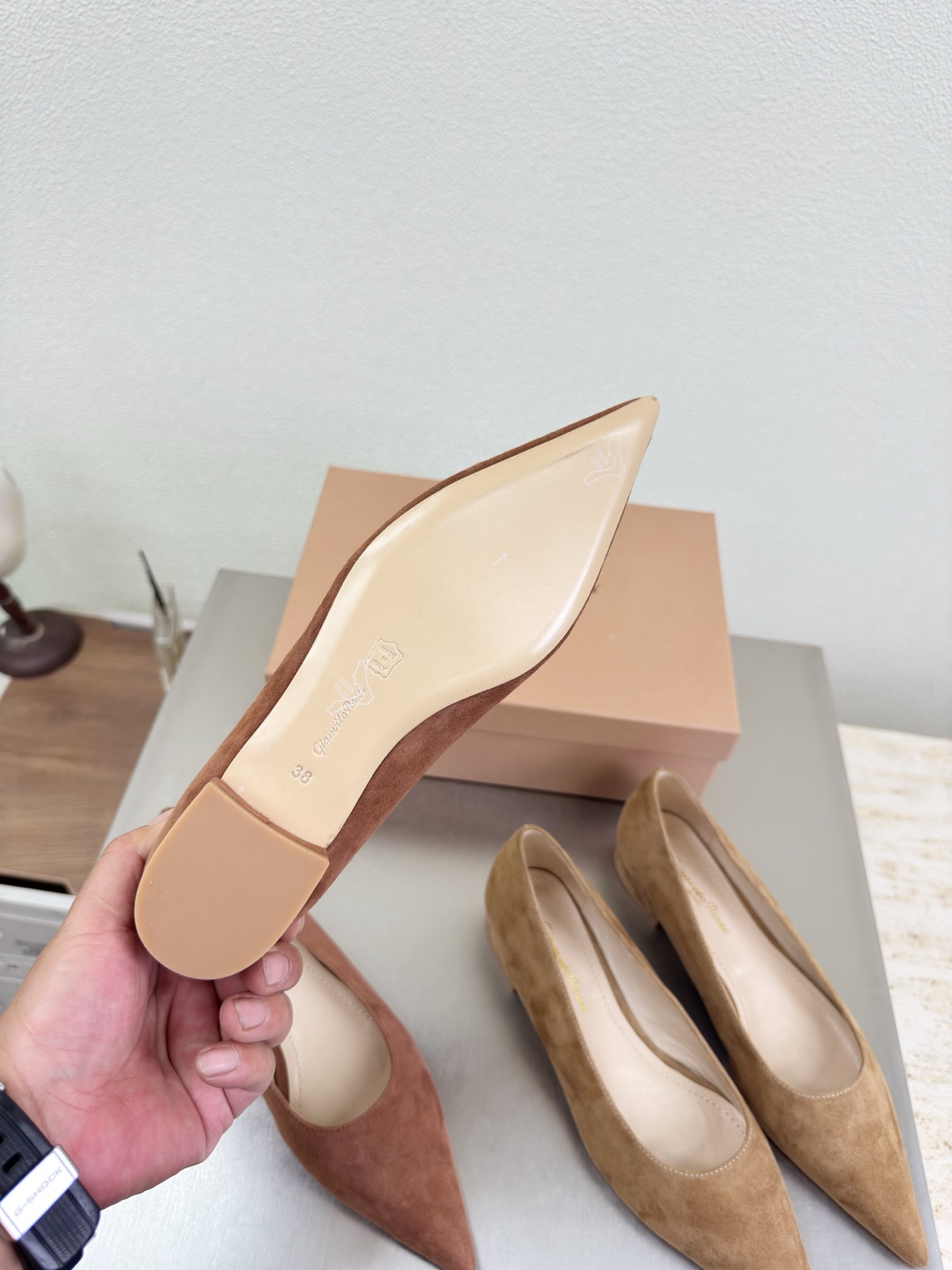 這款鞋子是AAAAA 1:1 質量(非常棒). 使用了和原版一模一樣的材料. 商標部分也保持了和Gianvito Rossi一樣. 圖片拍攝是實物鞋子拍攝, 您所收到的實物保證和我們圖片一模一樣.