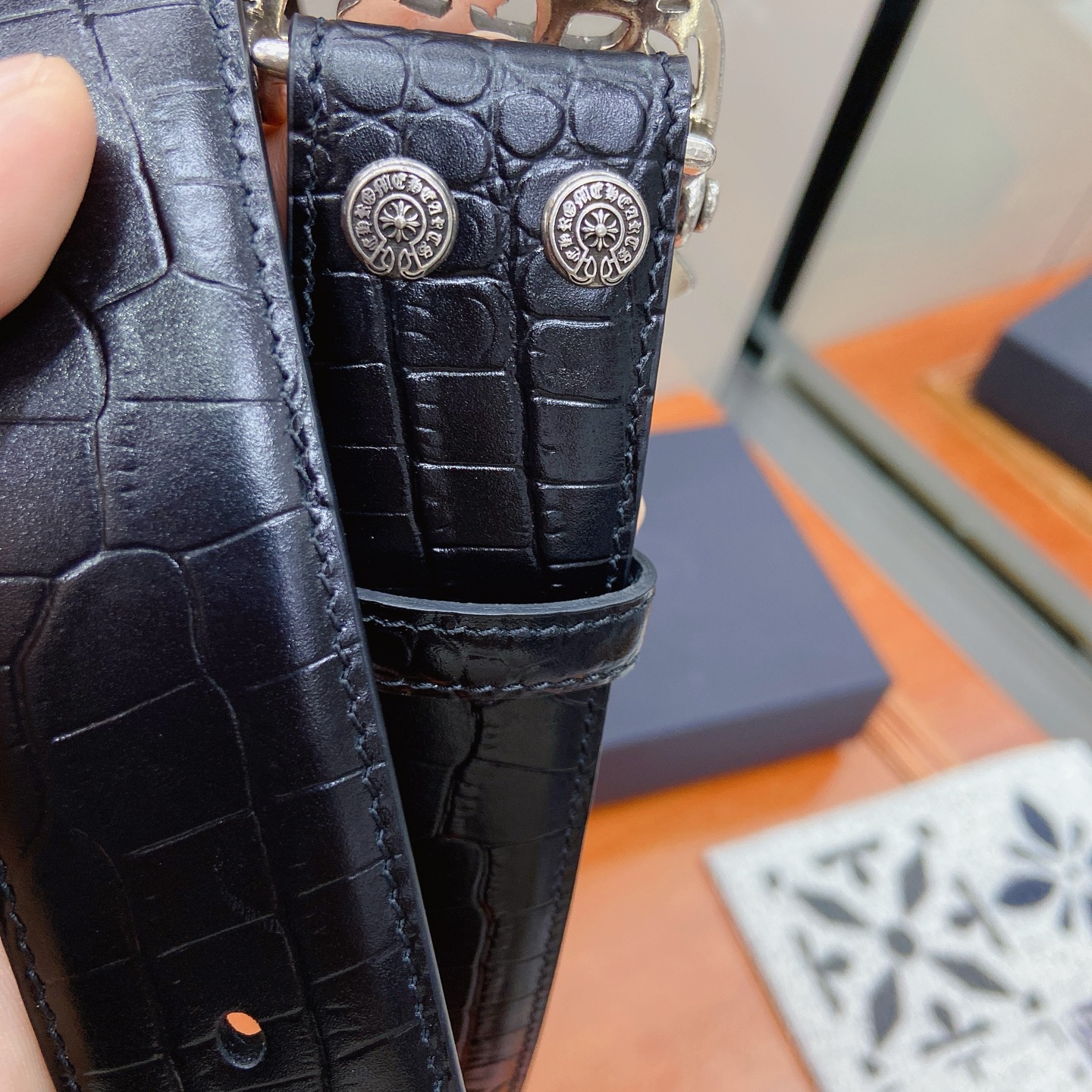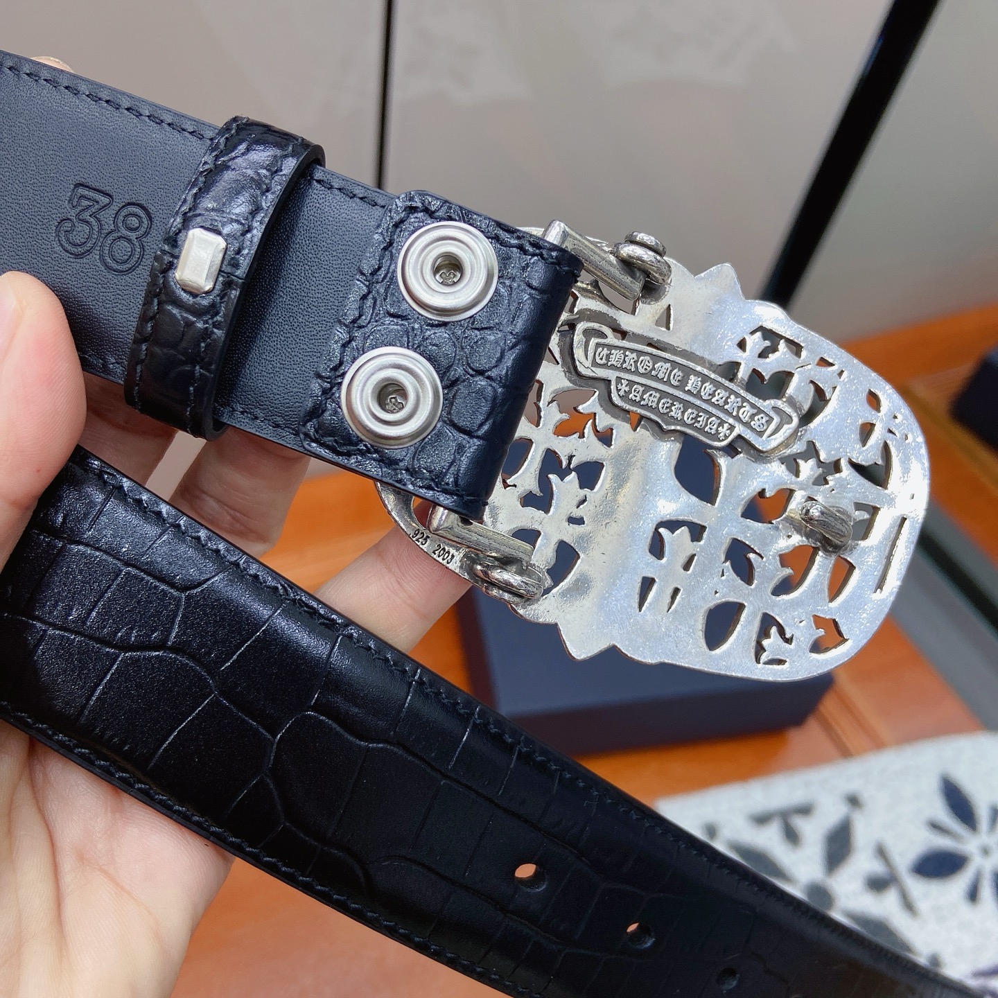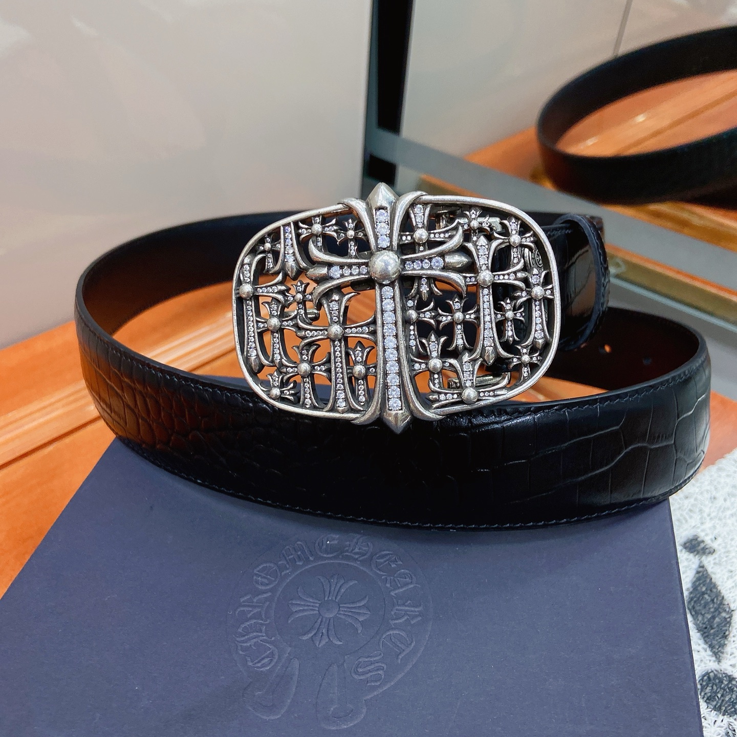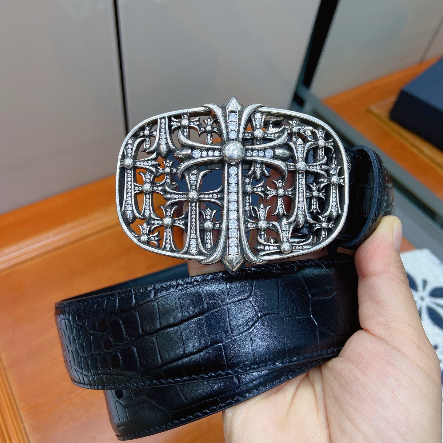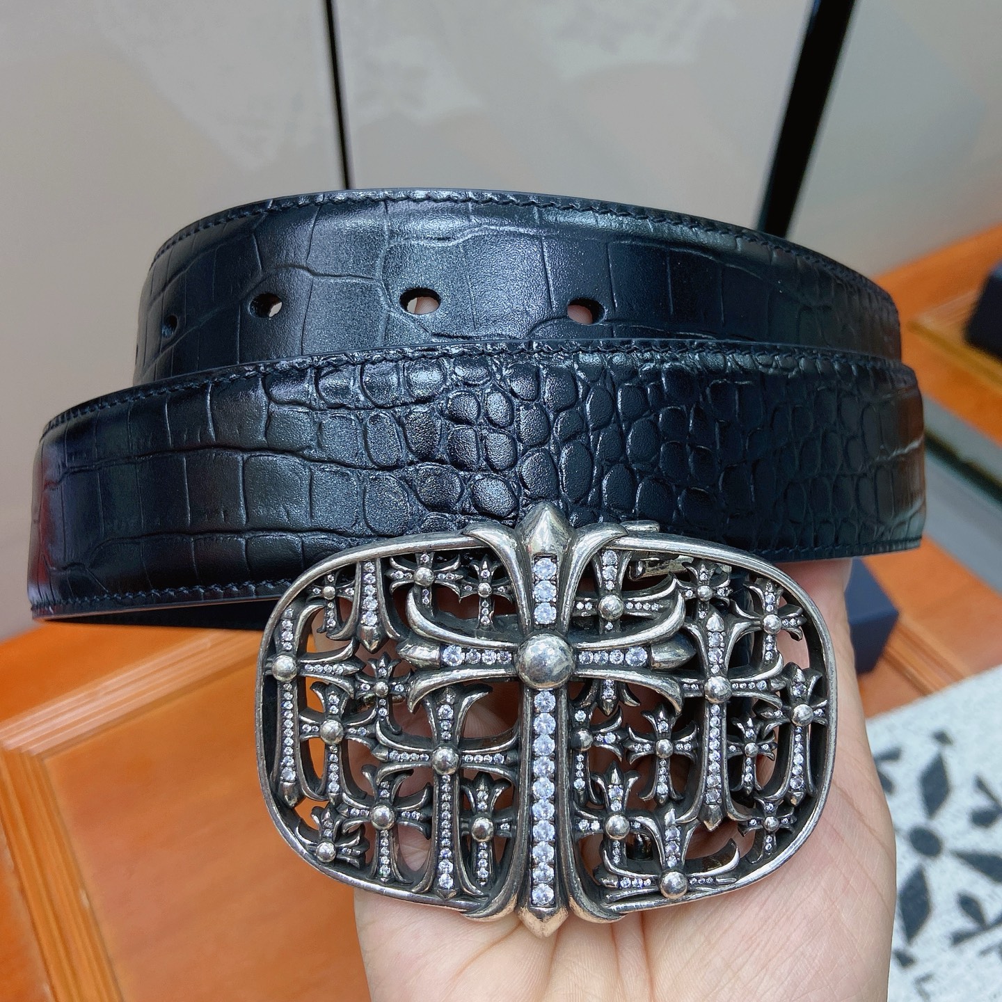 這款皮帶是AAAAA 1:1 質量(非常棒). 使用了和原版一模一樣的材料. 商標部分也保持了和鉻心/Chrome Hearts一樣. 圖片拍攝是實物皮帶拍攝, 您所收到的實物保證和我們圖片一模一樣.