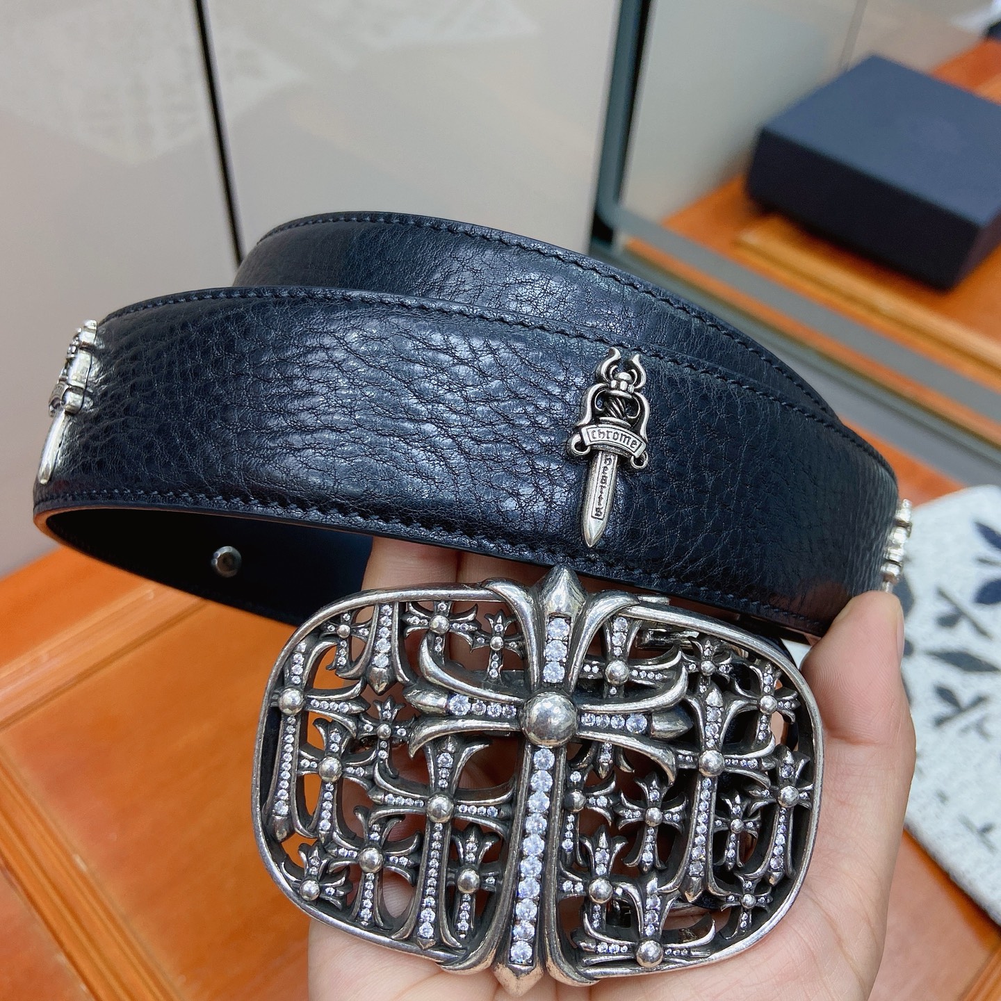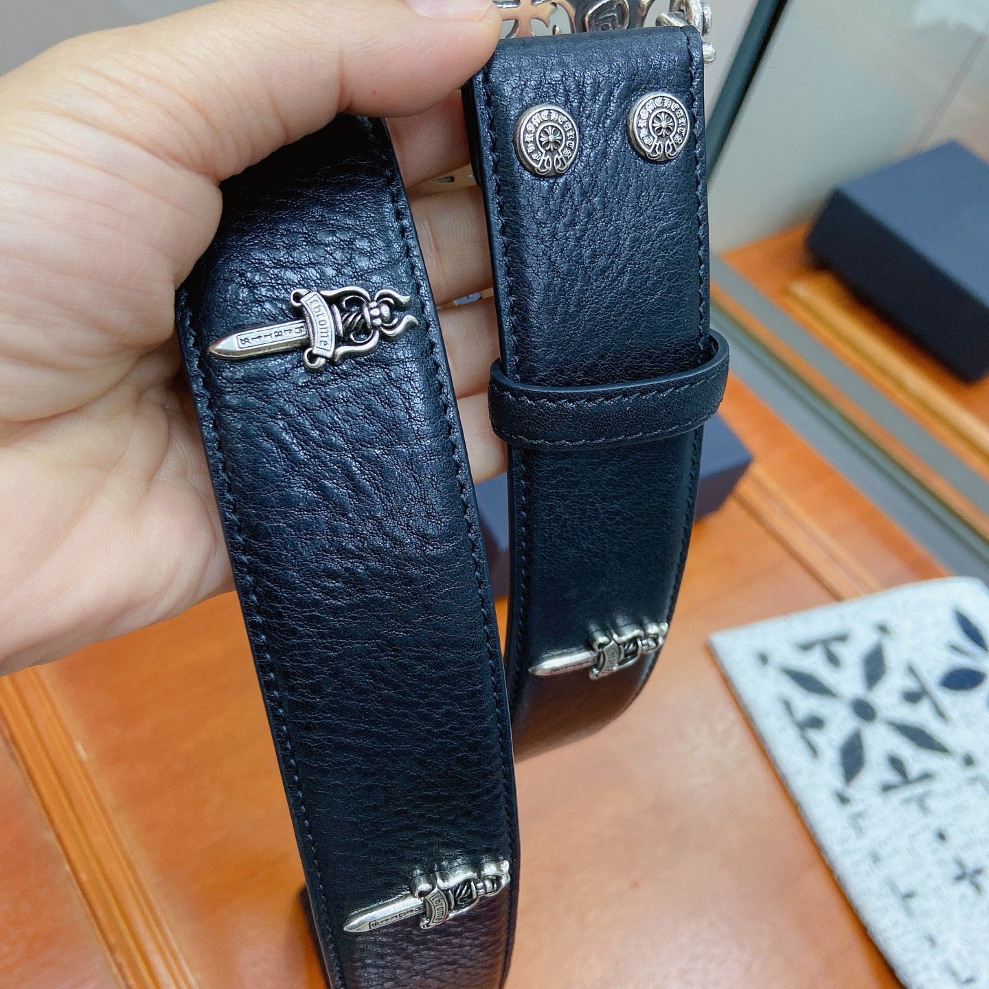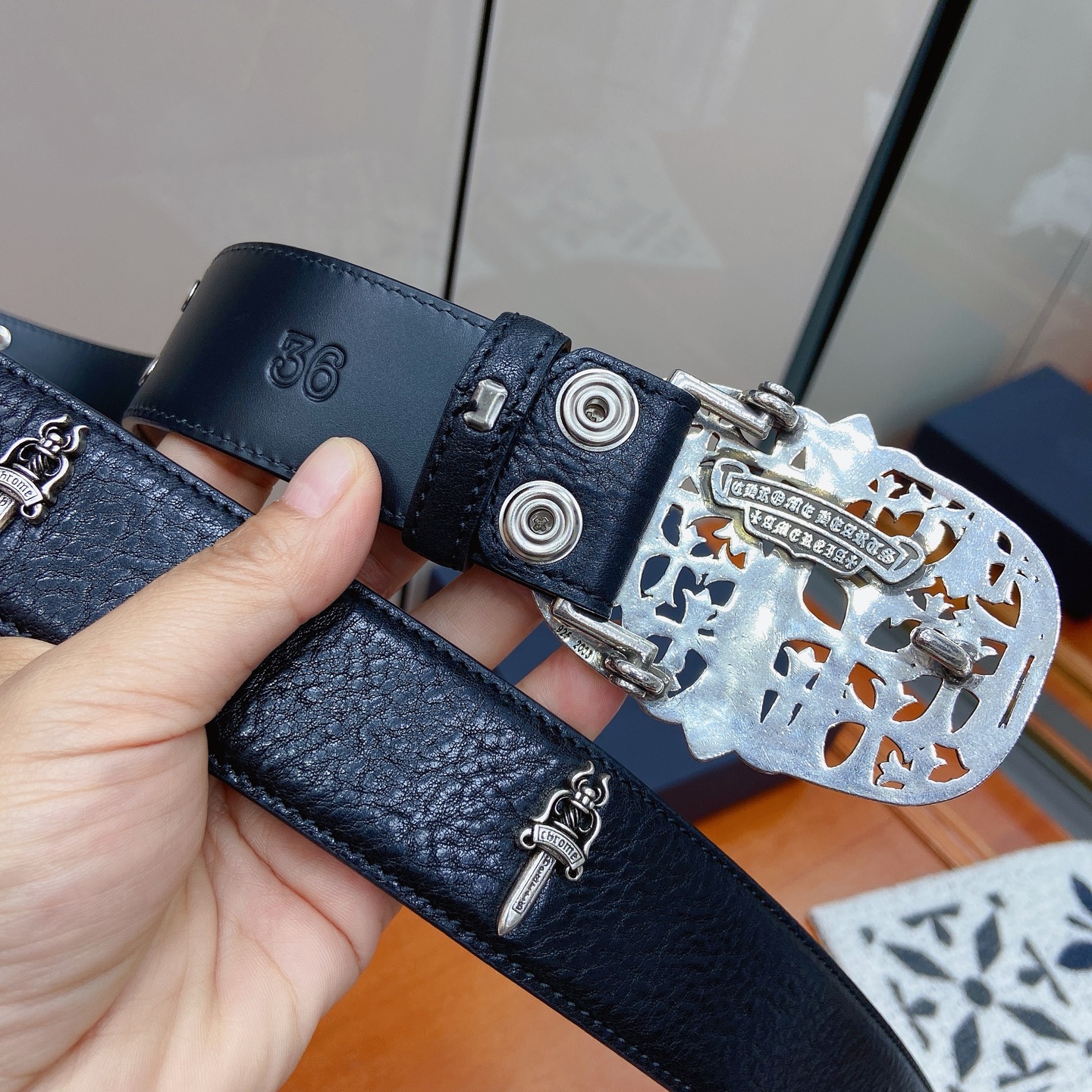 這款皮帶是AAAAA 1:1 質量(非常棒). 使用了和原版一模一樣的材料. 商標部分也保持了和鉻心/Chrome Hearts一樣. 圖片拍攝是實物皮帶拍攝, 您所收到的實物保證和我們圖片一模一樣.