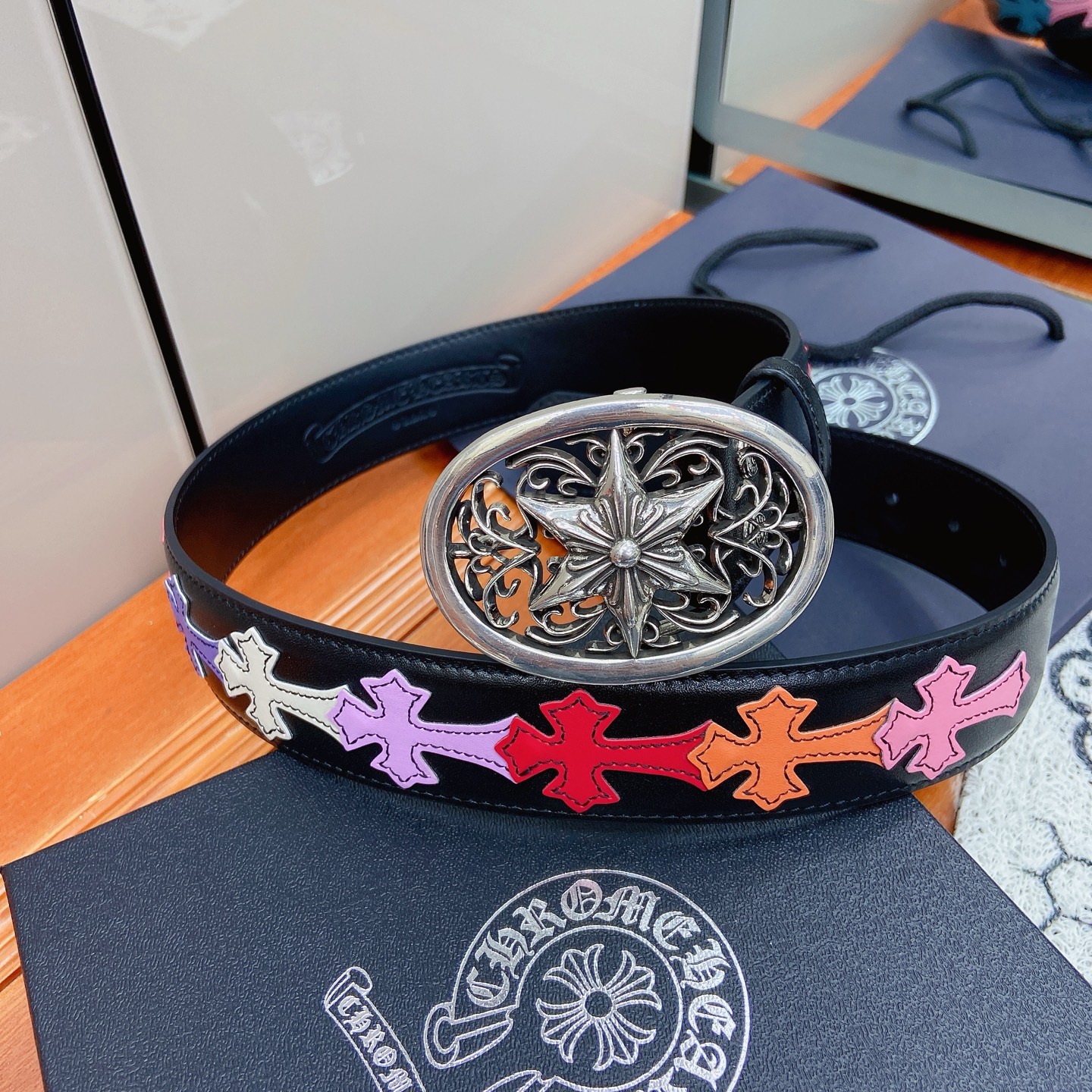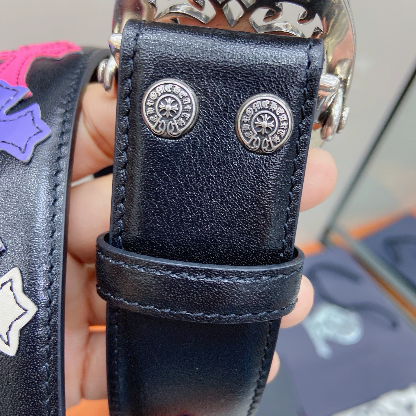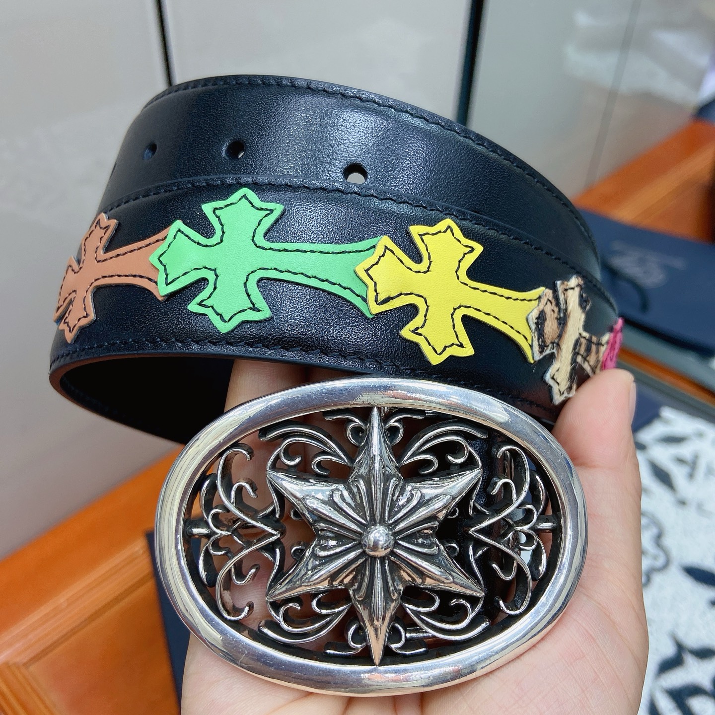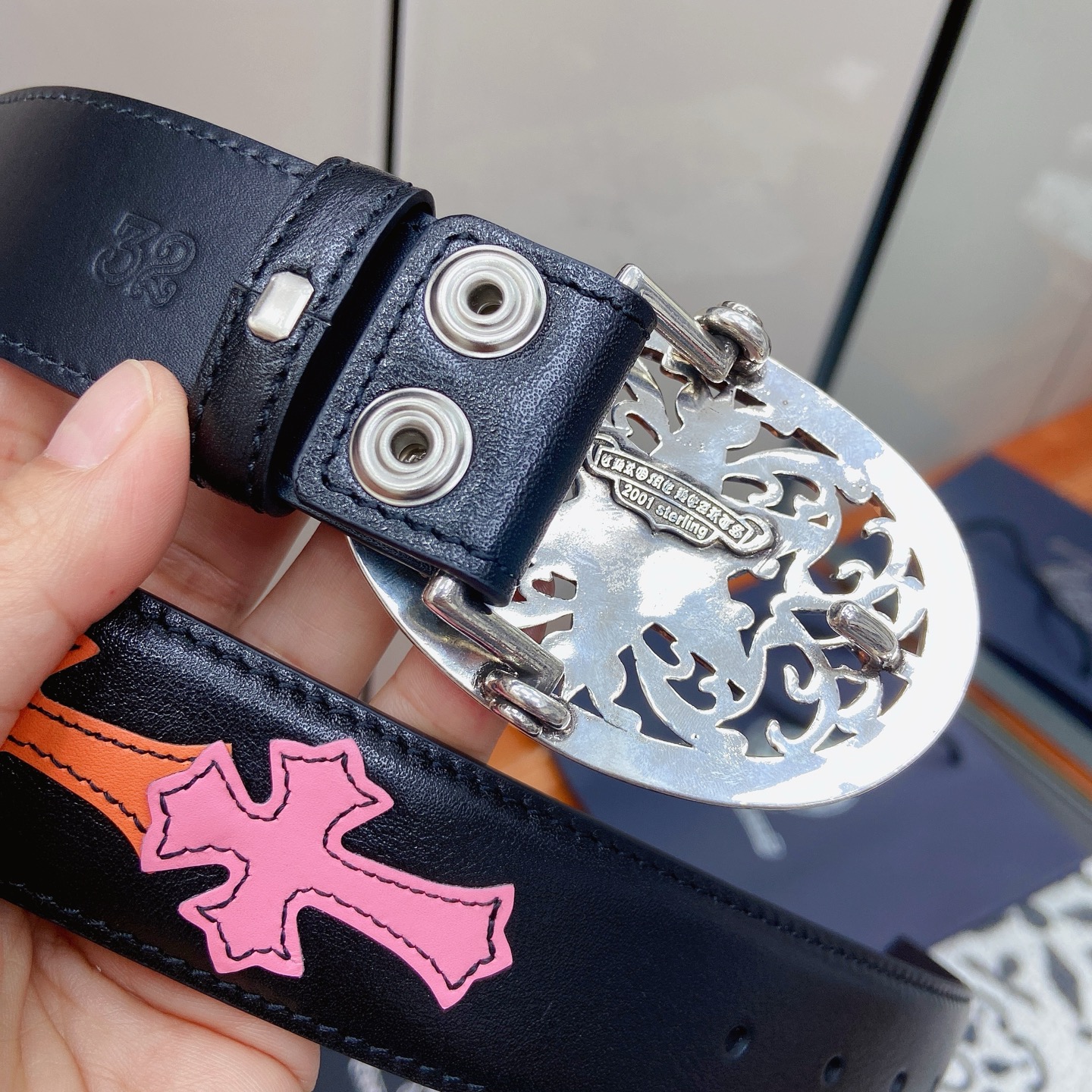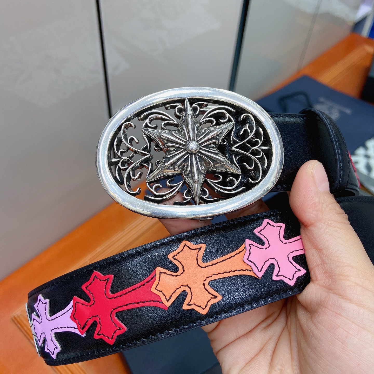 這款皮帶是AAAAA 1:1 質量(非常棒). 使用了和原版一模一樣的材料. 商標部分也保持了和鉻心/Chrome Hearts一樣. 圖片拍攝是實物皮帶拍攝, 您所收到的實物保證和我們圖片一模一樣.