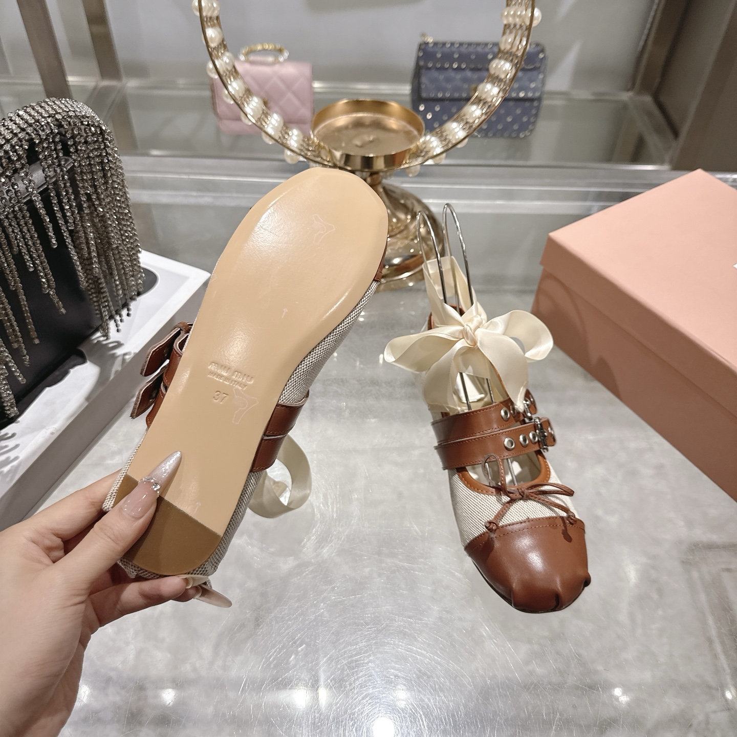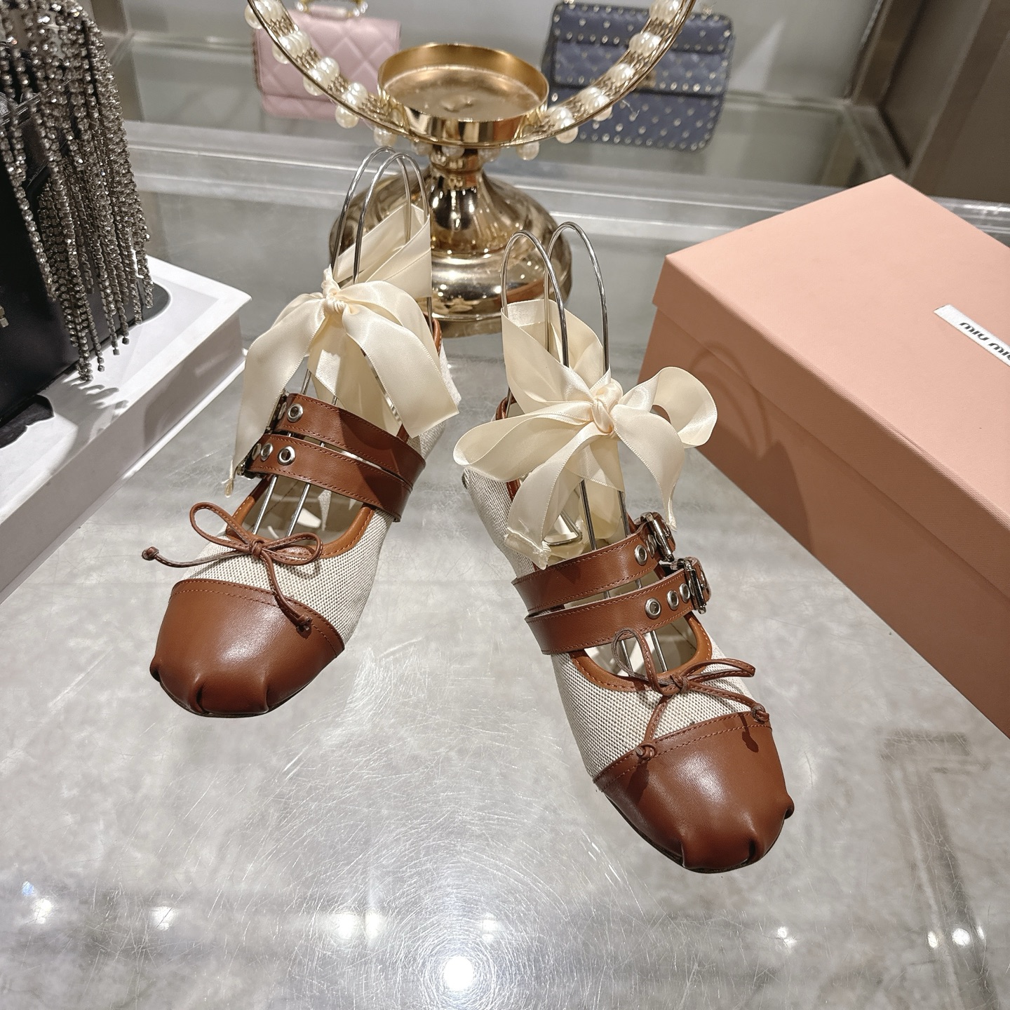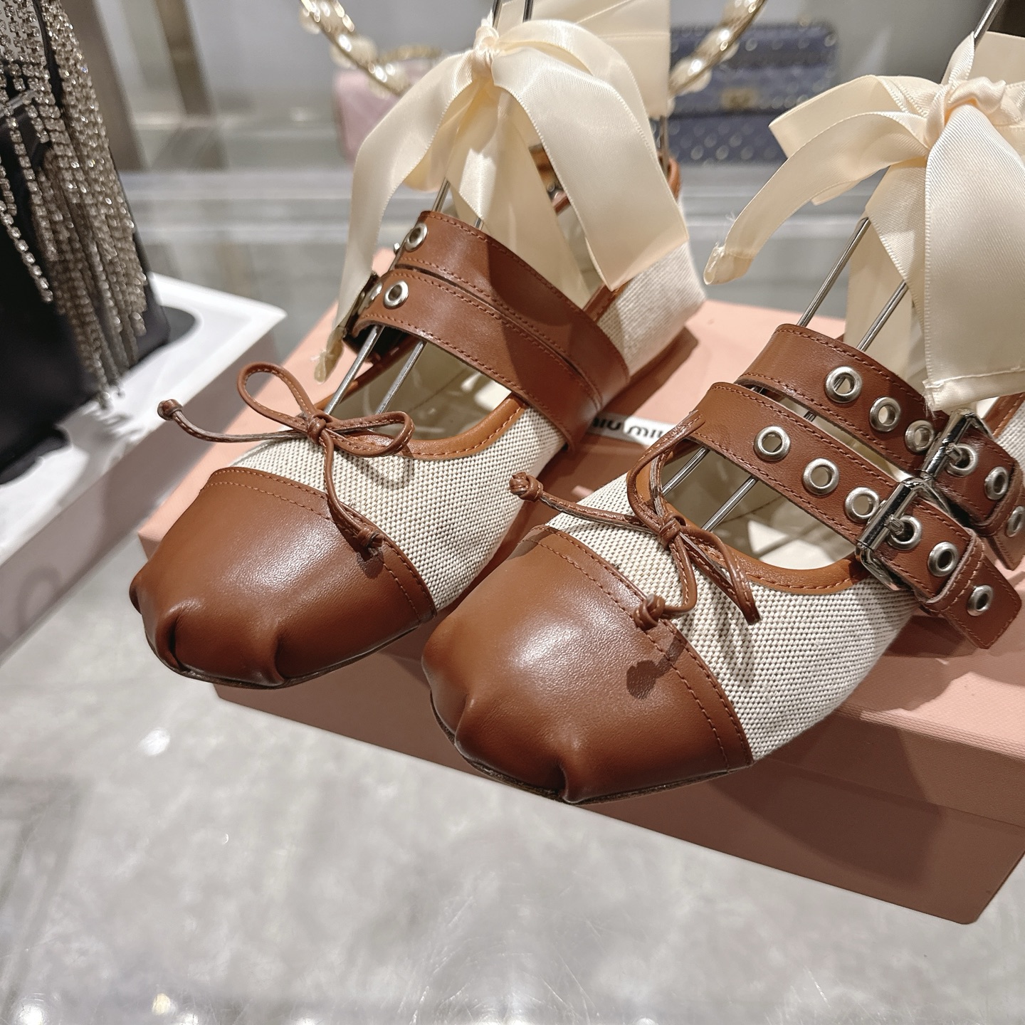 這款鞋子是AAAAA 1:1 質量(非常棒). 使用了和原版一模一樣的材料. 商標部分也保持了和繆繆/Miu Miu一樣. 圖片拍攝是實物鞋子拍攝, 您所收到的實物保證和我們圖片一模一樣.