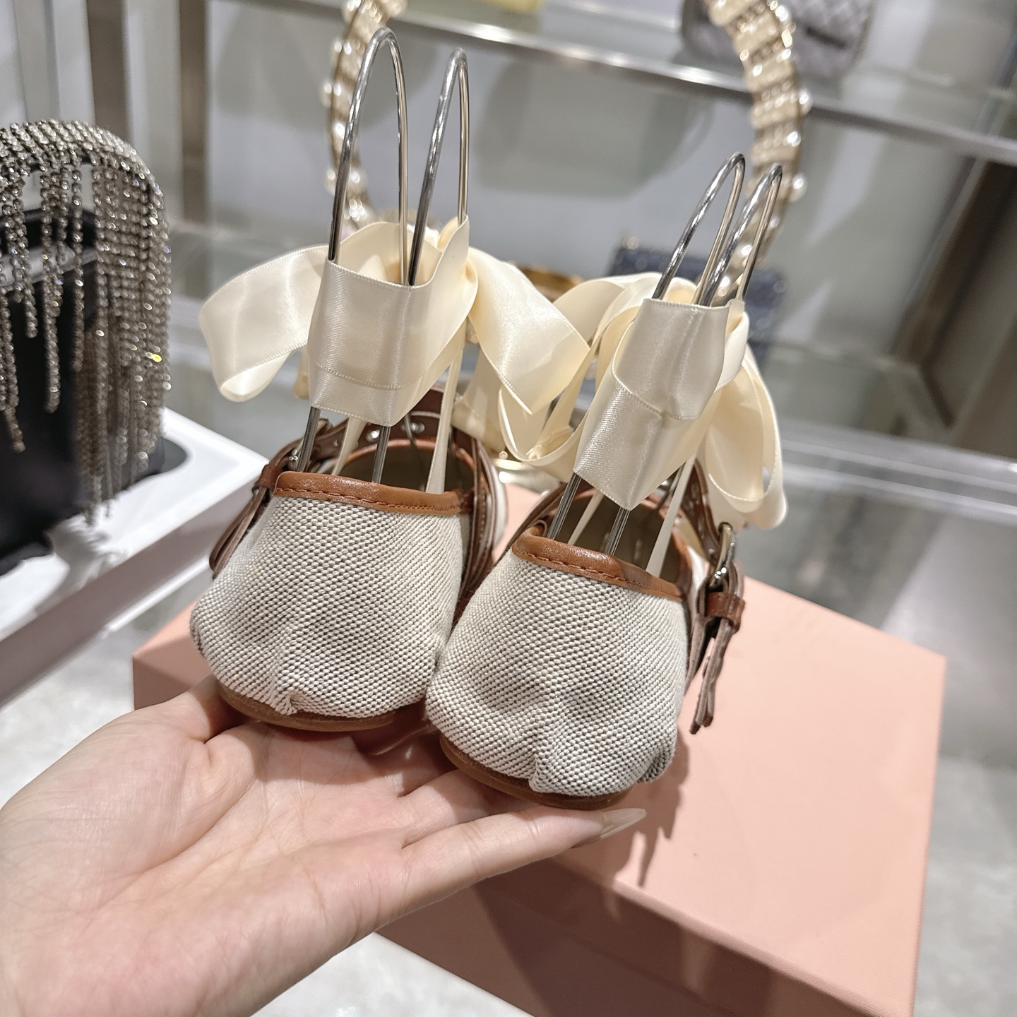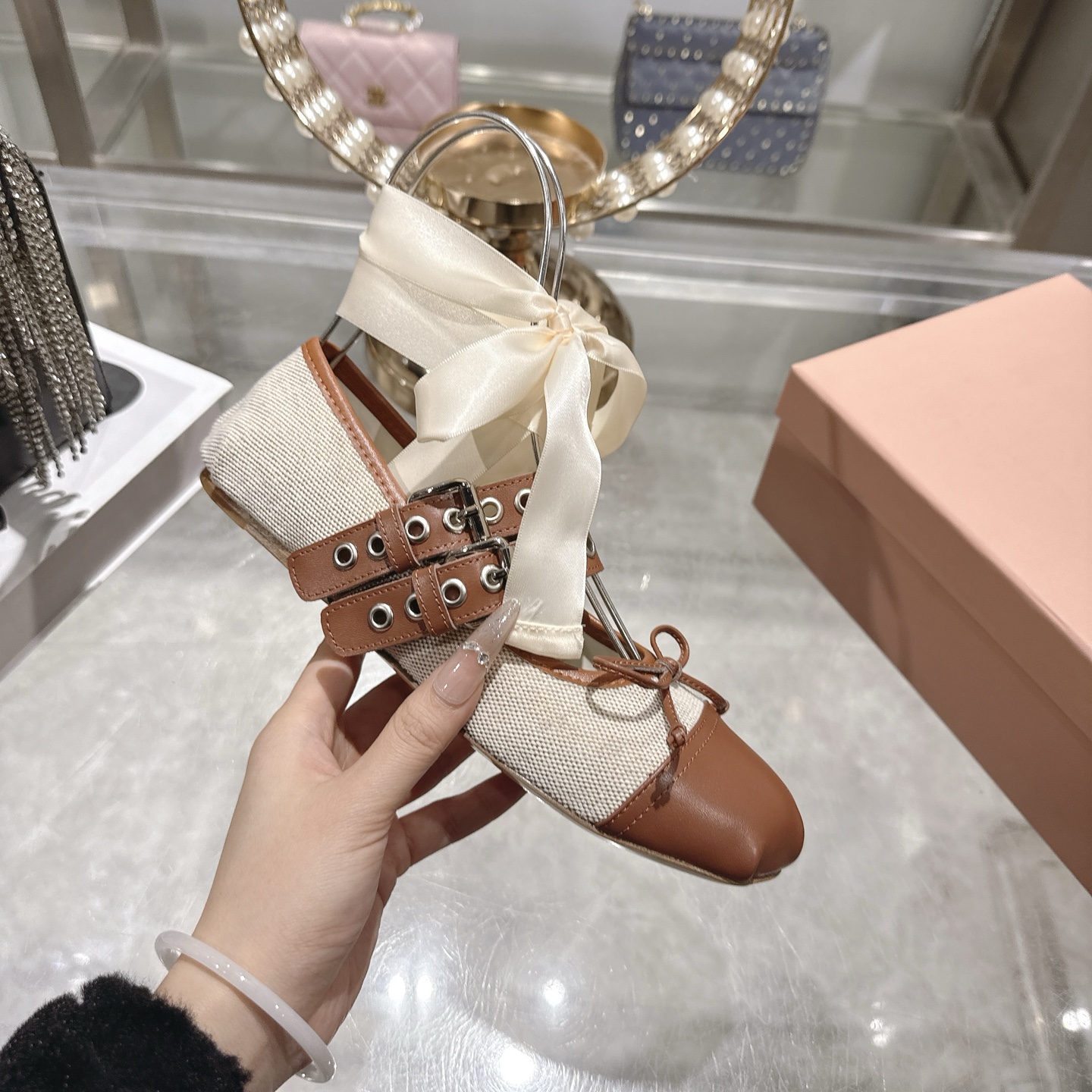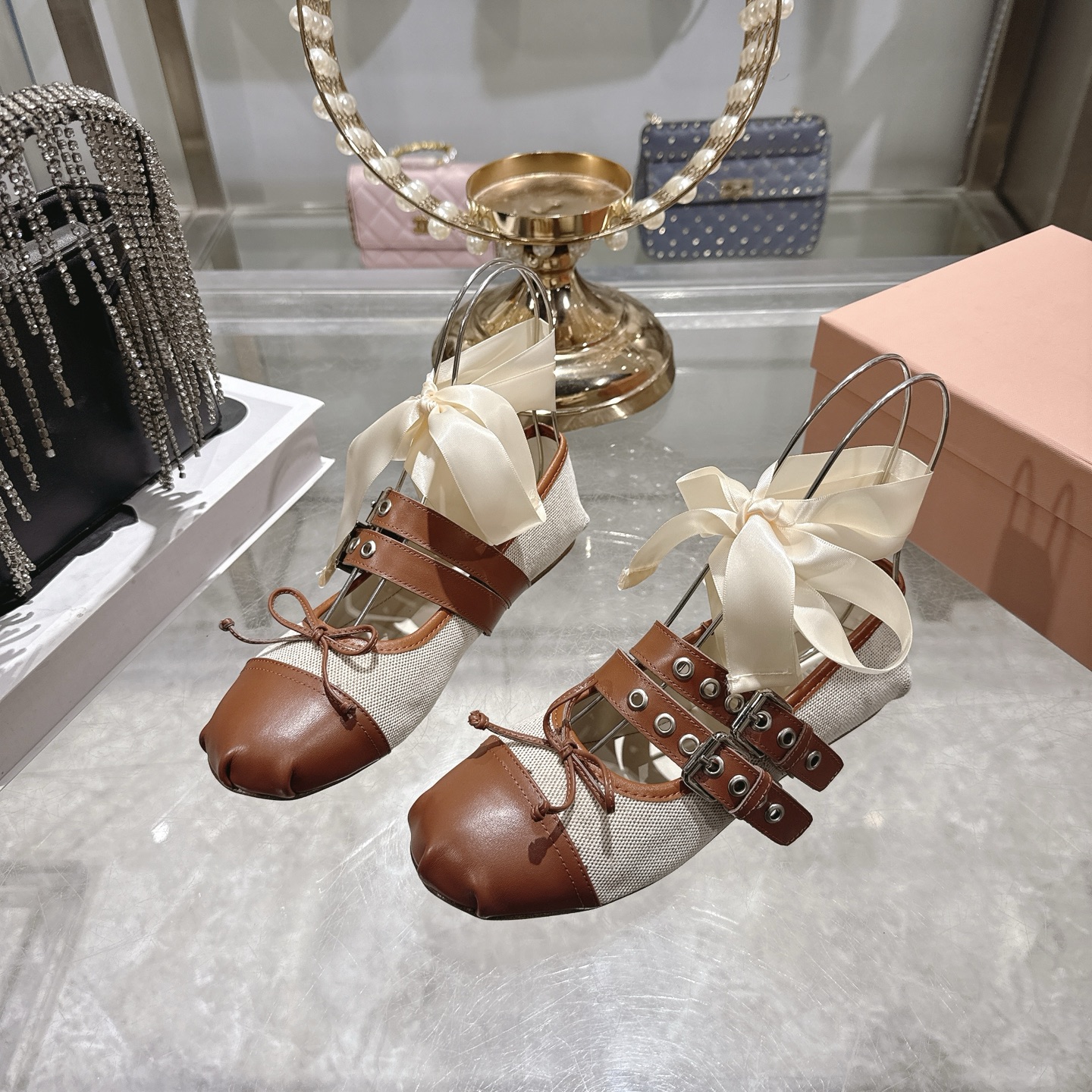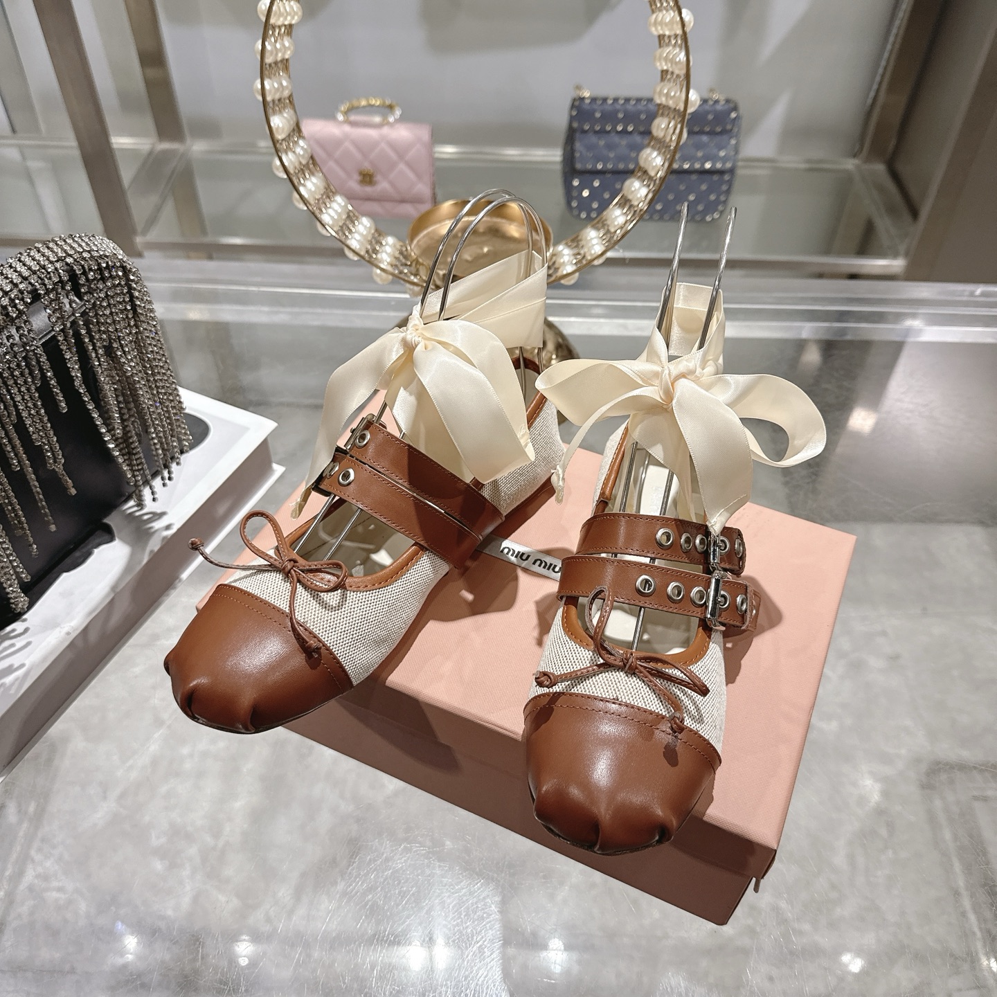 這款鞋子是AAAAA 1:1 質量(非常棒). 使用了和原版一模一樣的材料. 商標部分也保持了和繆繆/Miu Miu一樣. 圖片拍攝是實物鞋子拍攝, 您所收到的實物保證和我們圖片一模一樣.