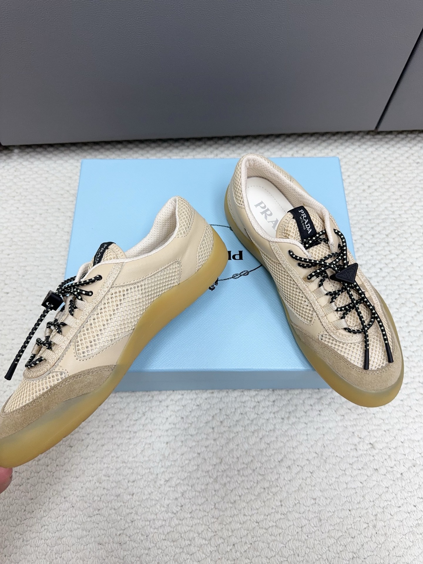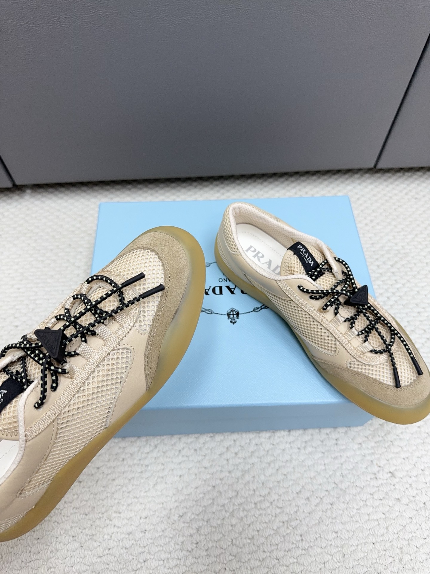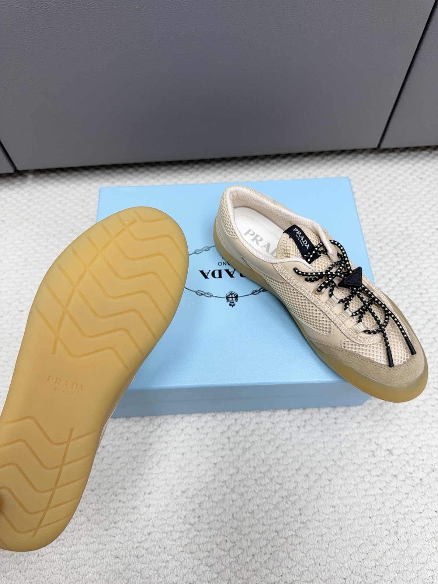 這款鞋子是AAAAA 1:1 質量(非常棒). 使用了和原版一模一樣的材料. 商標部分也保持了和普拉達/Prada一樣. 圖片拍攝是實物鞋子拍攝, 您所收到的實物保證和我們圖片一模一樣.