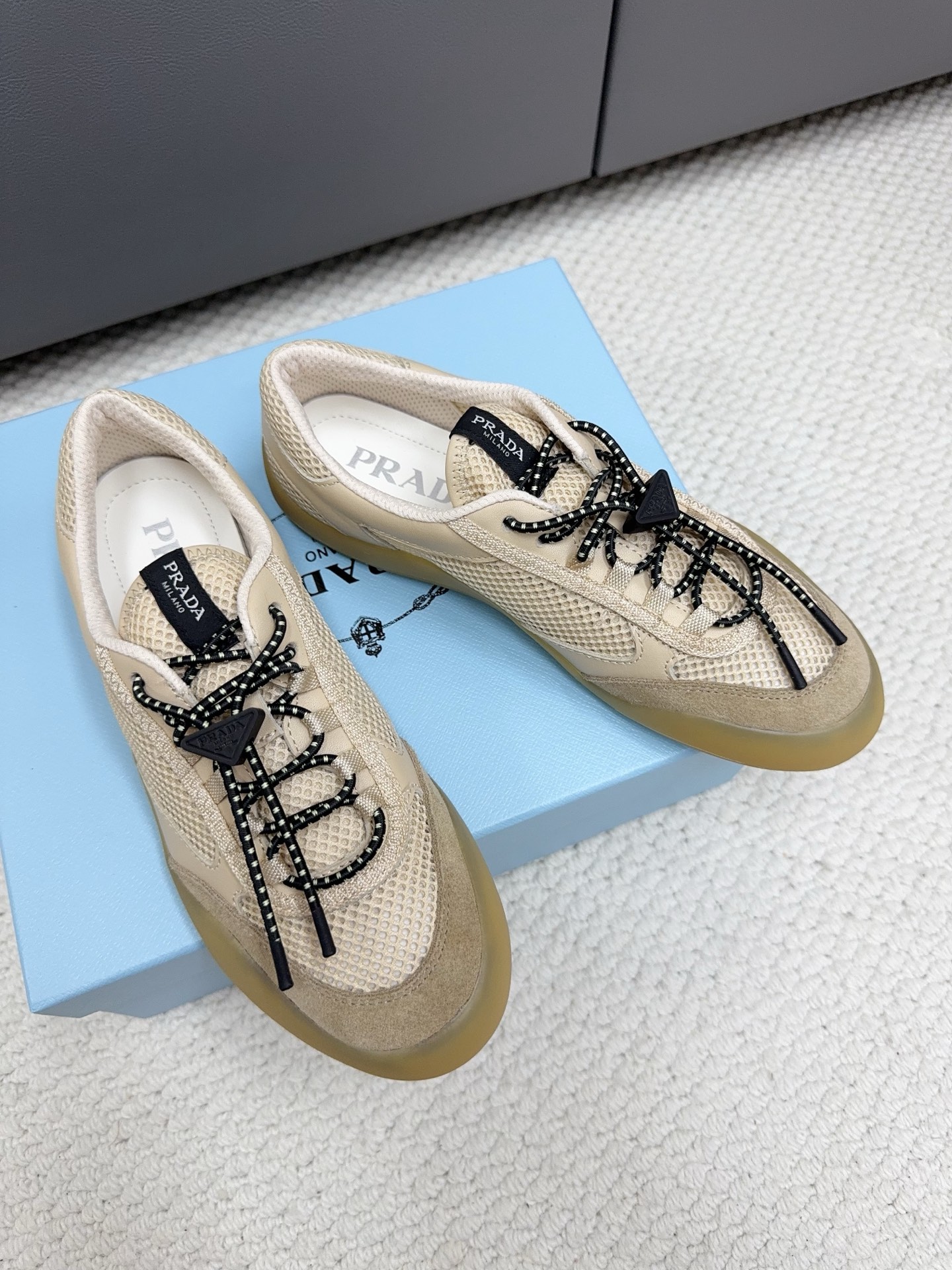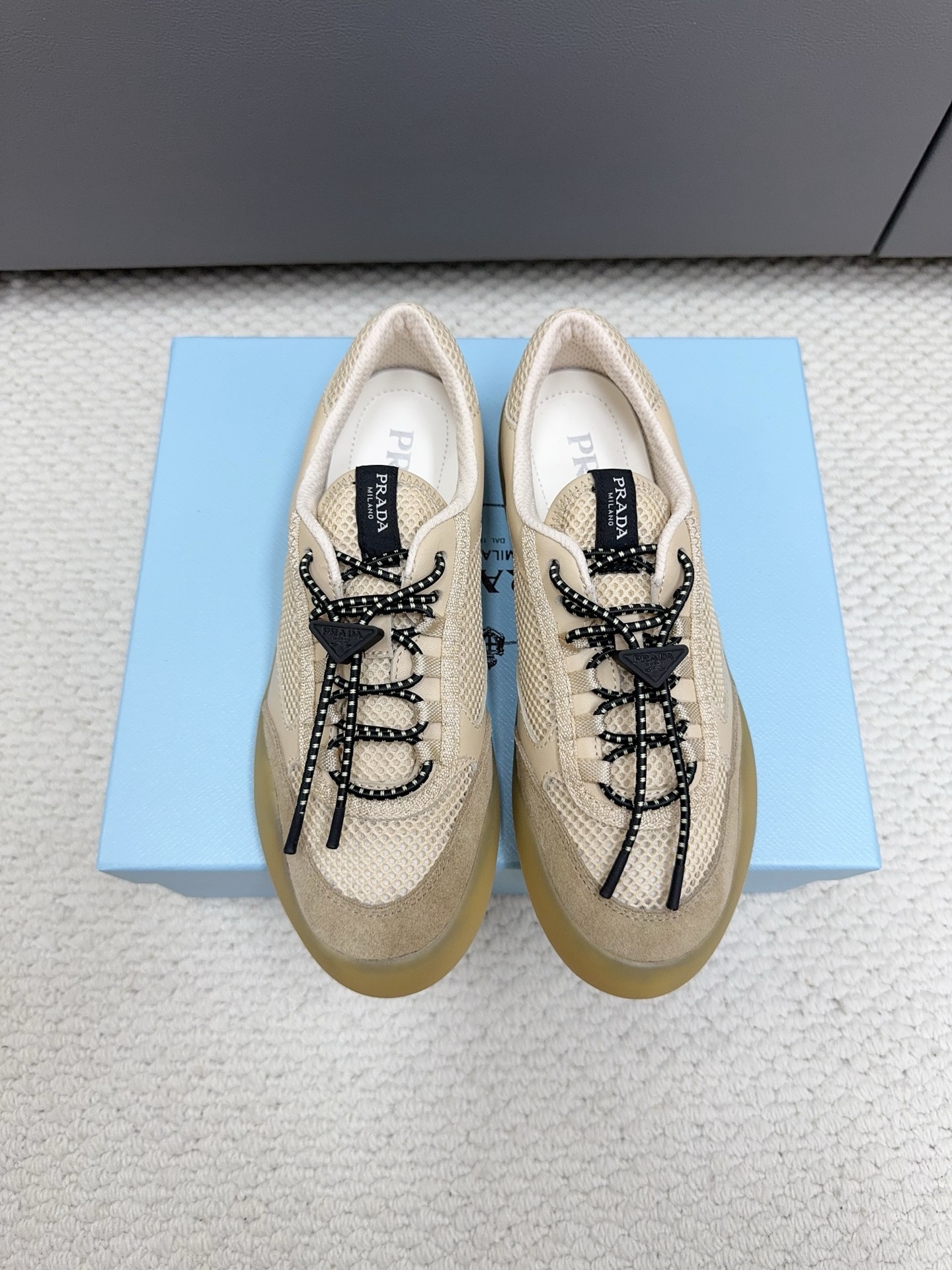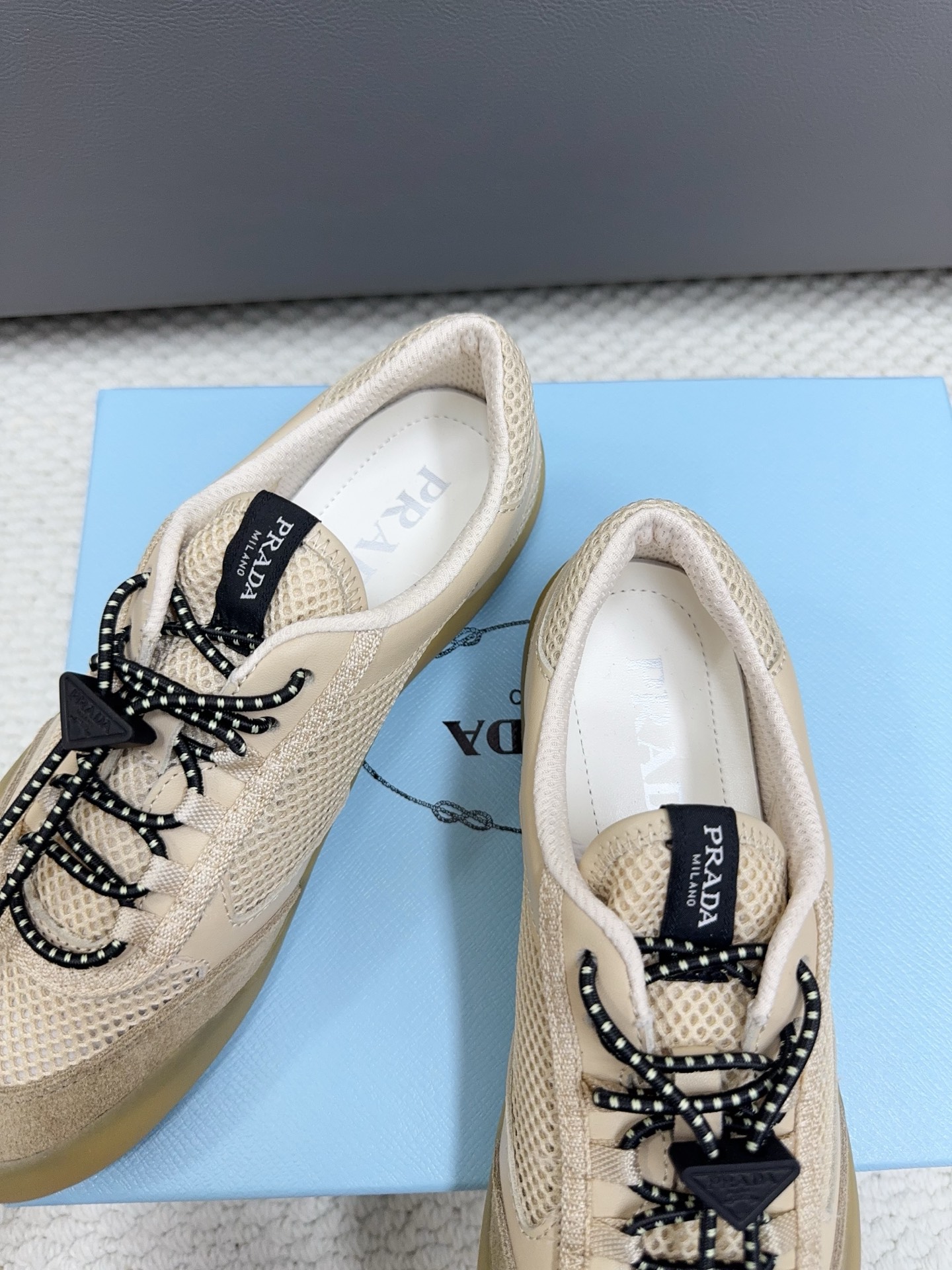這款鞋子是AAAAA 1:1 質量(非常棒). 使用了和原版一模一樣的材料. 商標部分也保持了和普拉達/Prada一樣. 圖片拍攝是實物鞋子拍攝, 您所收到的實物保證和我們圖片一模一樣.
