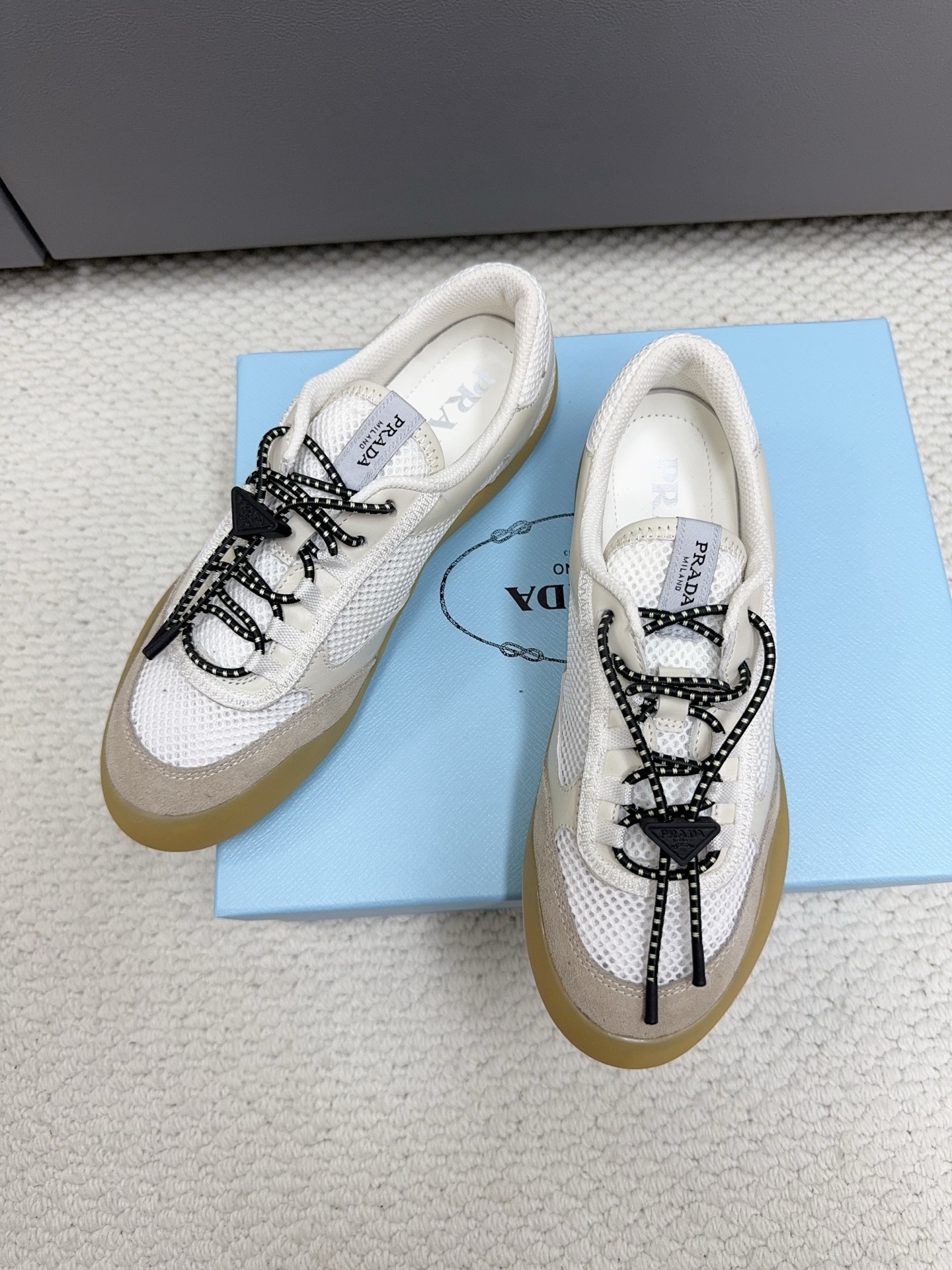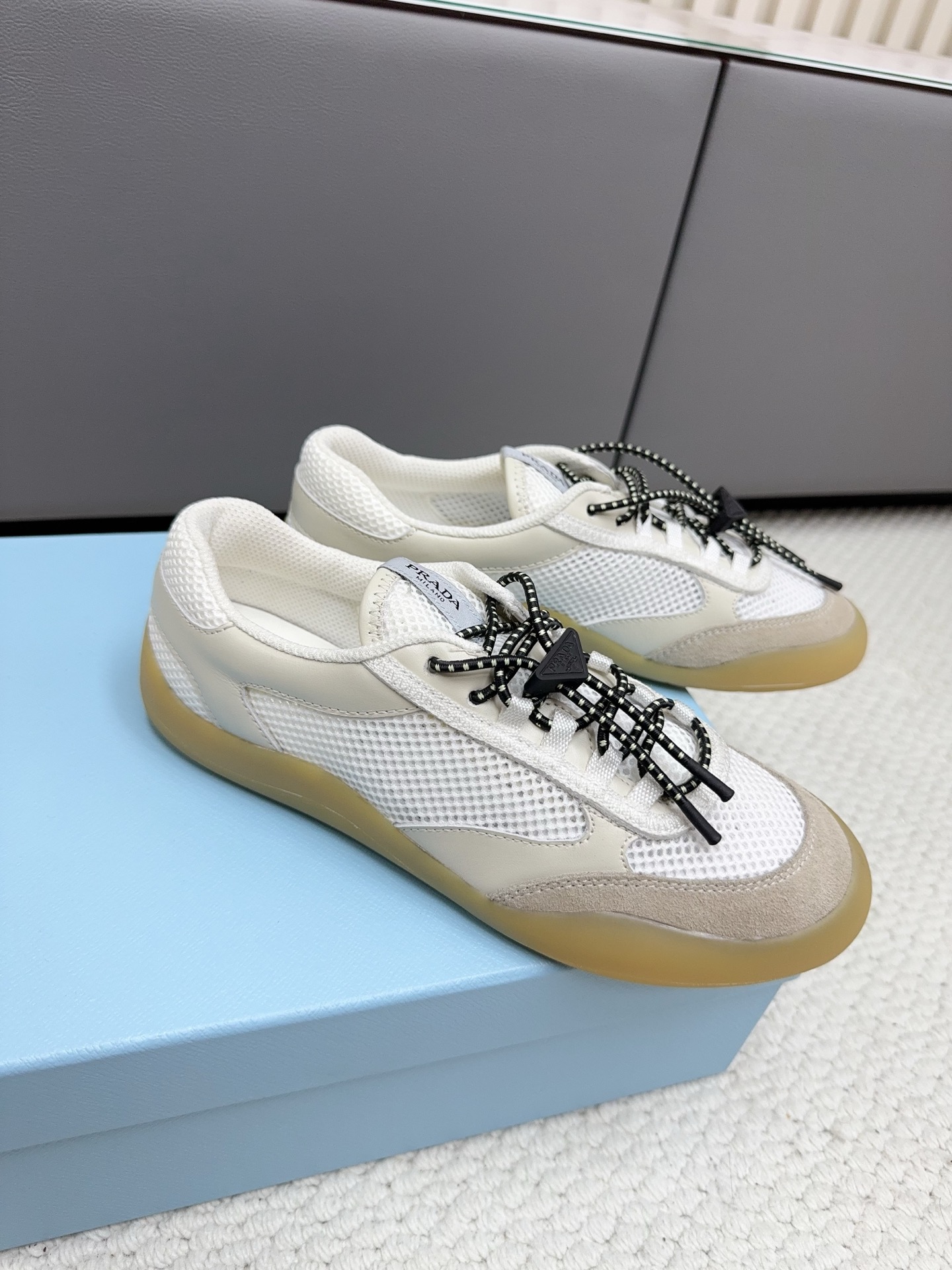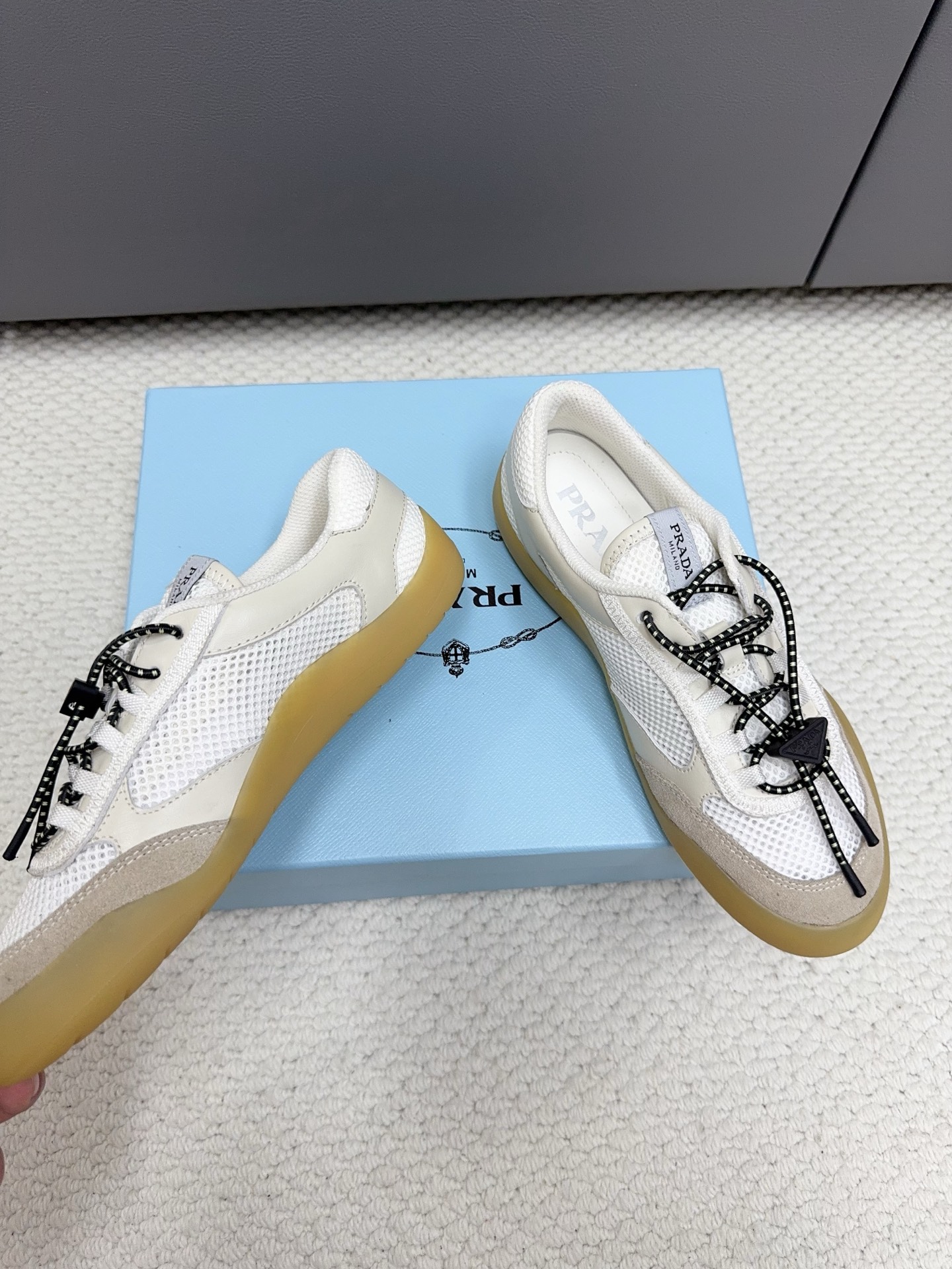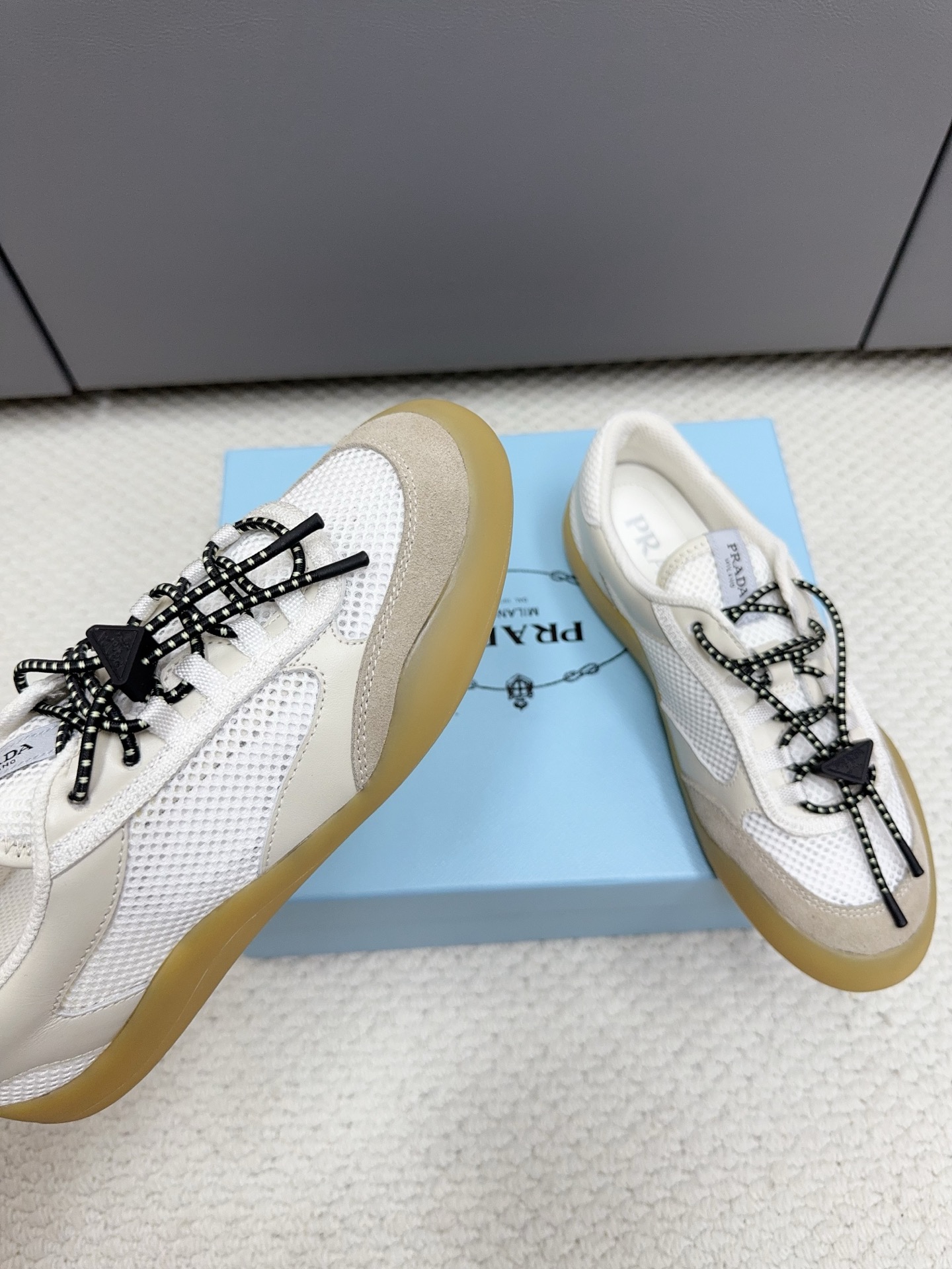 這款鞋子是AAAAA 1:1 質量(非常棒). 使用了和原版一模一樣的材料. 商標部分也保持了和普拉達/Prada一樣. 圖片拍攝是實物鞋子拍攝, 您所收到的實物保證和我們圖片一模一樣.