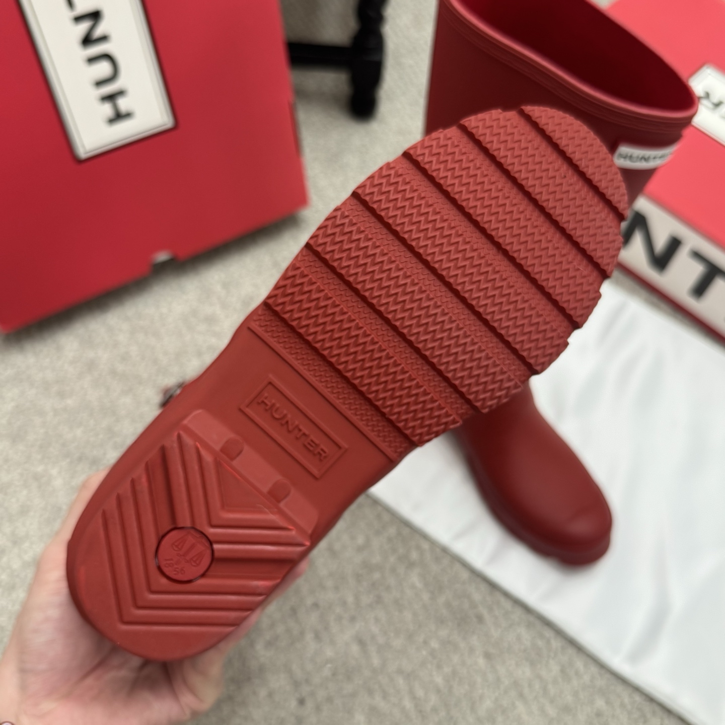 這款鞋子是AAAAA 1:1 質量(非常棒). 使用了和原版一模一樣的材料. 商標部分也保持了和Hunter一樣. 圖片拍攝是實物鞋子拍攝, 您所收到的實物保證和我們圖片一模一樣.