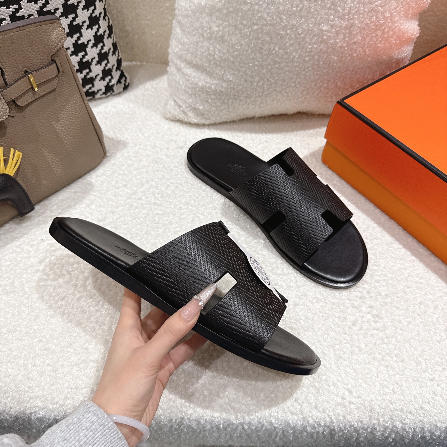 這款鞋子是AAAAA 1:1 質量(非常棒). 使用了和原版一模一樣的材料. 商標部分也保持了和愛馬仕/Hermes一樣. 圖片拍攝是實物鞋子拍攝, 您所收到的實物保證和我們圖片一模一樣.