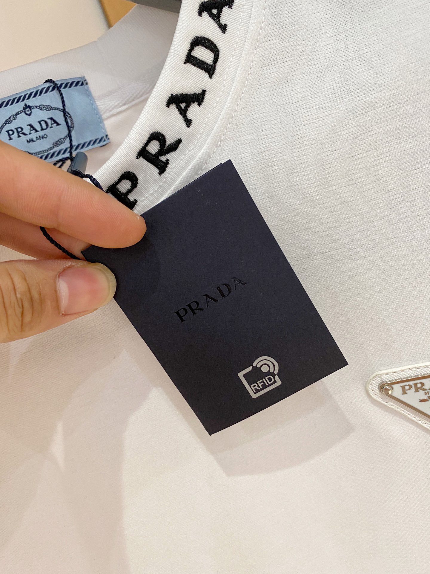 這款衣服是AAAAA 1:1 質量(非常棒). 使用了和原版一模一樣的材料. 商標部分也保持了和普拉達/Prada一樣. 圖片拍攝是實物衣服拍攝, 您所收到的實物保證和我們圖片一模一樣.