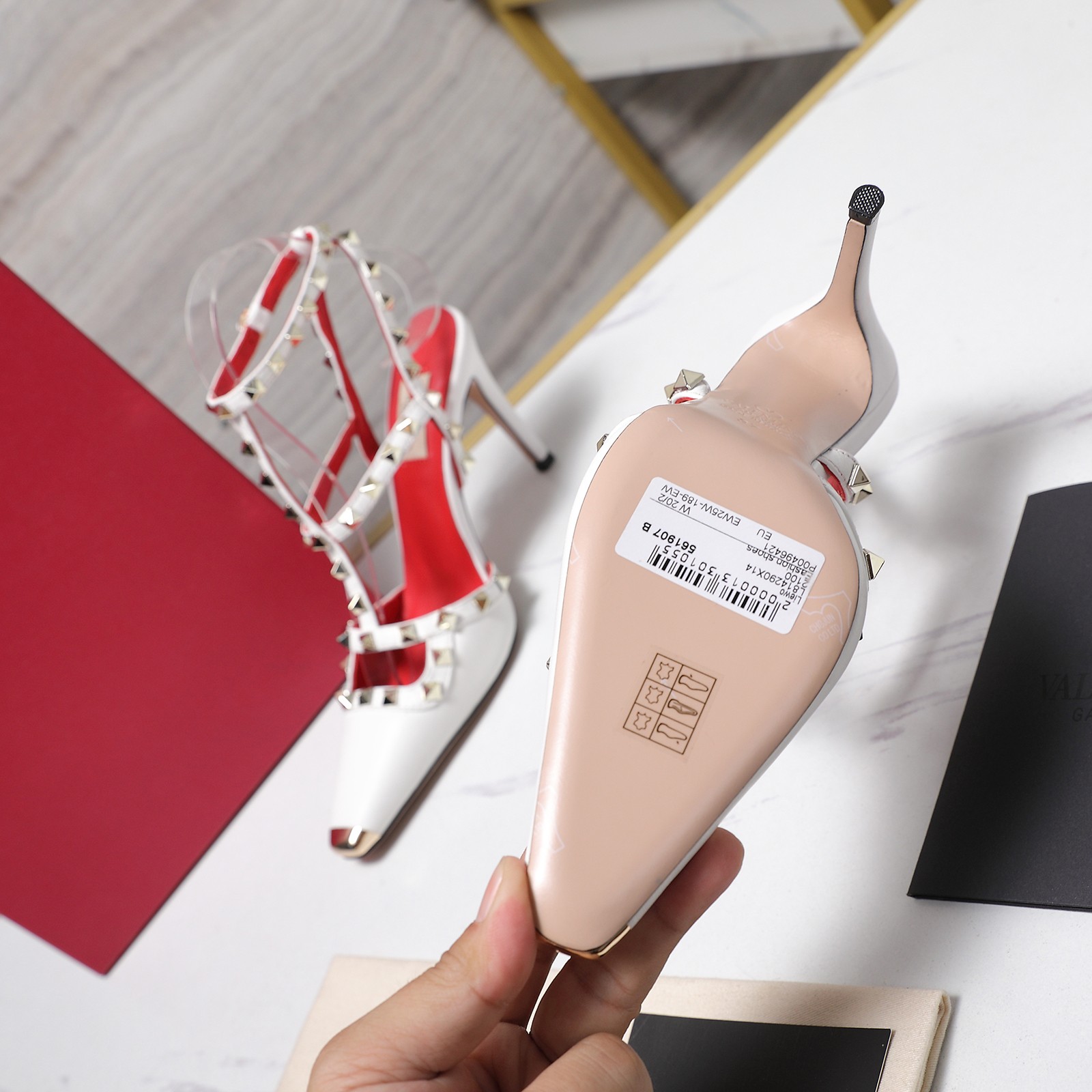 這款鞋子是AAAAA 1:1 質量(非常棒). 使用了和原版一模一樣的材料. 商標部分也保持了和瓦倫蒂諾/Valentino一樣. 圖片拍攝是實物鞋子拍攝, 您所收到的實物保證和我們圖片一模一樣.