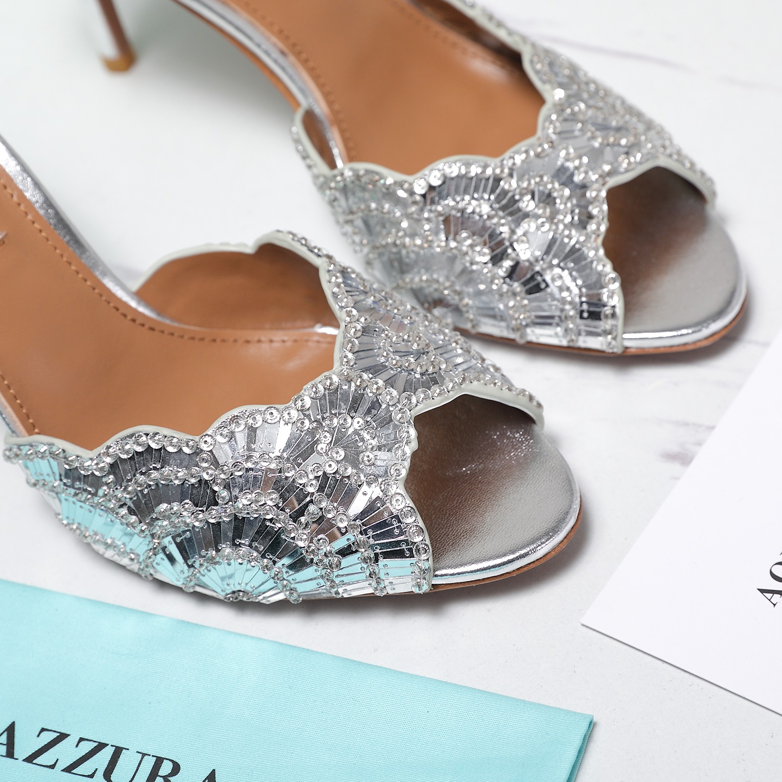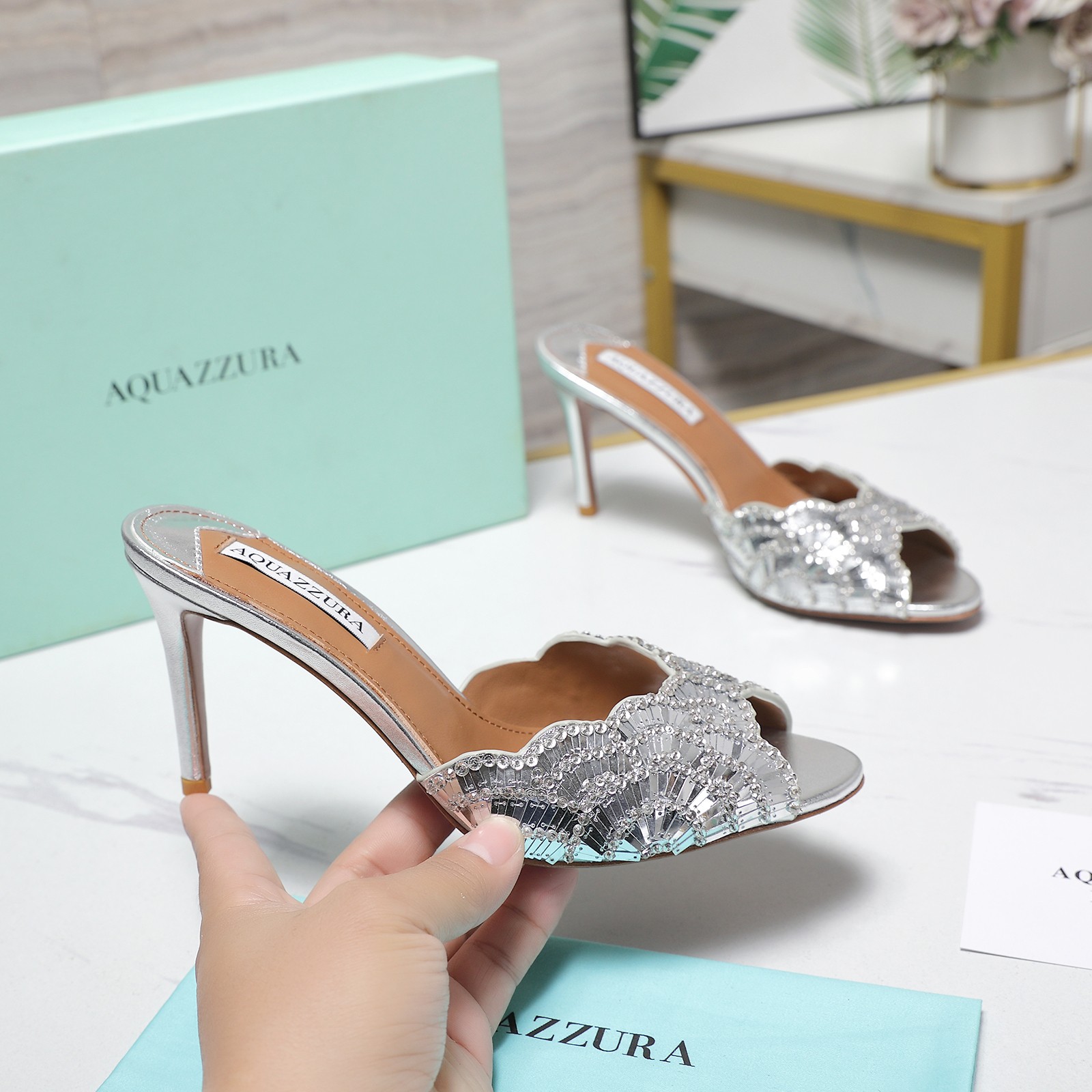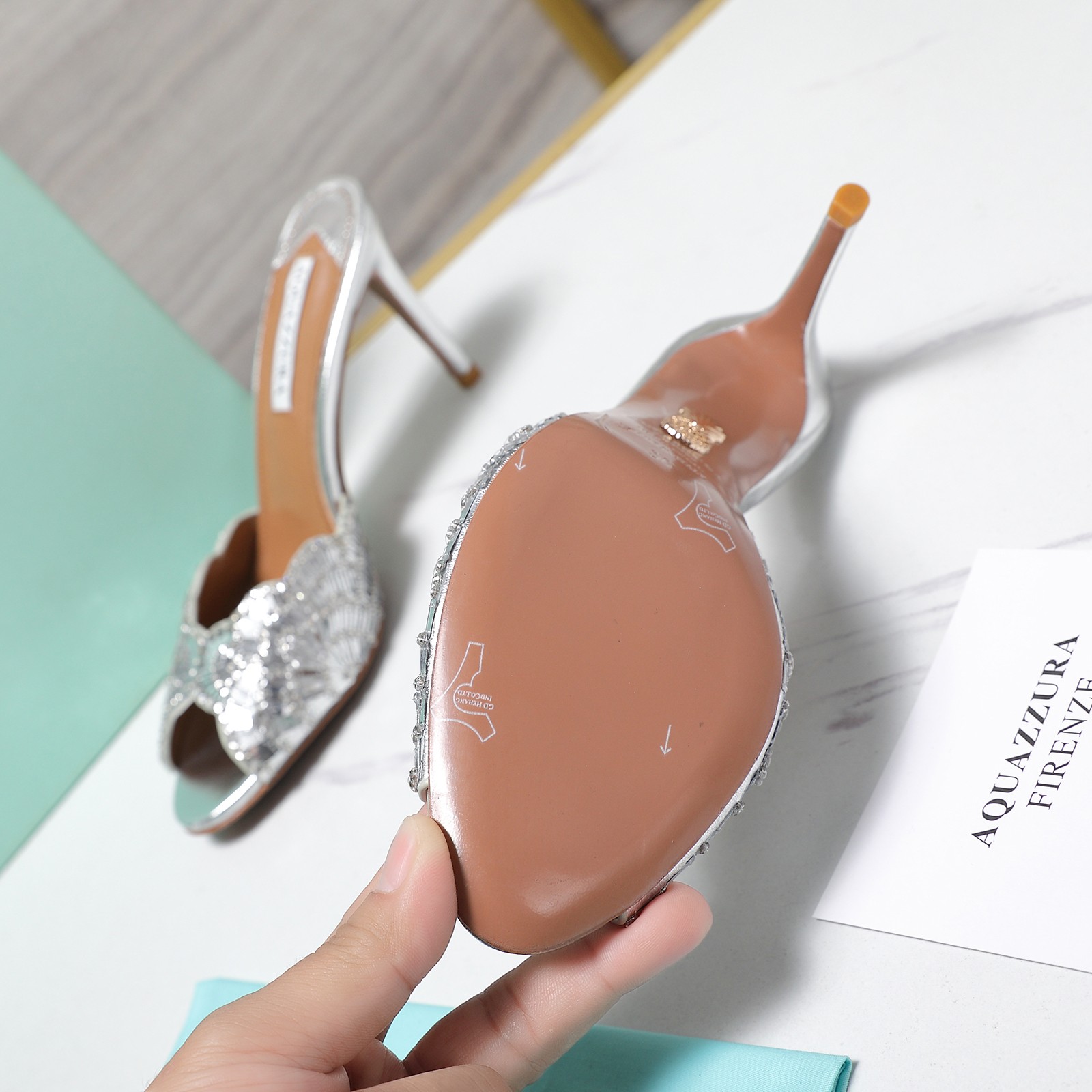 這款鞋子是AAAAA 1:1 質量(非常棒). 使用了和原版一模一樣的材料. 商標部分也保持了和Aquazzura一樣. 圖片拍攝是實物鞋子拍攝, 您所收到的實物保證和我們圖片一模一樣.