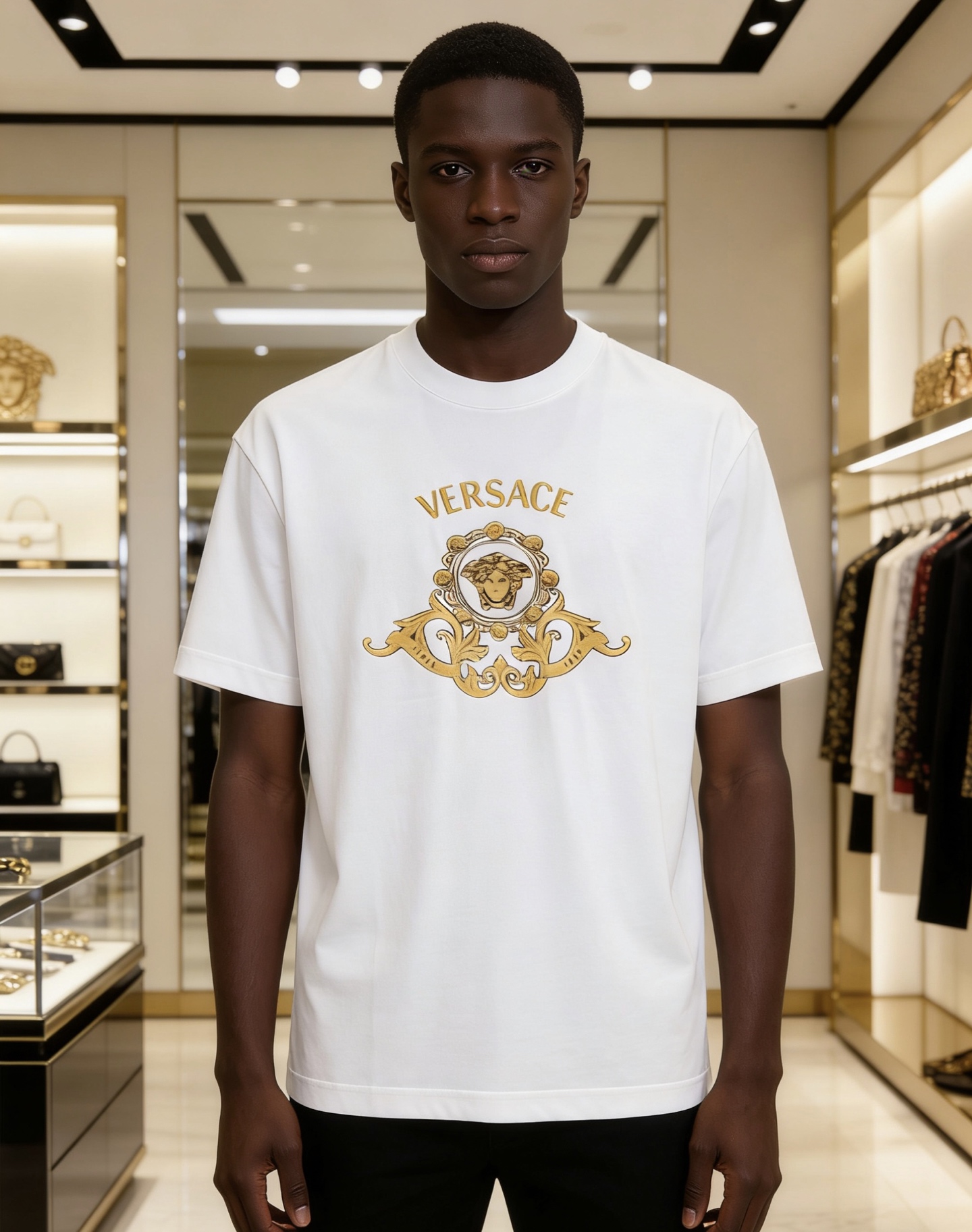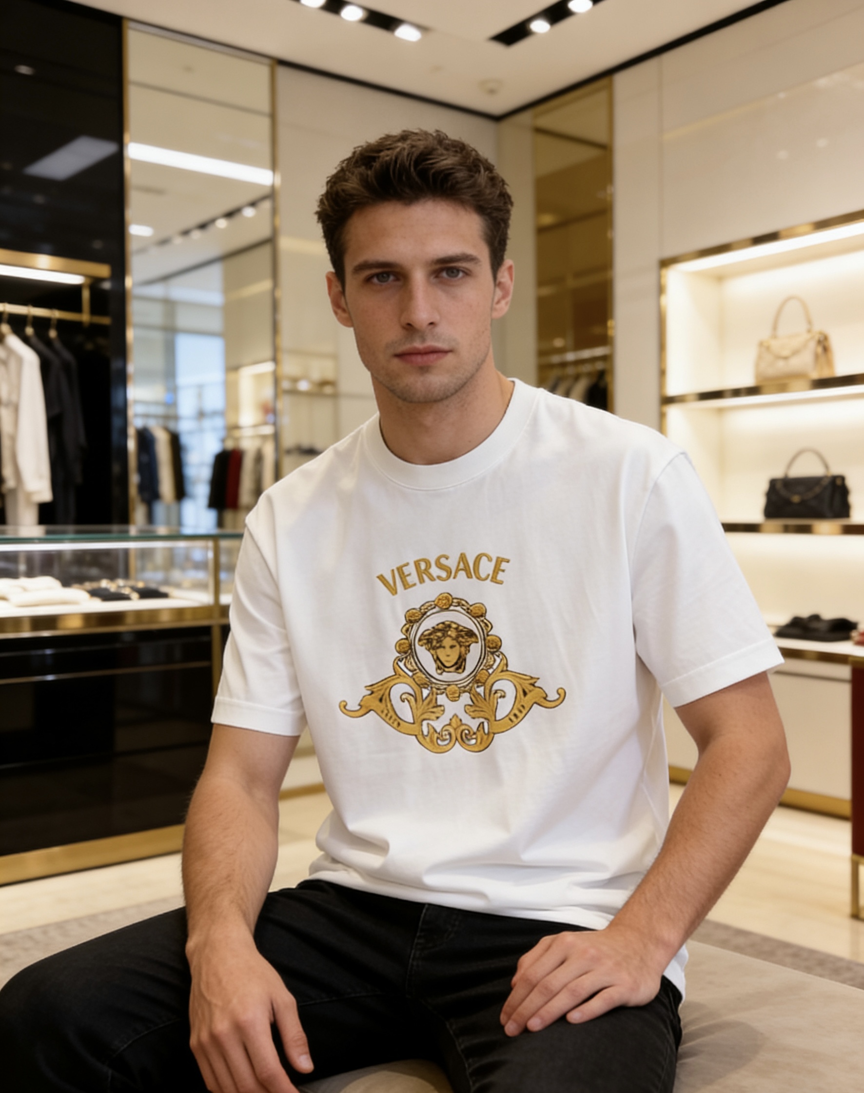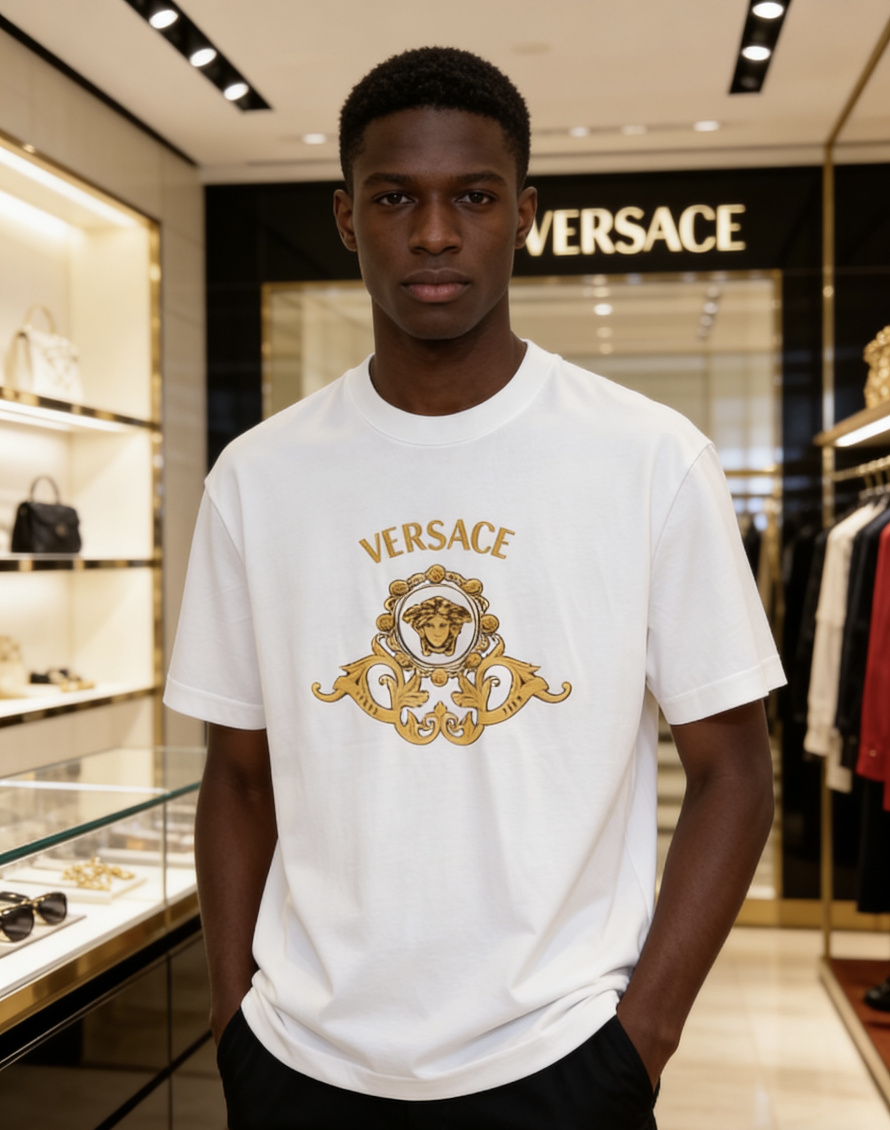 這款衣服是AAAAA 1:1 質量(非常棒). 使用了和原版一模一樣的材料. 商標部分也保持了和范思哲/Versace一樣. 圖片拍攝是實物衣服拍攝, 您所收到的實物保證和我們圖片一模一樣.