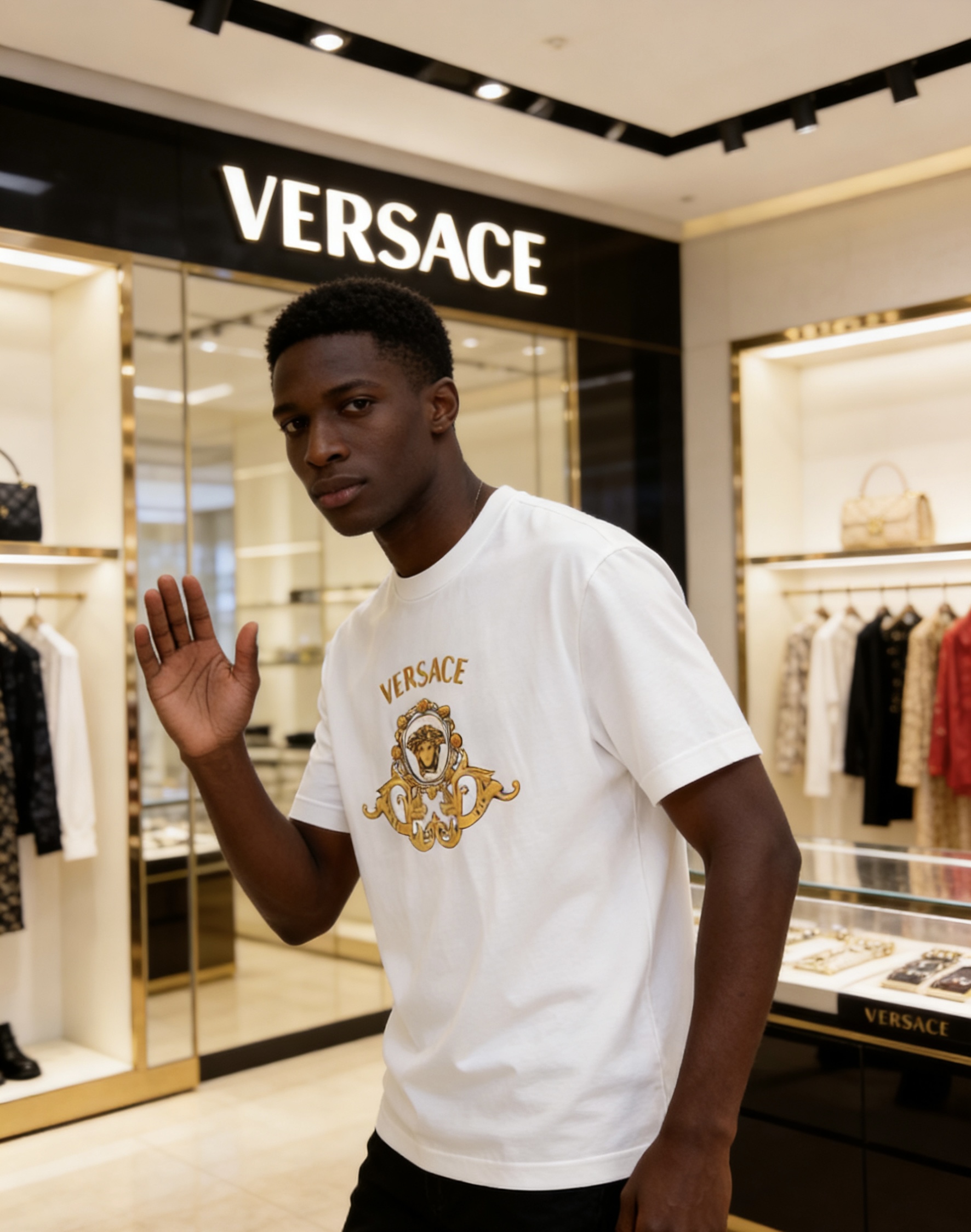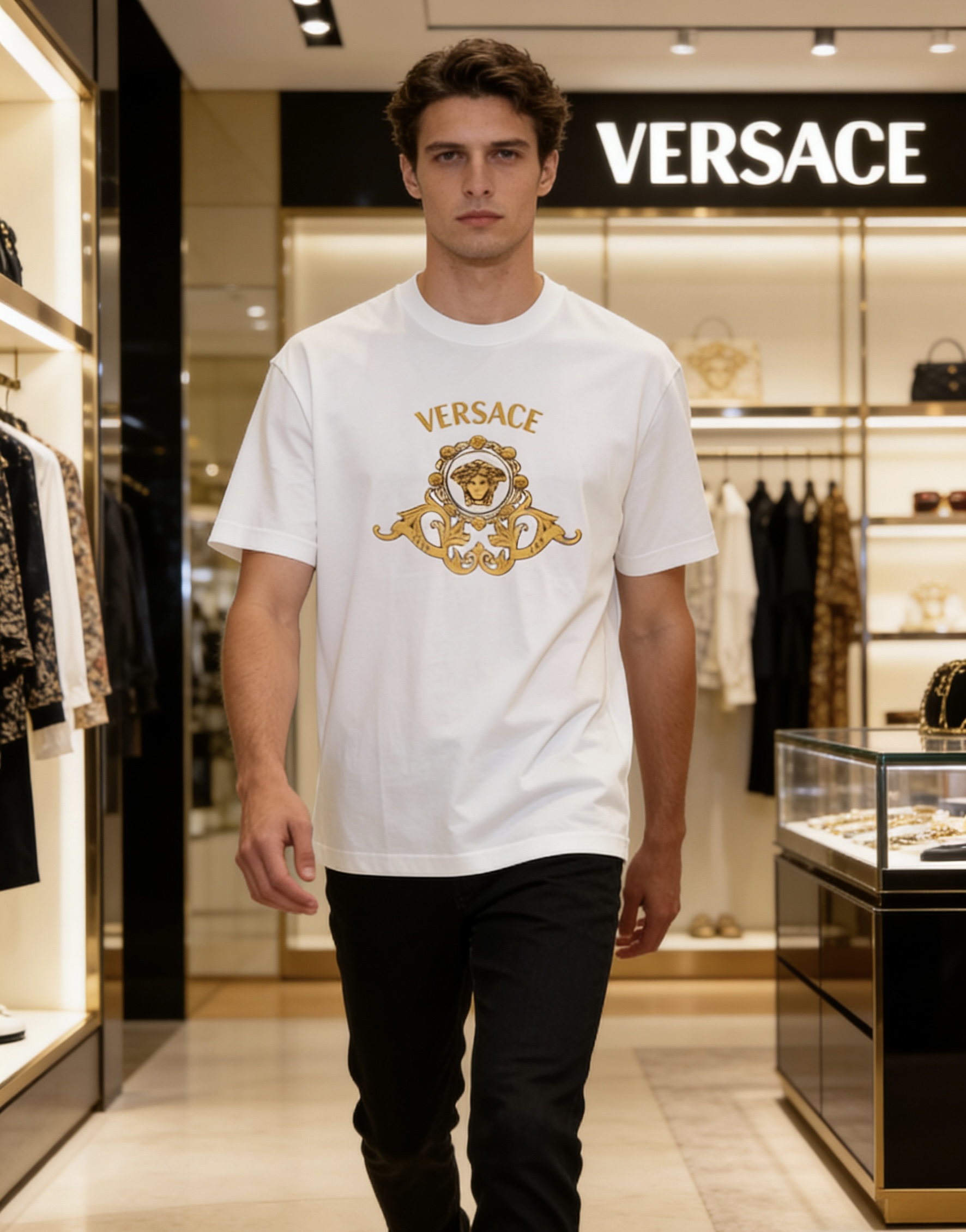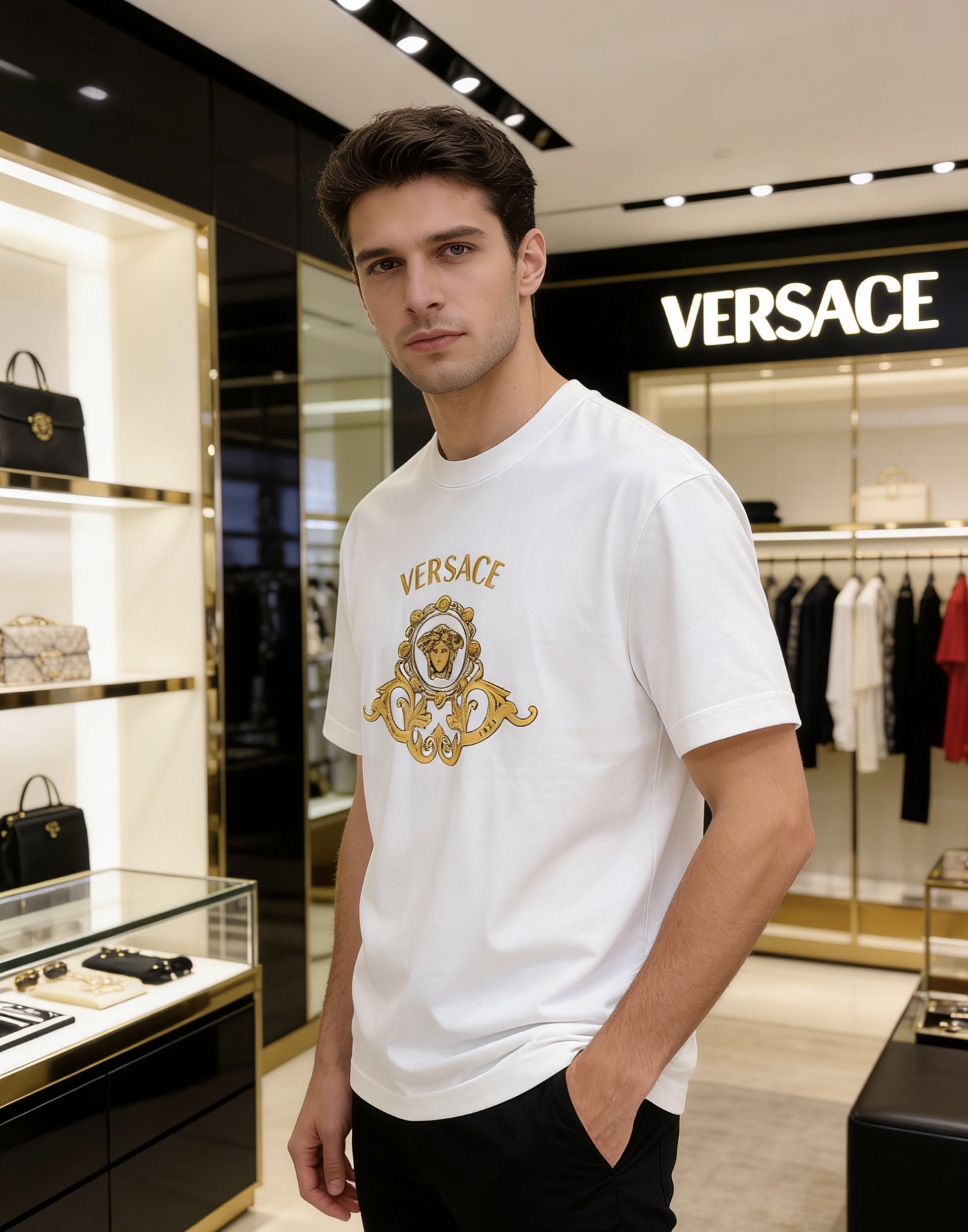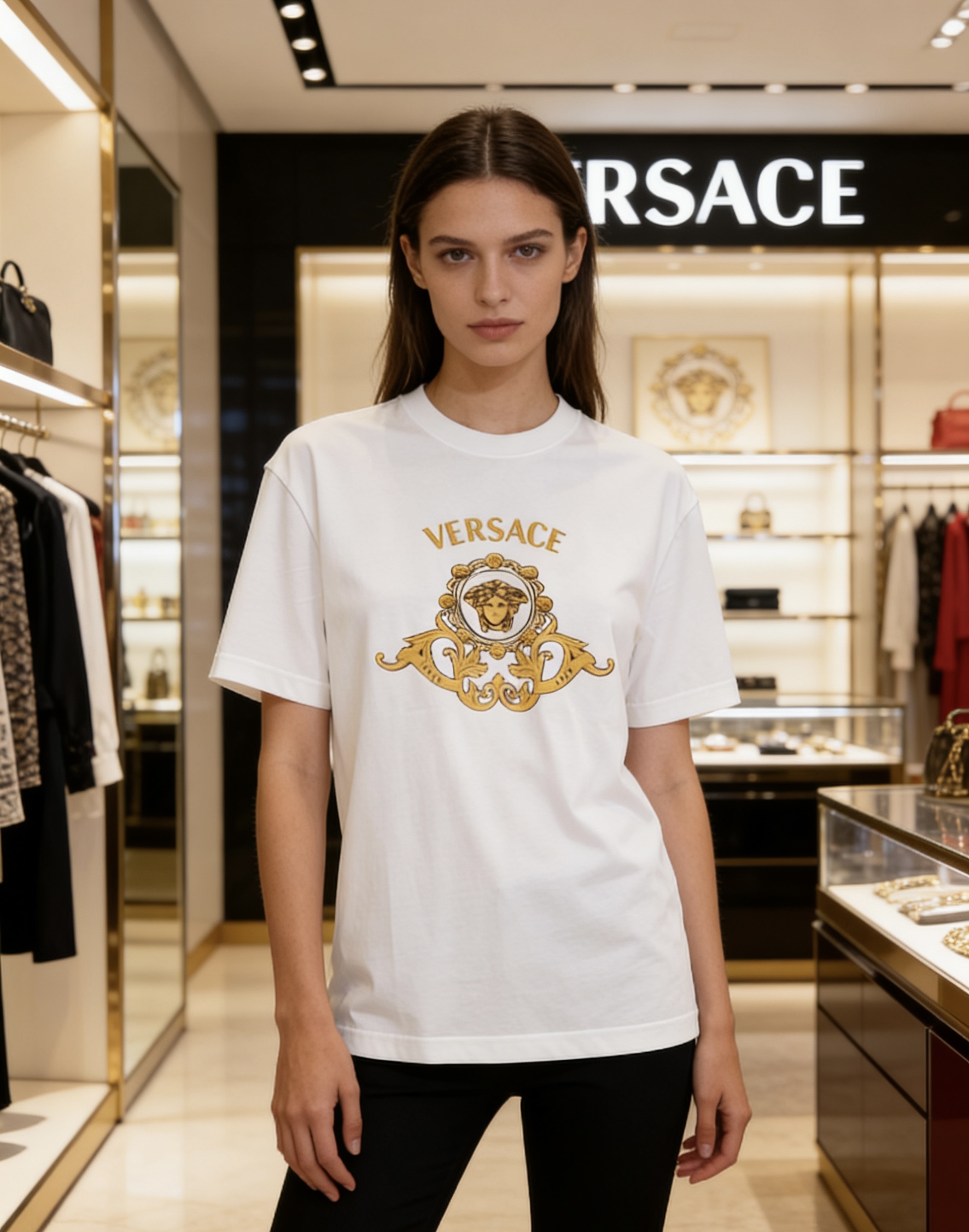 這款衣服是AAAAA 1:1 質量(非常棒). 使用了和原版一模一樣的材料. 商標部分也保持了和范思哲/Versace一樣. 圖片拍攝是實物衣服拍攝, 您所收到的實物保證和我們圖片一模一樣.